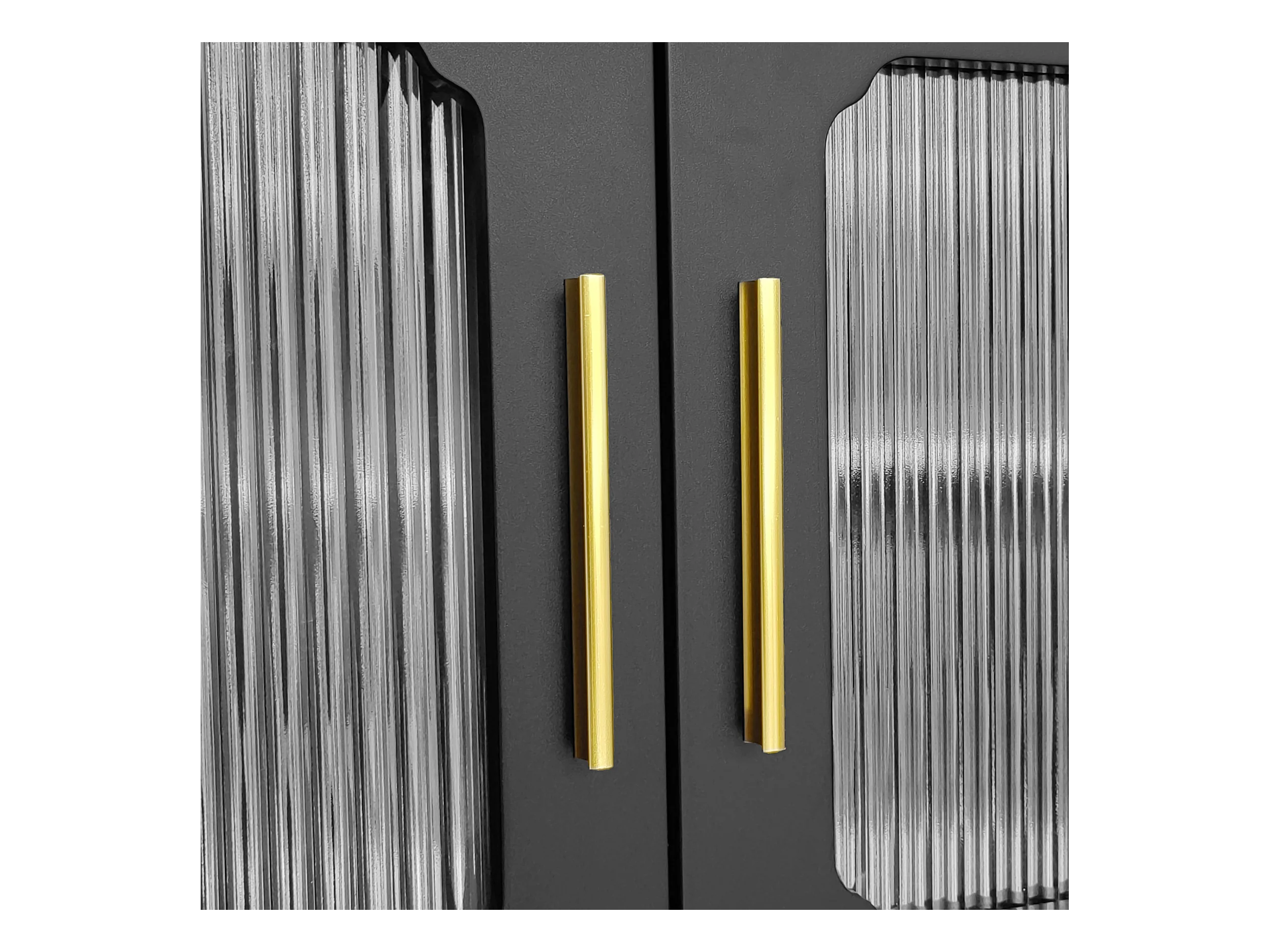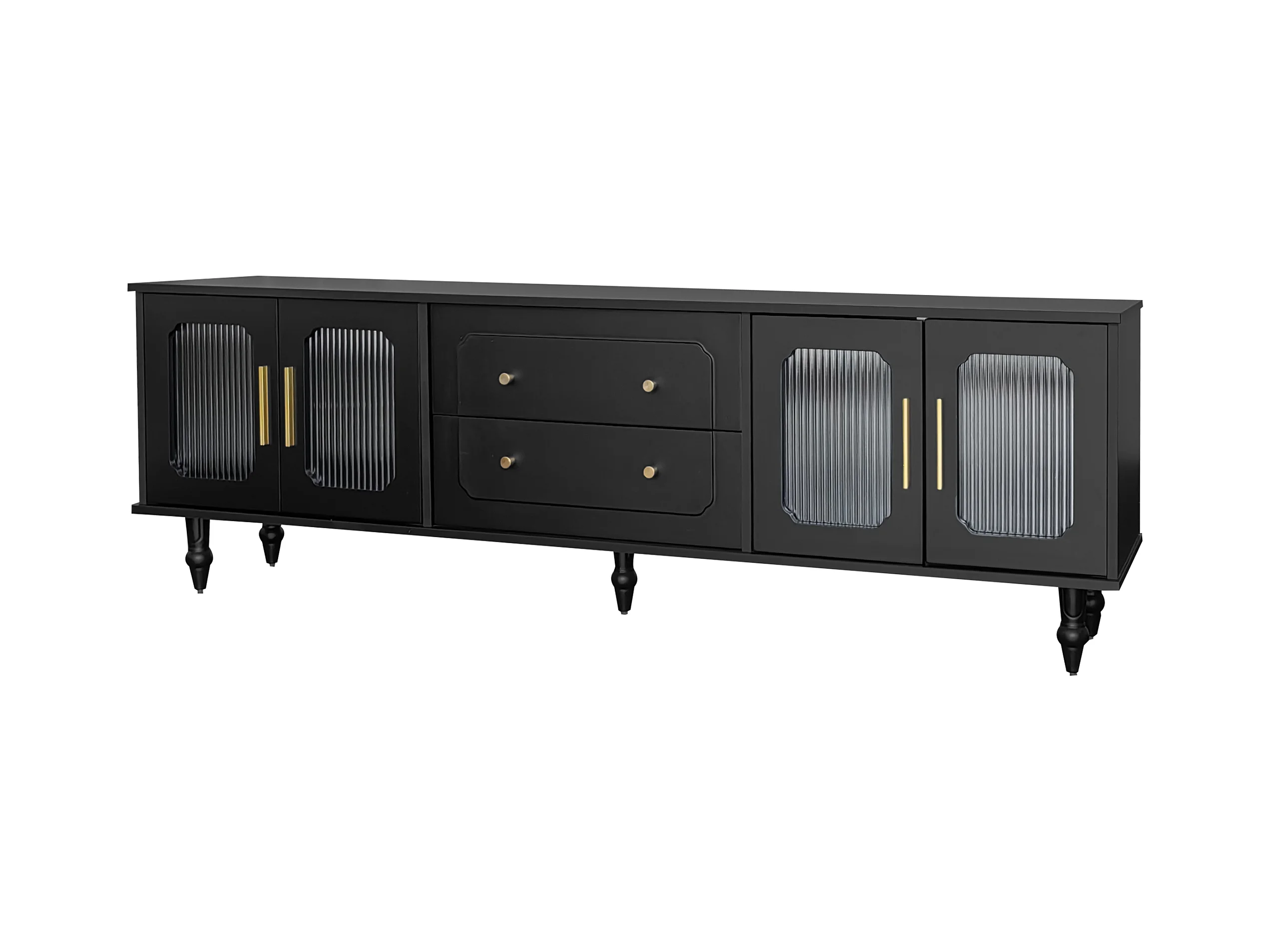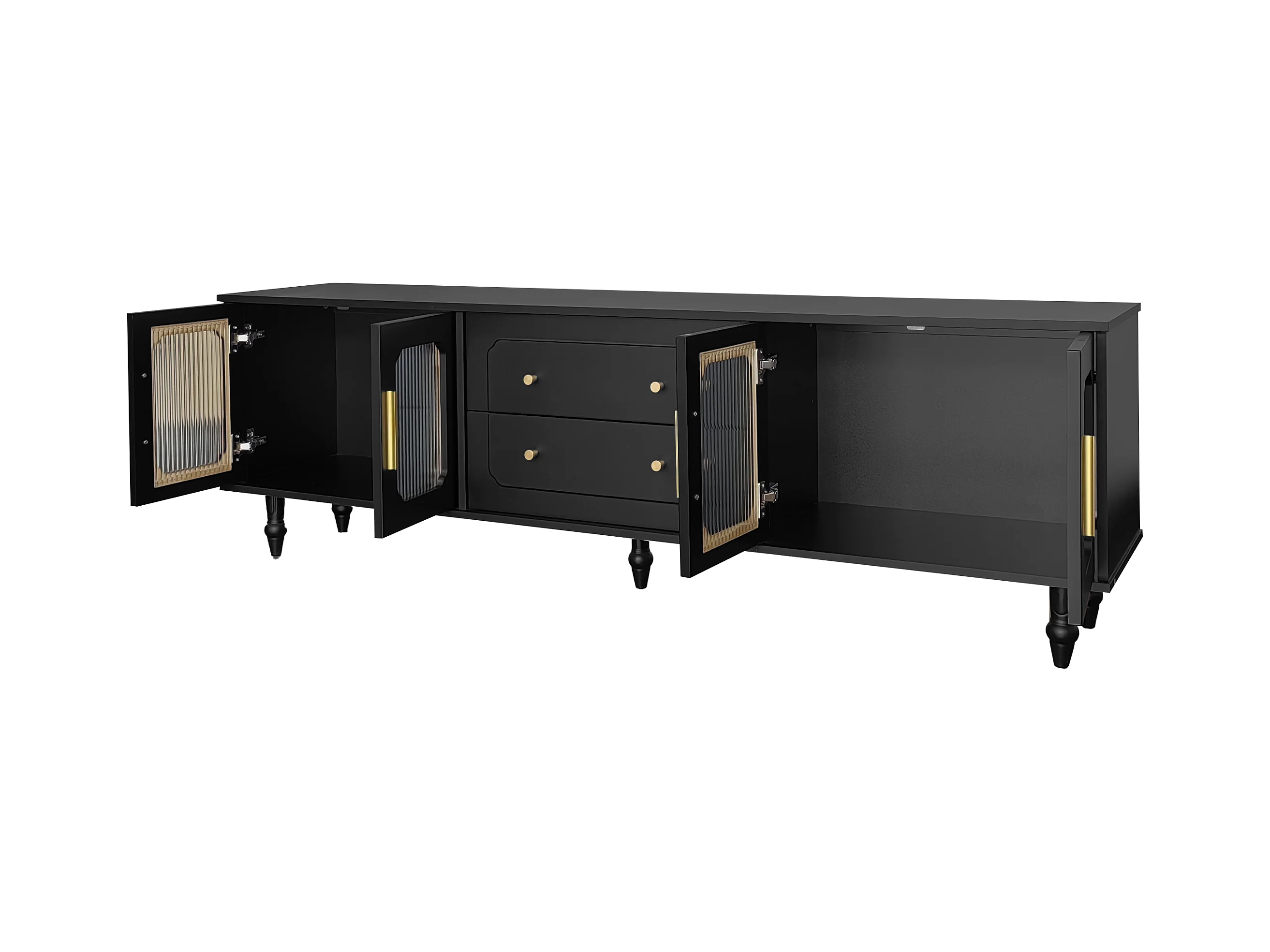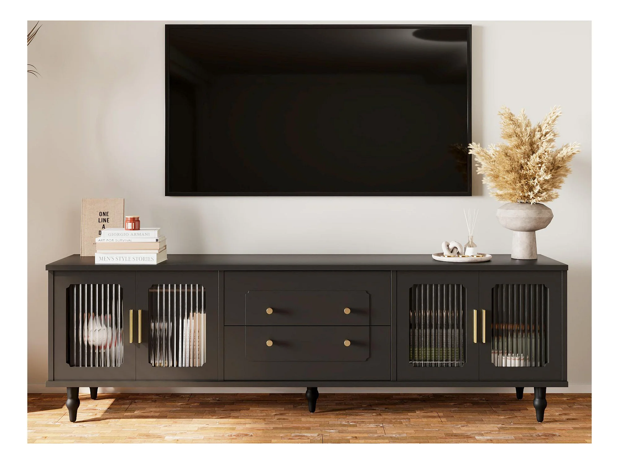 Meuble TV moderne - avec portes en rotin et 2 tiroirs - pieds en métal - Noir