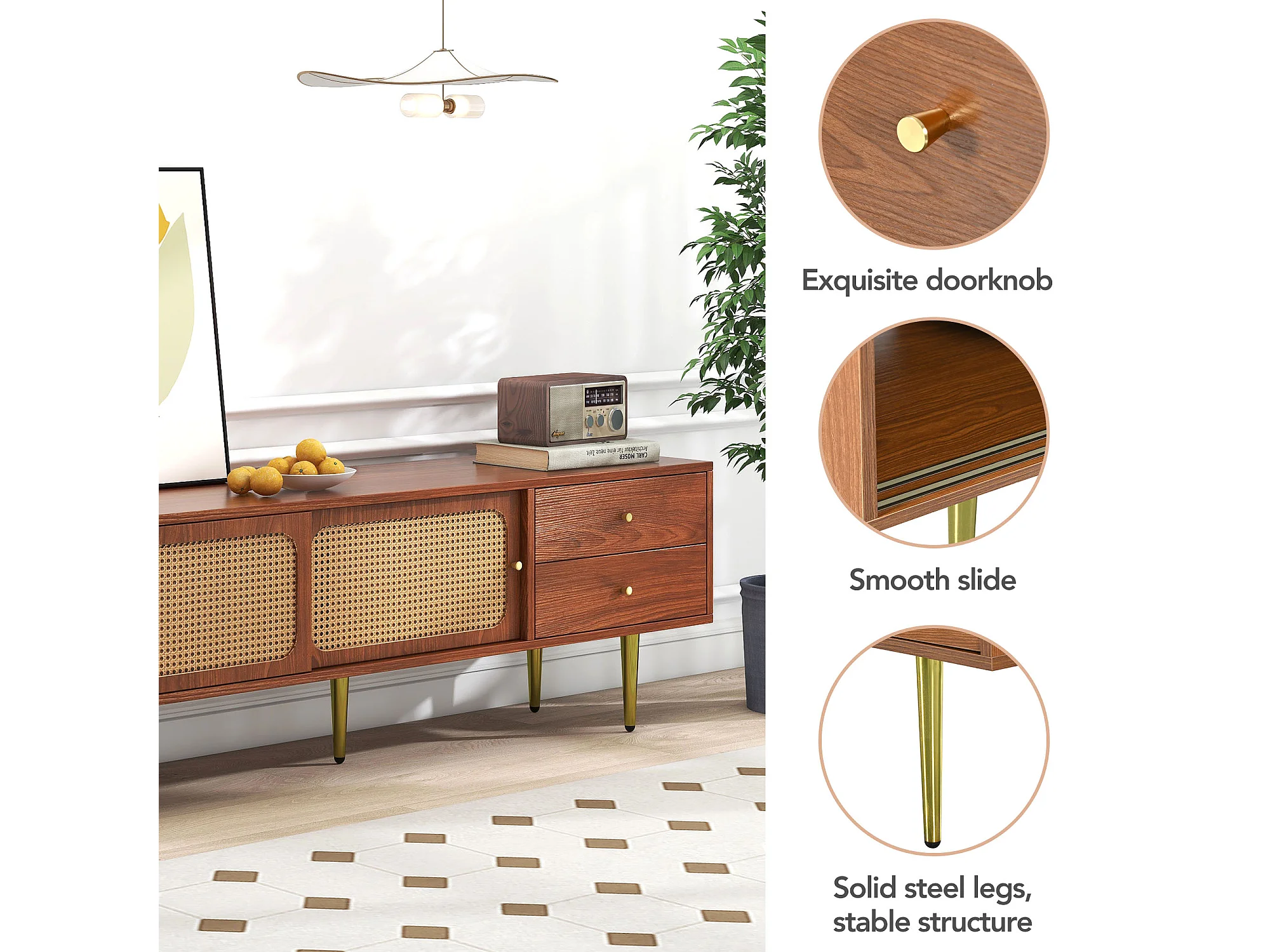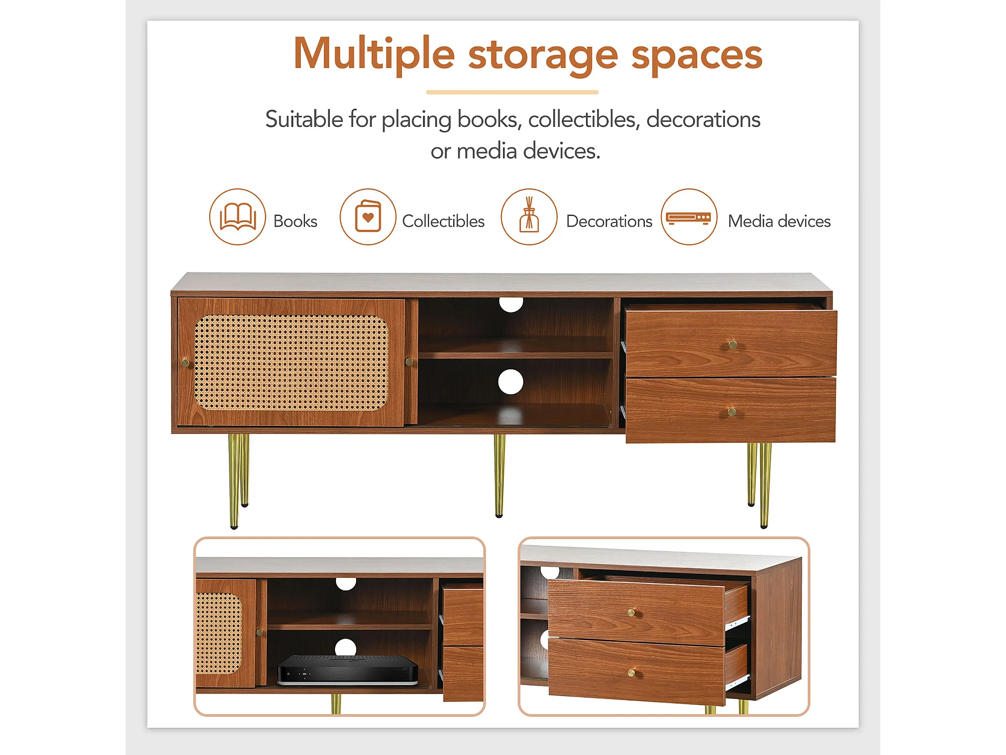 Meuble TV moderne en bois avec portes coulissantes en rotin, 160x40x60cm, 2 tiroirs, 2 portes, rangement pratique