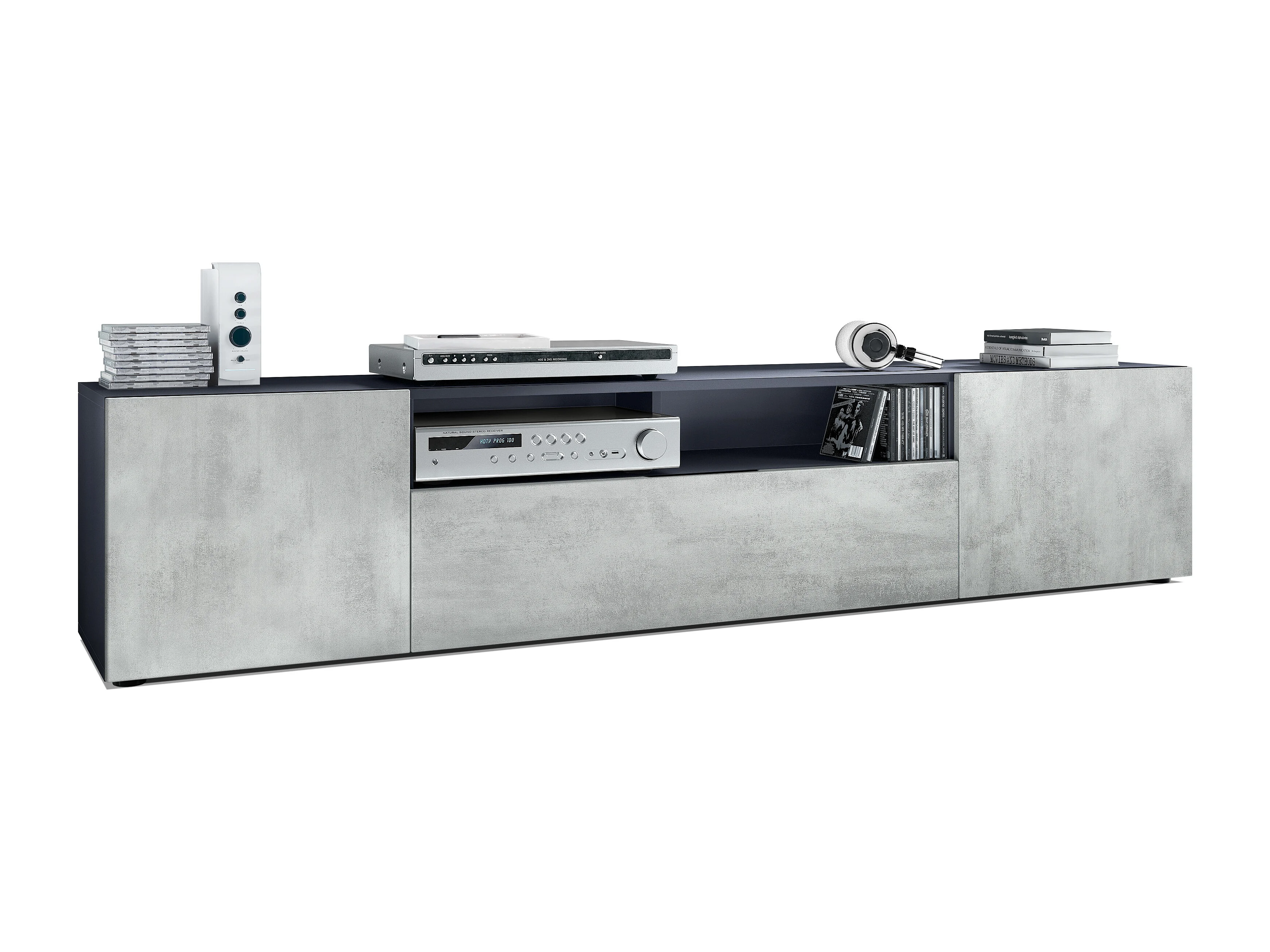 Meuble TV Mogan 181 x 39 x 35 cm, lowboard long avec 6 compartiments, caisson en anthracite mat, façades en Aspect Béton Oxyde