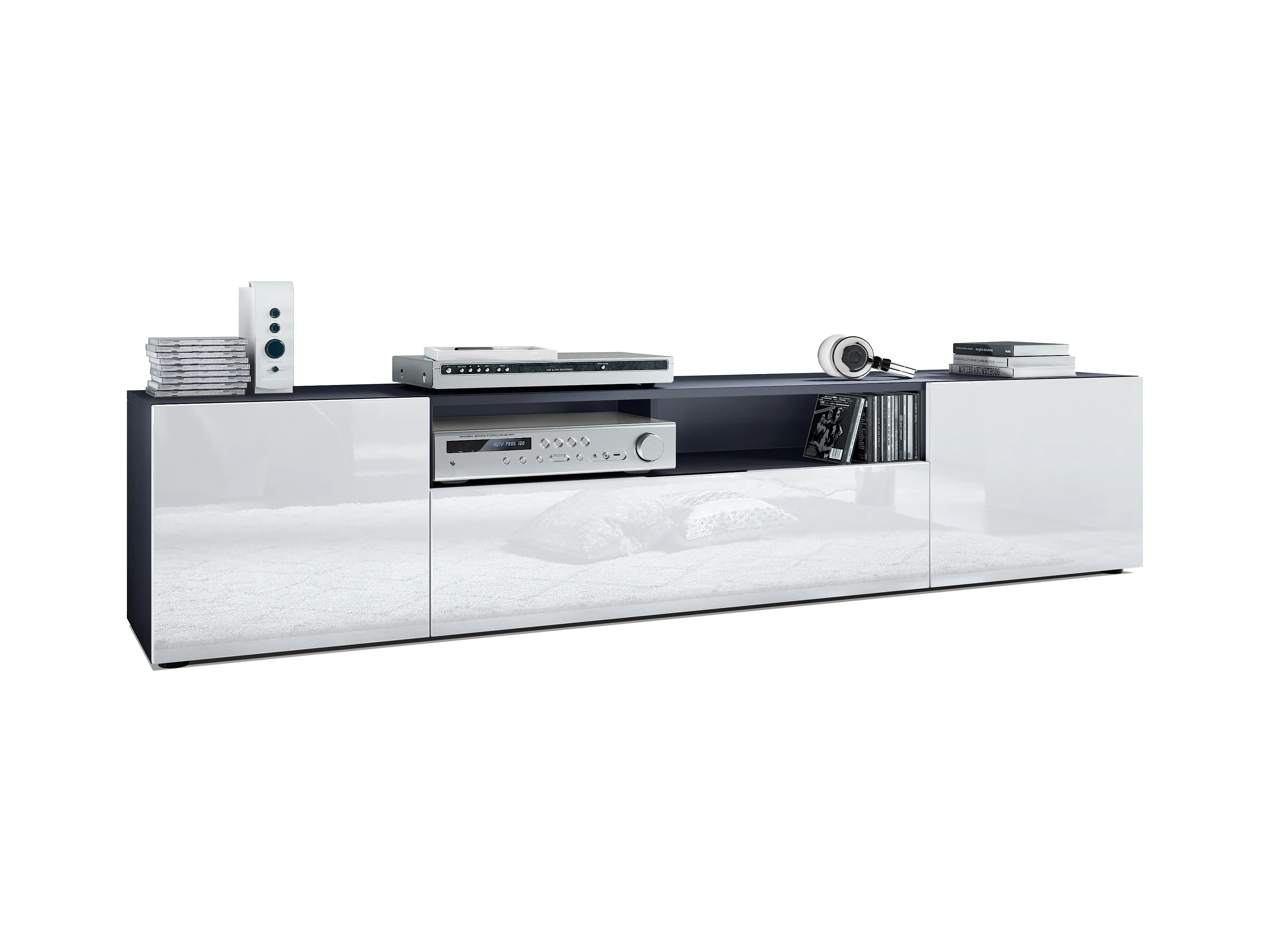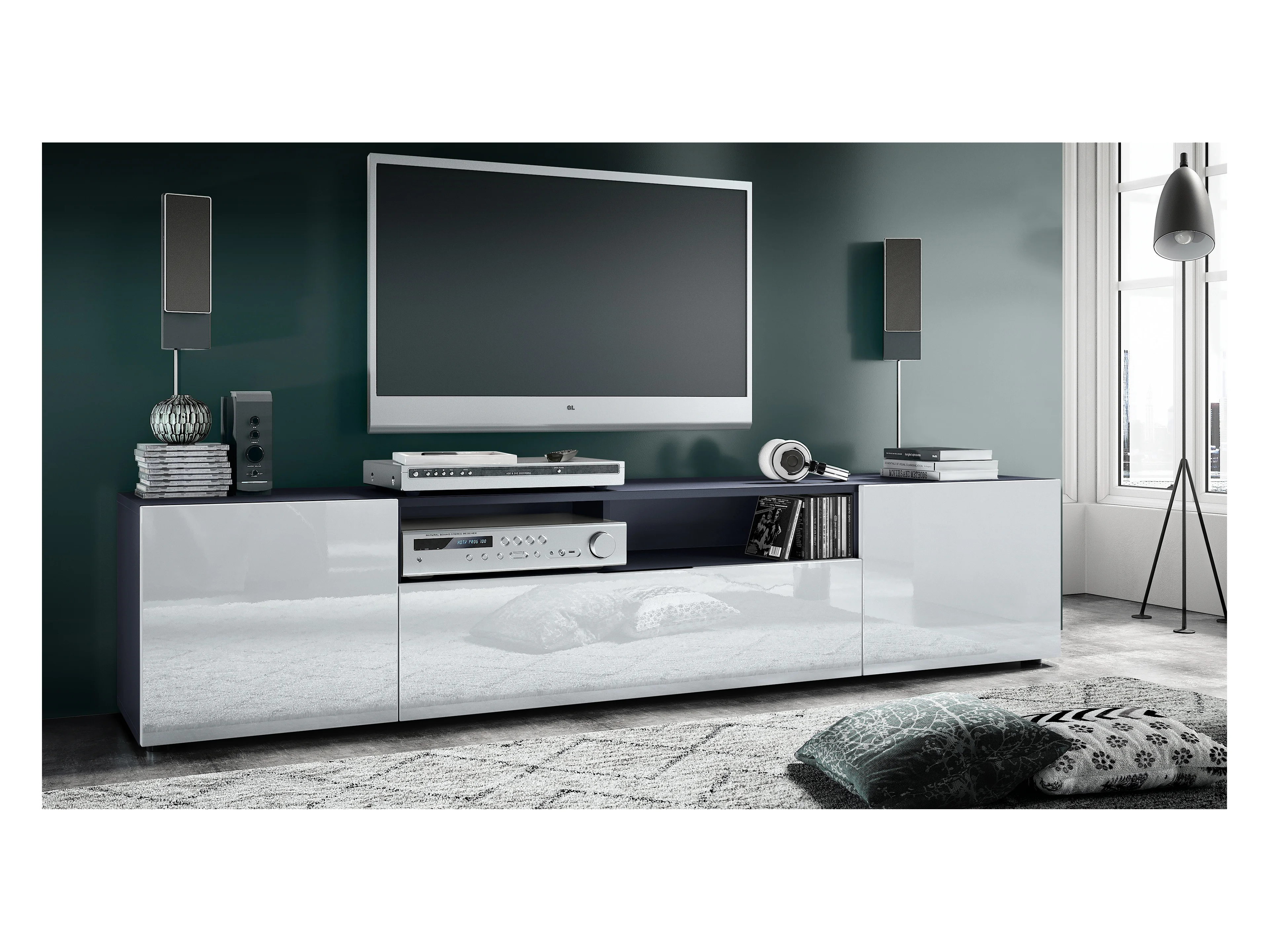 Meuble TV Mogan 181 x 39 x 35 cm, lowboard long avec 6 compartiments, caisson en anthracite mat, façades en Blanc haute brillance