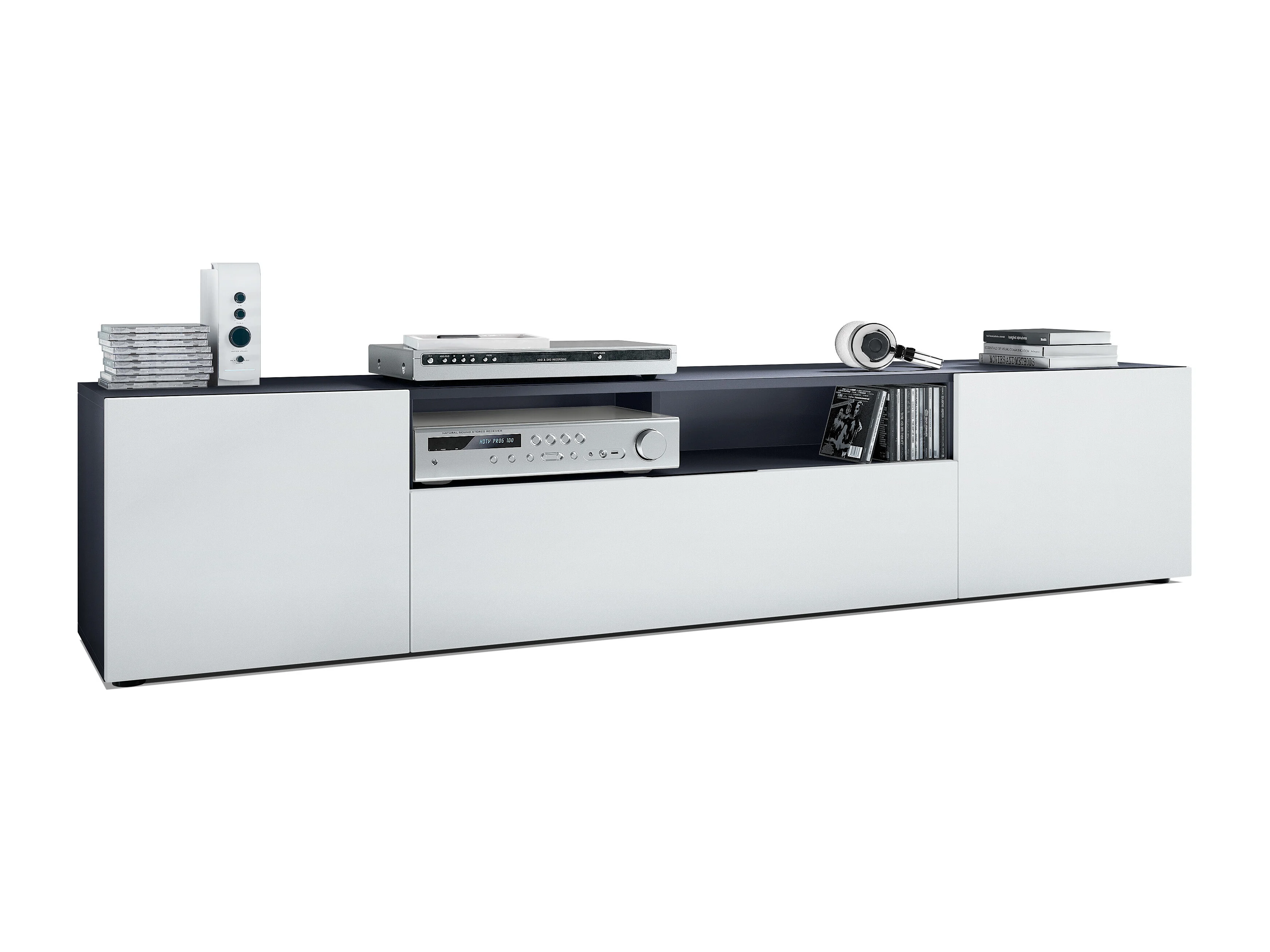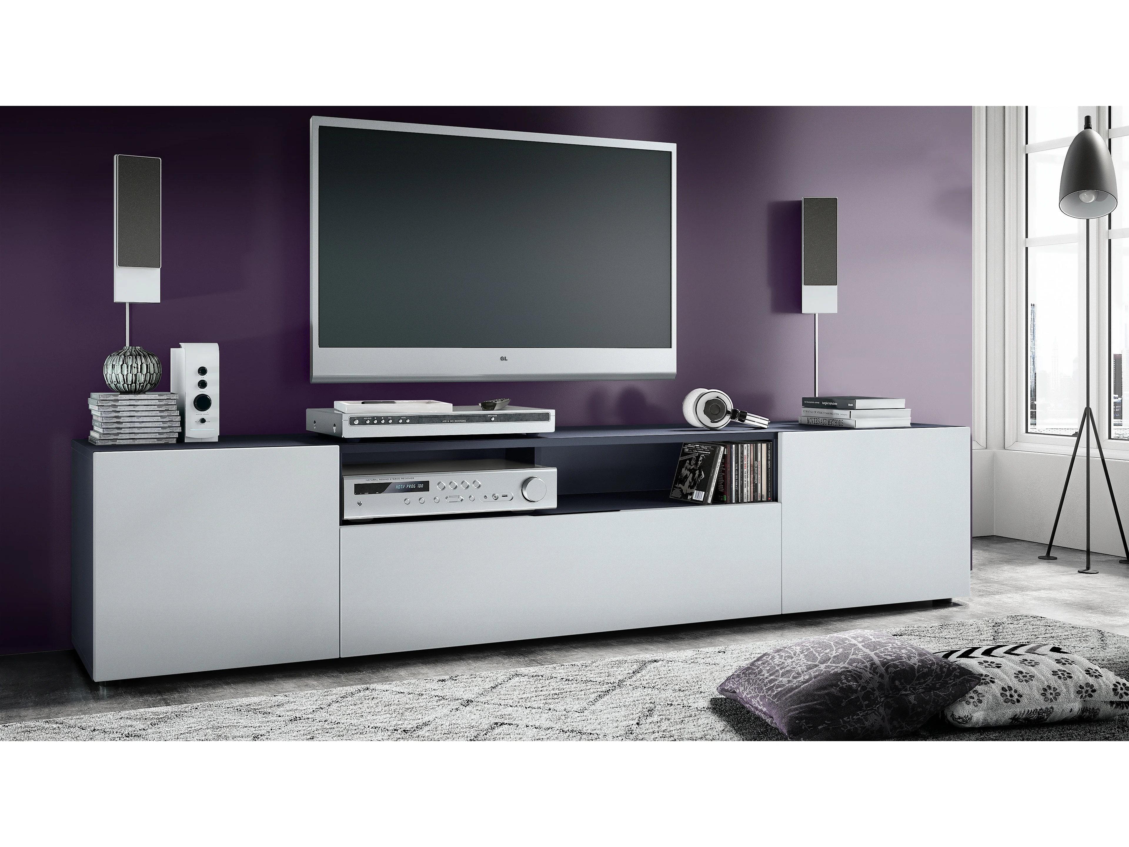 Meuble TV Mogan 181 x 39 x 35 cm, lowboard long avec 6 compartiments, caisson en anthracite mat, façades en Blanc mat