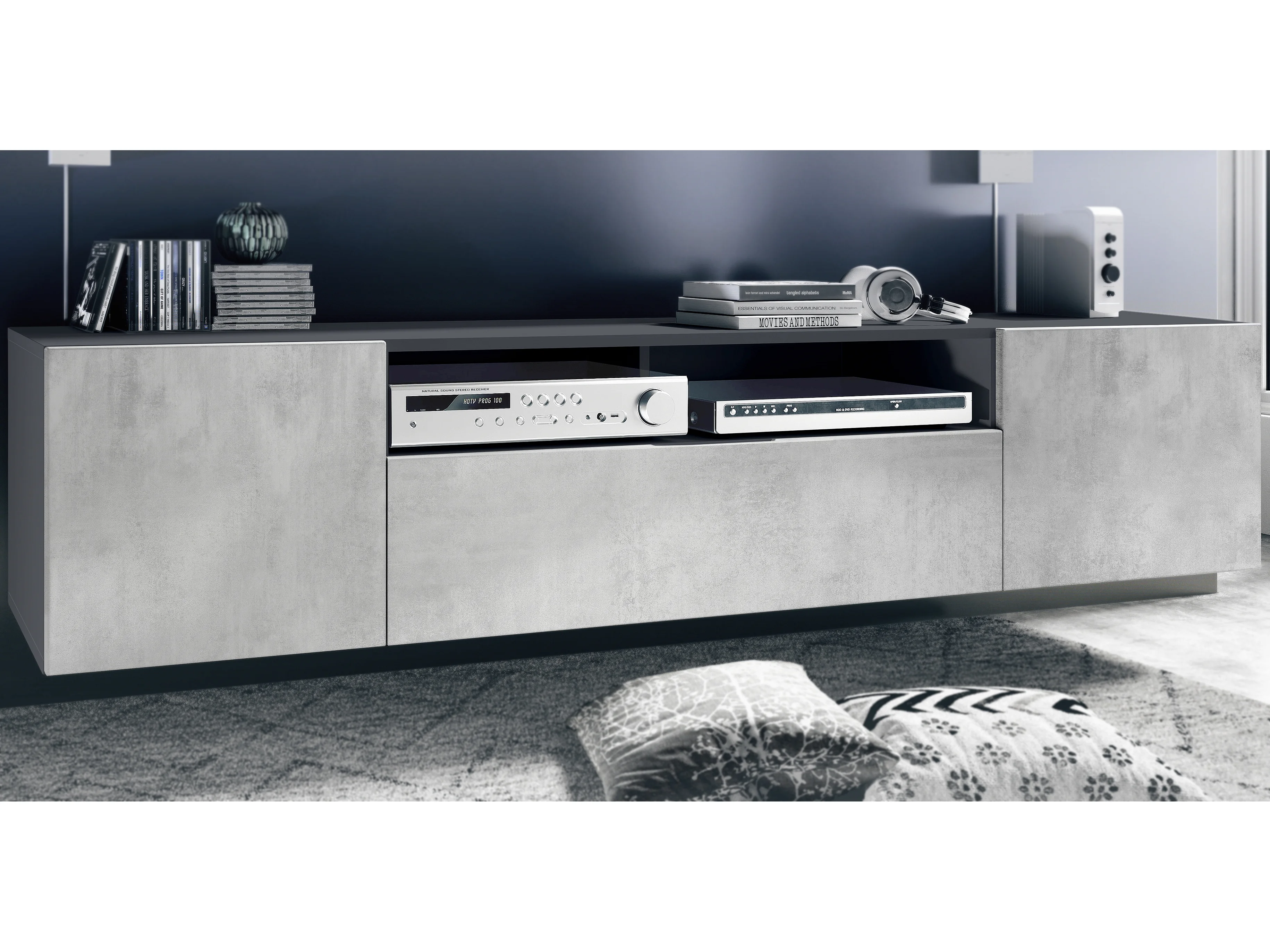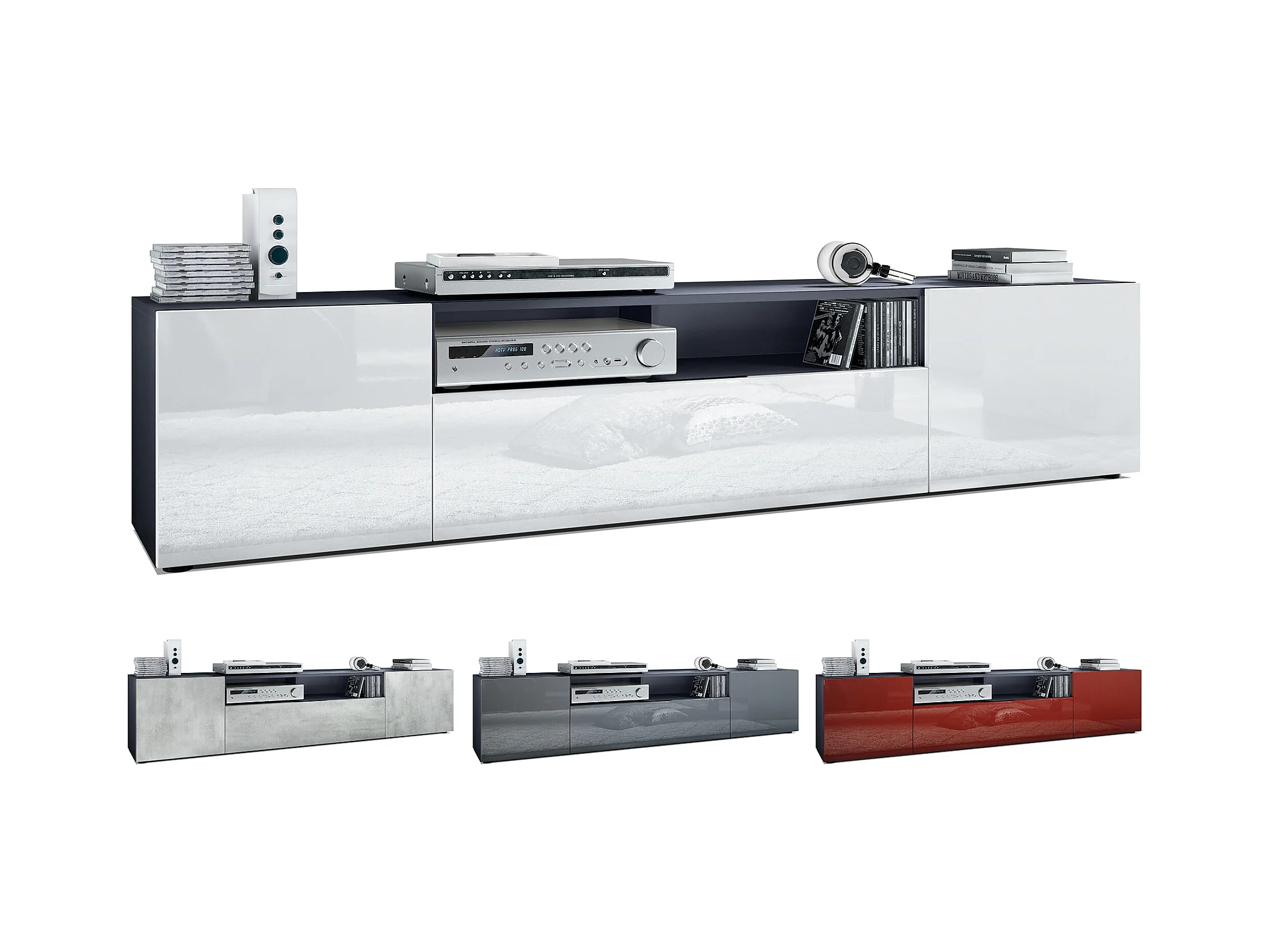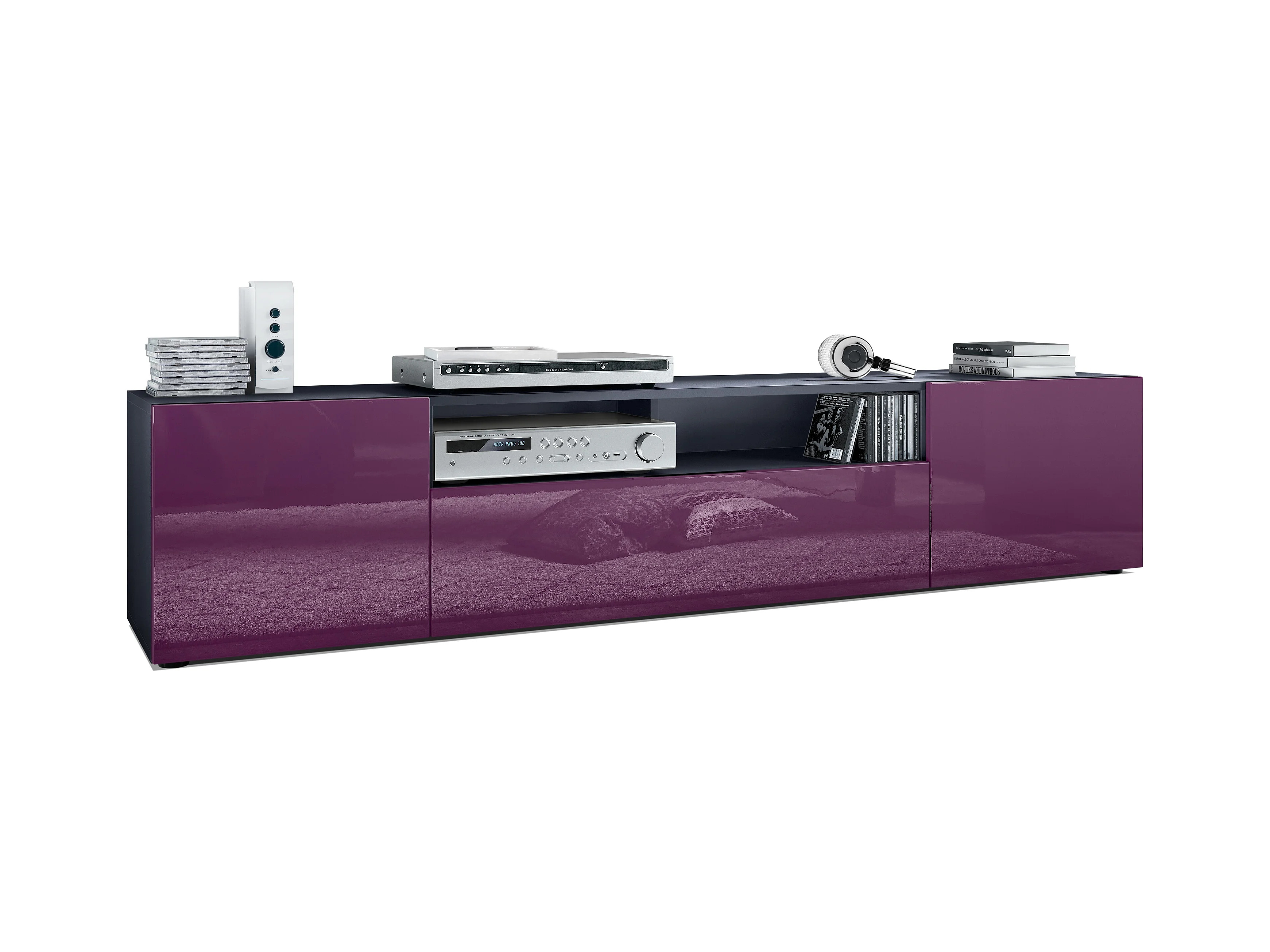 Meuble TV Mogan 181 x 39 x 35 cm, lowboard long avec 6 compartiments, caisson en anthracite mat, façades en Mûre haute brillance