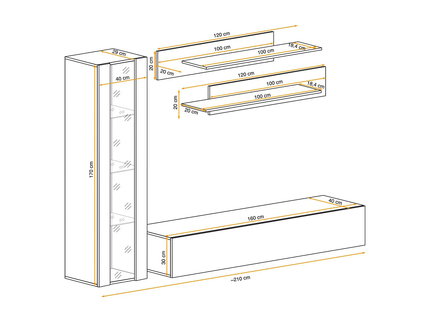Meuble TV Mural Design "Fly II" 210cm Noir & Blanc