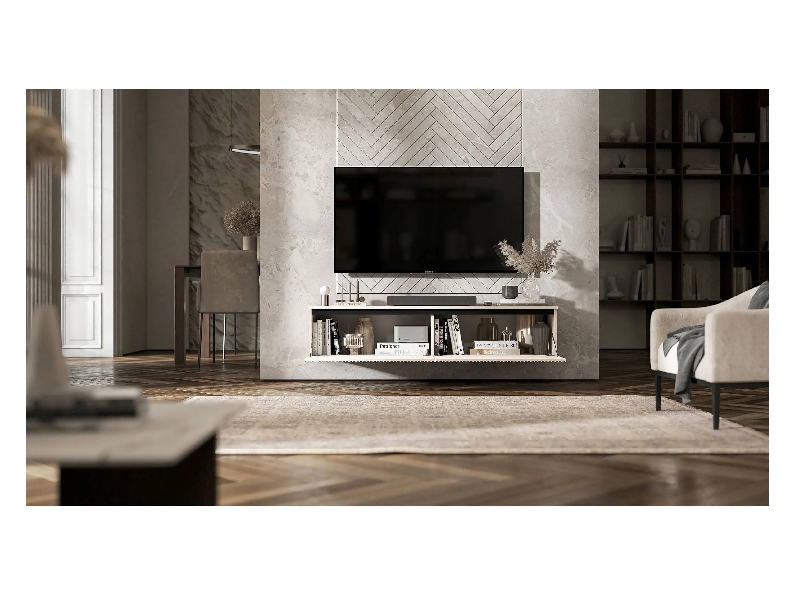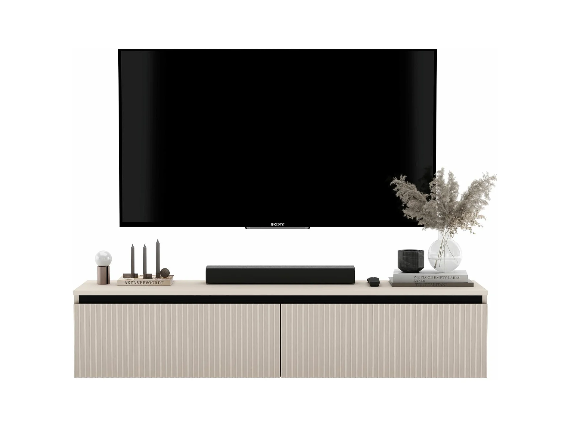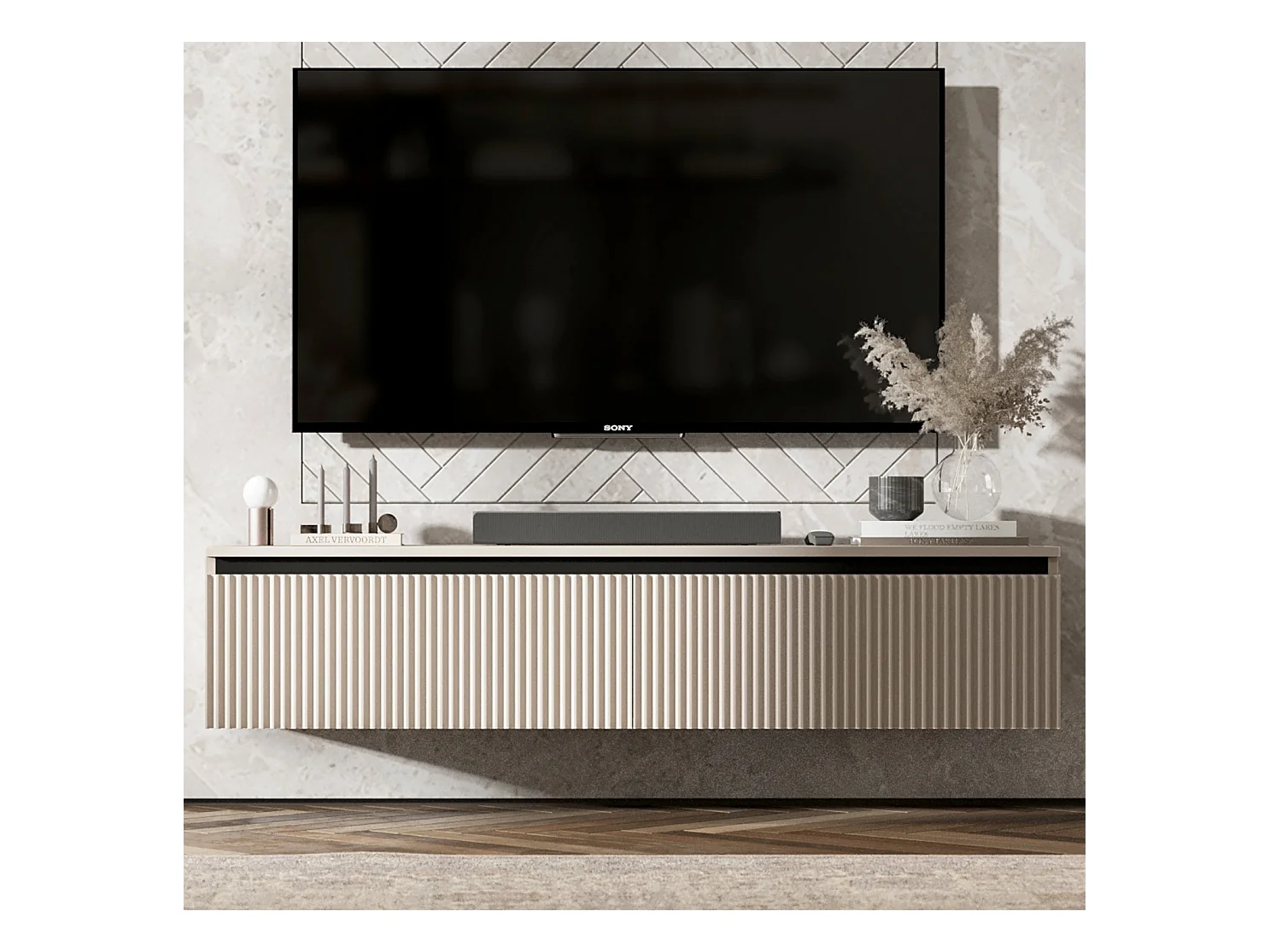 Meuble TV suspendu avec 4 portes - Corps Cachemire mat, façades rainurées Cachemire mat - 280 cm