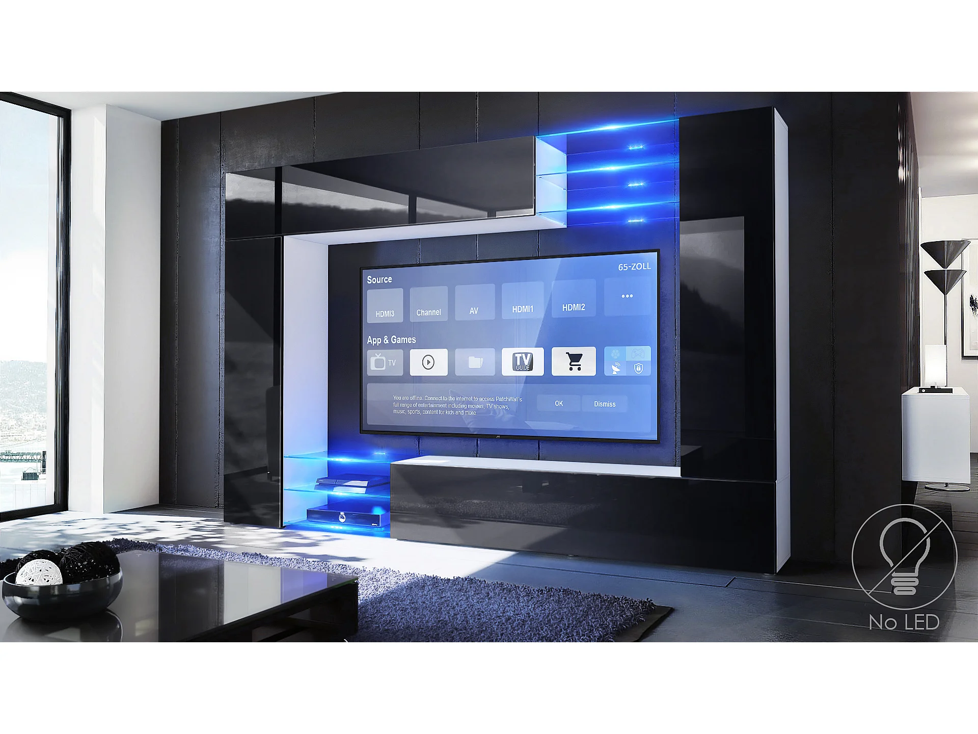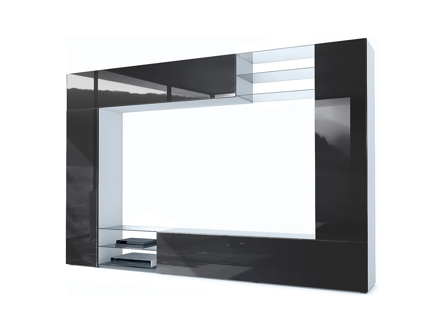 Meuble TV mural Mirage, Ensemble étagère TV avec panneau arrière et 2 portes, 2 clapets et 6 étagères en verre, Blanc mat/Noir brillant (262 x 183 x 39 cm)