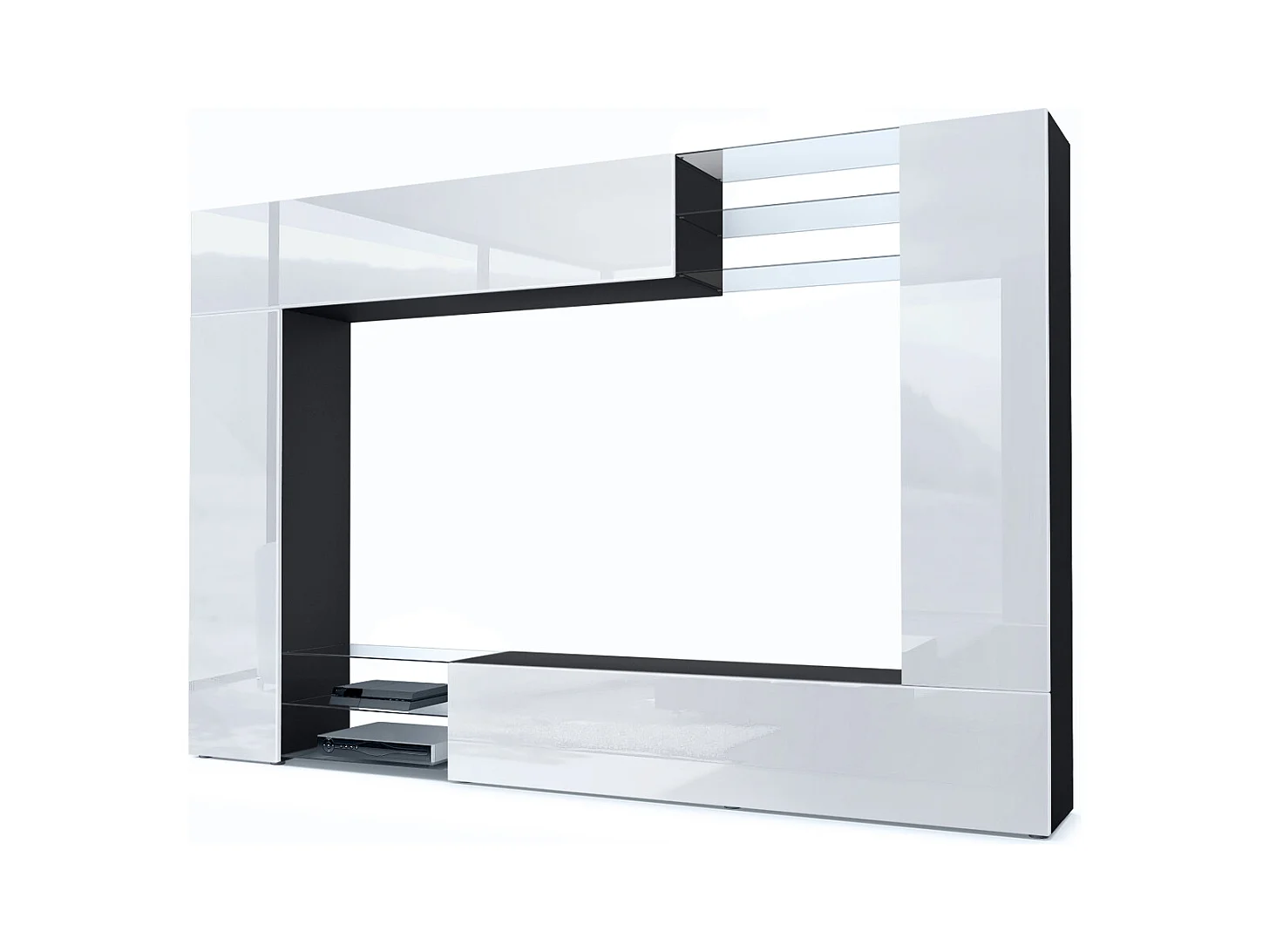 Meuble TV mural Mirage, Ensemble étagère TV avec panneau arrière et 2 portes, 2 clapets et 6 étagères en verre, Noir mat/Blanc brillant (262 x 183 x 39 cm)