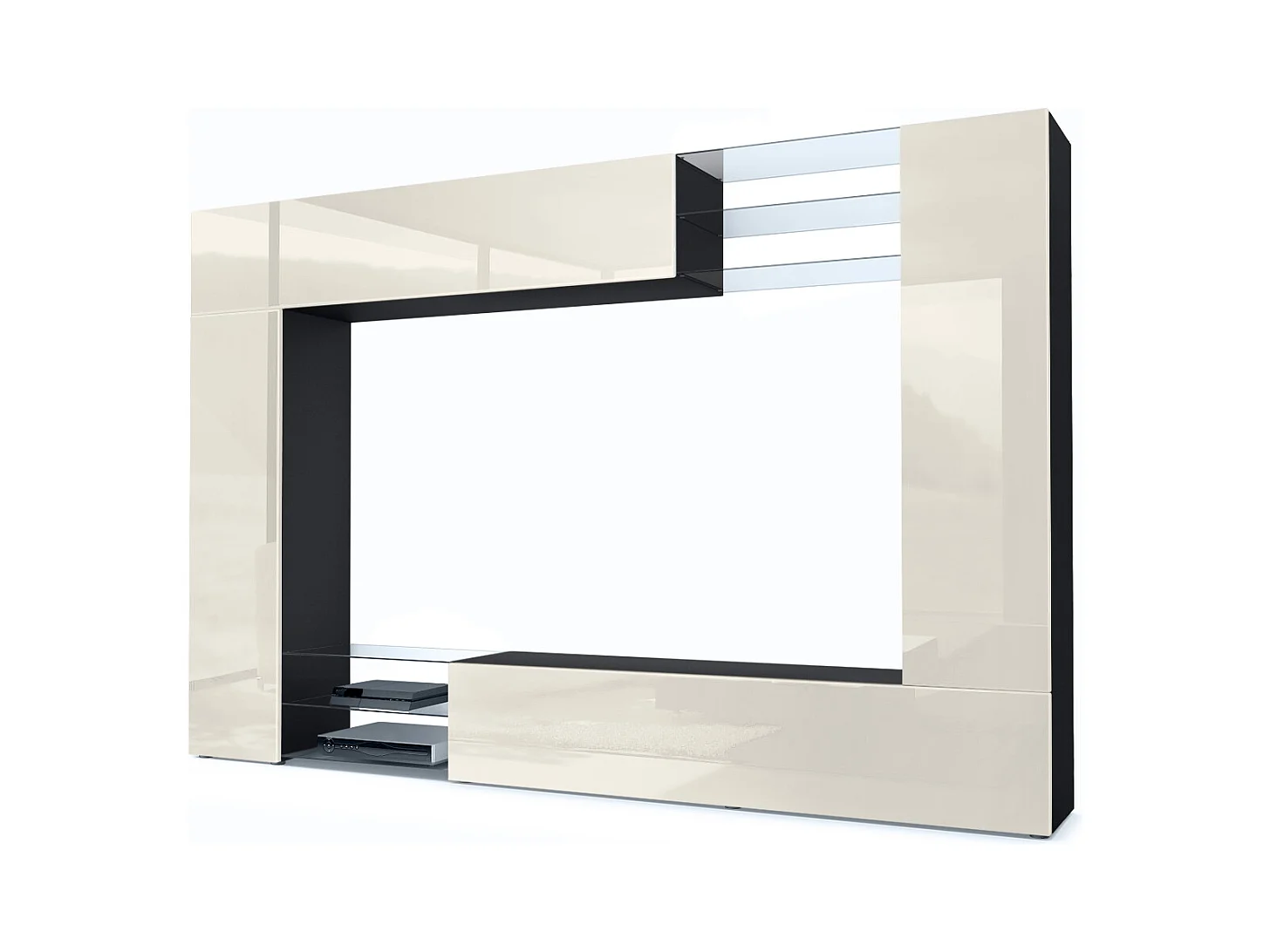 Meuble TV mural Mirage, Ensemble étagère TV avec panneau arrière et 2 portes, 2 clapets et 6 étagères en verre, Noir mat/Crème brillant (262 x 183 x 39 cm)