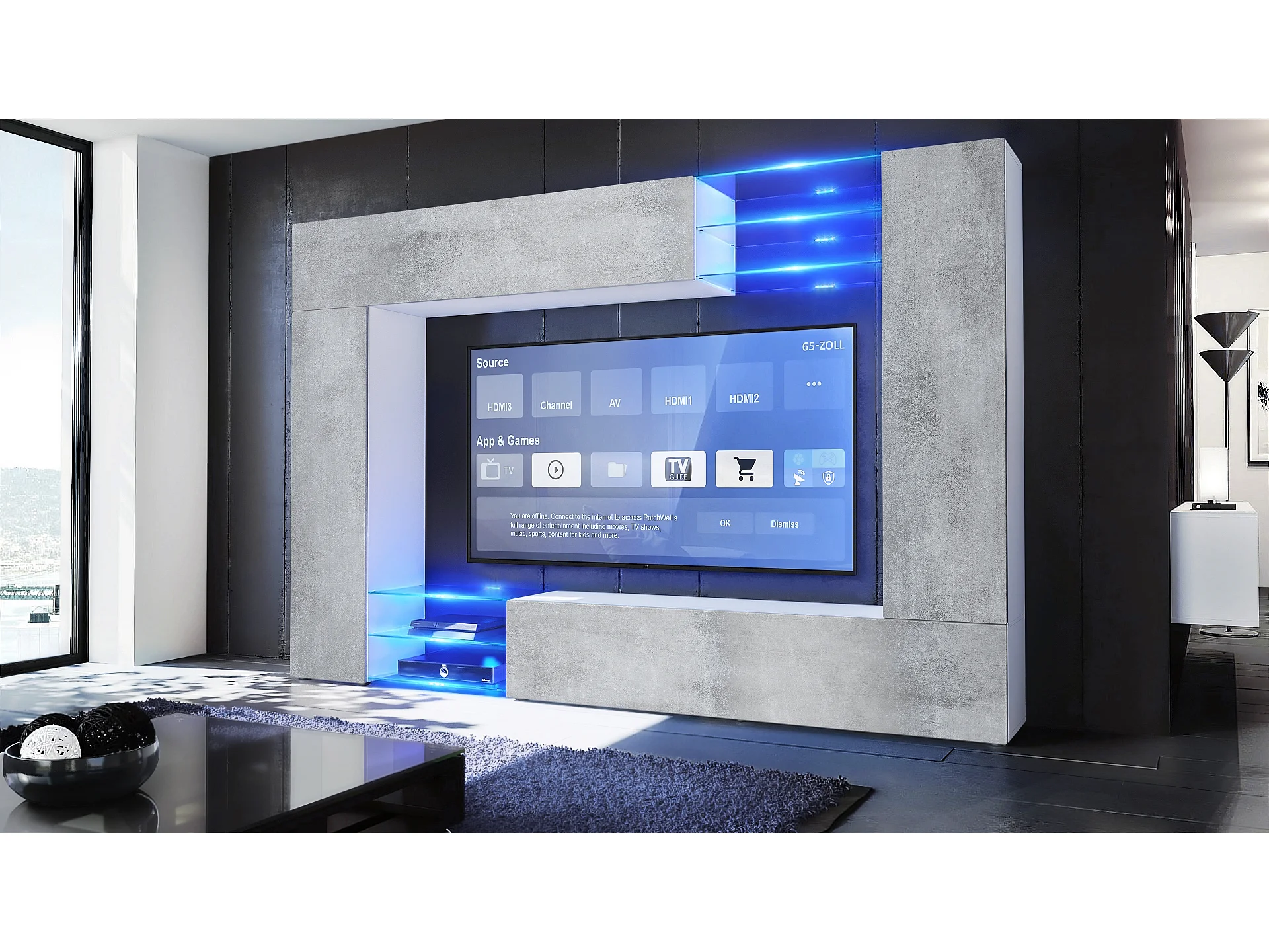 Meuble TV mural Mirage, Ensemble étagère TV et 2 portes, 2 clapets et 6 étagères en verre, Blanc mat/Aspect Béton Oxyde, LED incluse (262 x 183 x 39 cm)