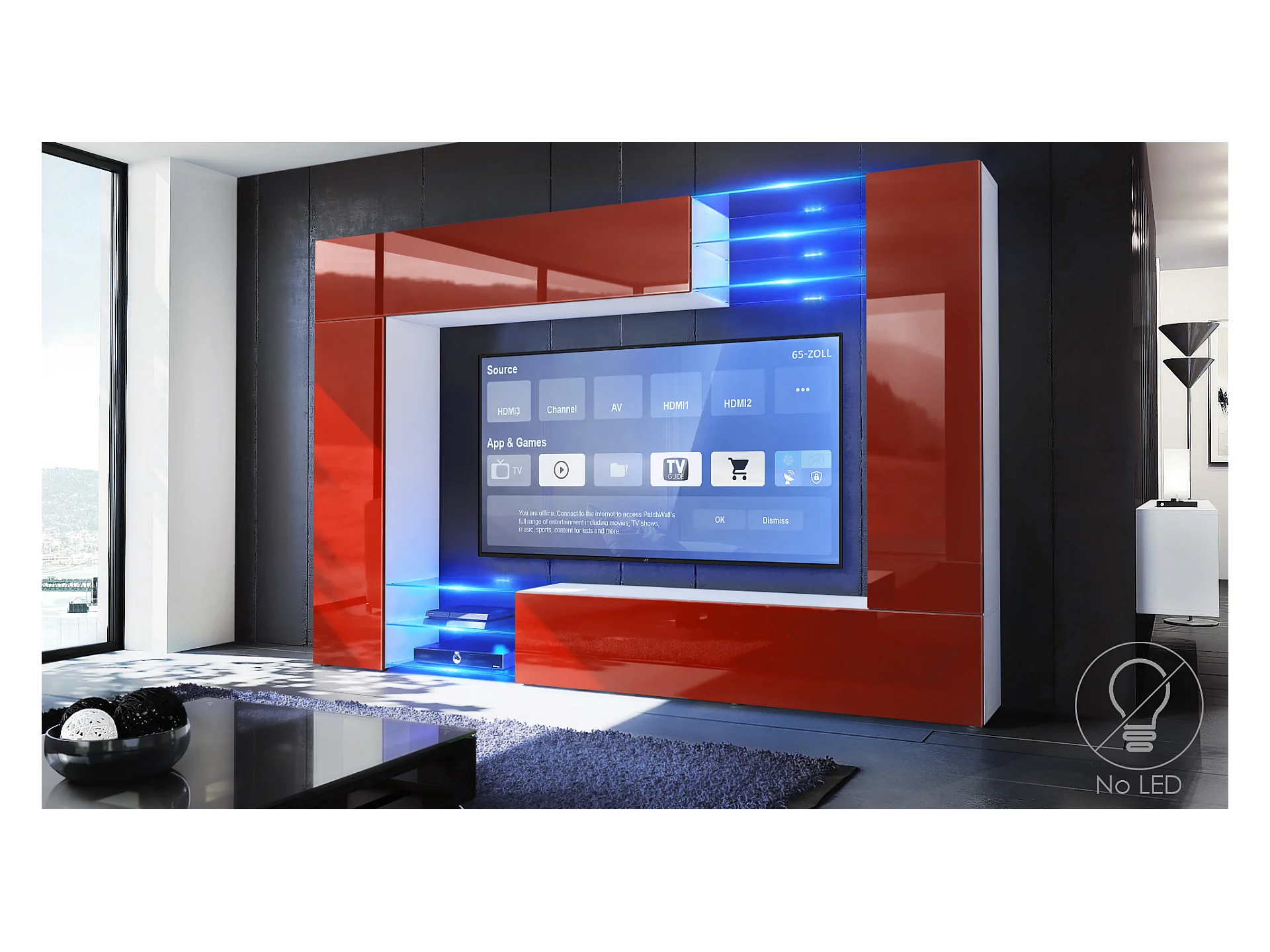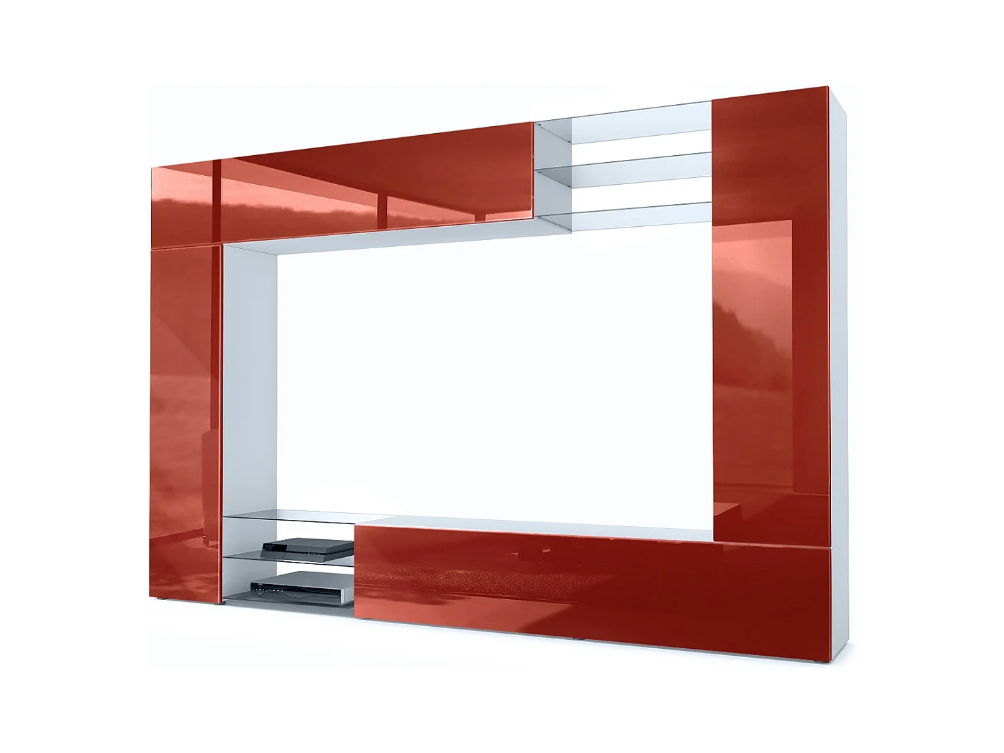 Meuble TV mural Mirage, Ensemble étagère TV et 2 portes, 2 clapets et 6 étagères en verre, Blanc mat/Bordeaux brillant (262 x 183 x 39 cm)