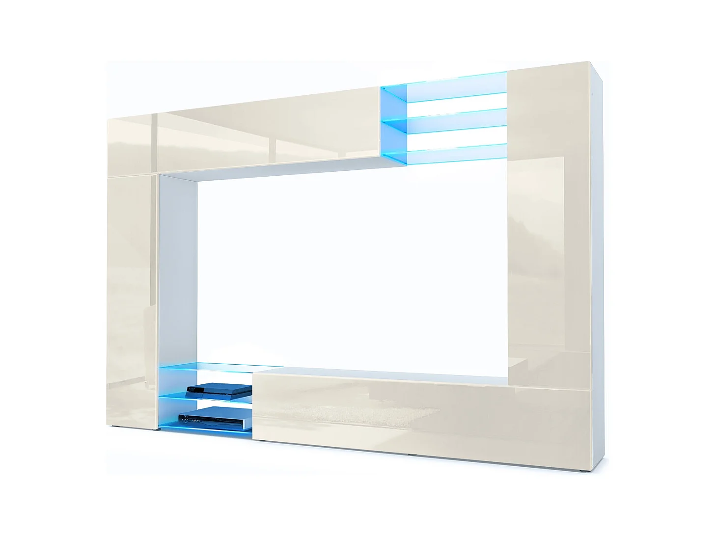 Meuble TV mural Mirage, Ensemble étagère TV et 2 portes, 2 clapets et 6 étagères en verre, Blanc mat/Crème brillant, éclairage LED inclus (262 x 183 x 39 cm)
