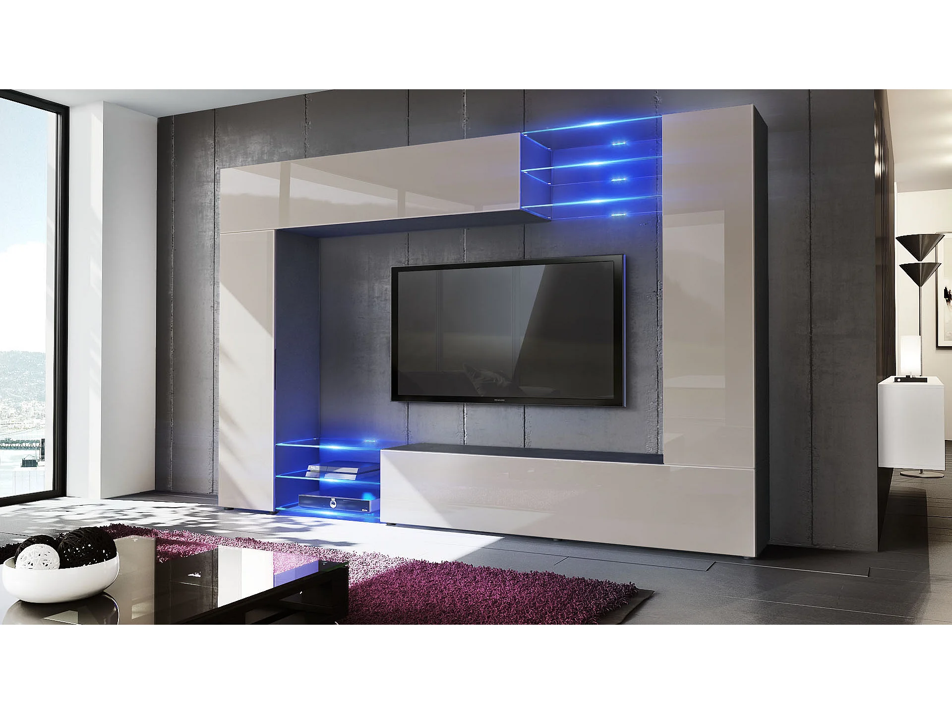 Meuble TV mural Mirage, Ensemble étagère TV et 2 portes, 2 clapets et 6 étagères en verre, Noir mat/Gris sable brillant, LED incluse (262 x 183 x 39 cm)