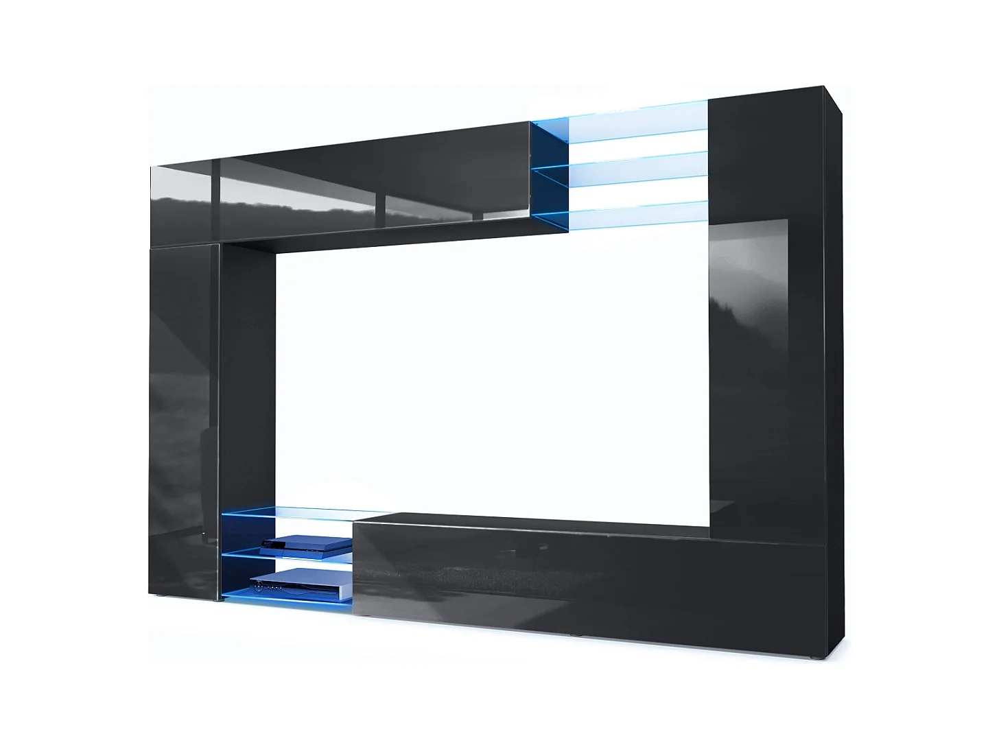 Meuble TV mural Mirage, Ensemble étagère TV et 2 portes, 2 clapets et 6 étagères en verre, Noir mat/Noir brillant, éclairage LED inlcus (262 x 183 x 39 cm)