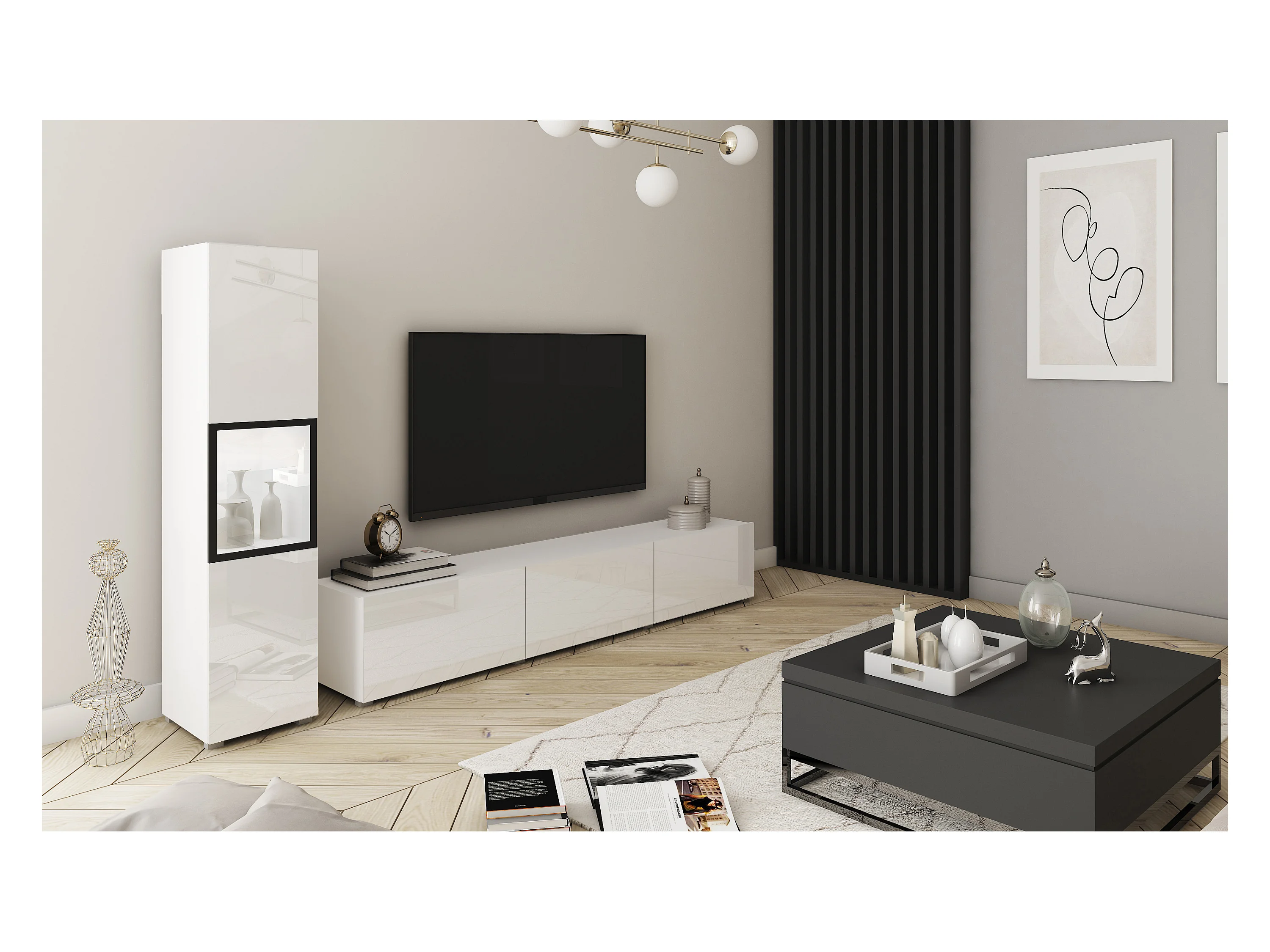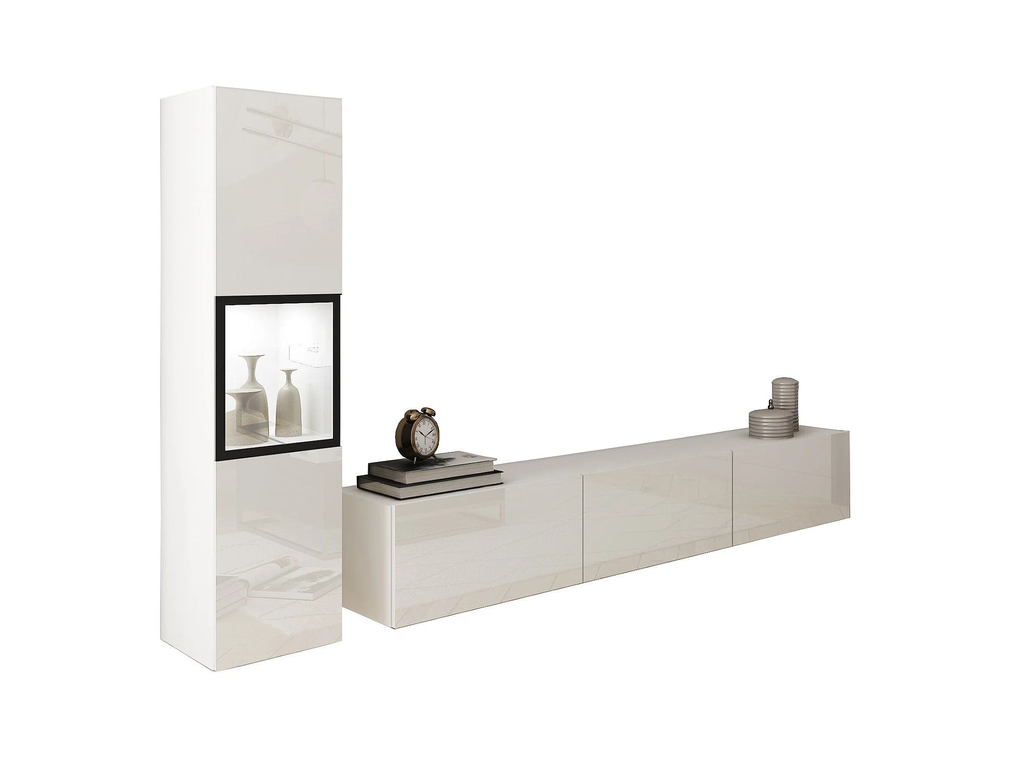 Mur TV moderne – ensemble suspendu et posé 2 éléments avec meuble TV 180 cm et vitrine, caisson blanc mat, façades blanc brillant