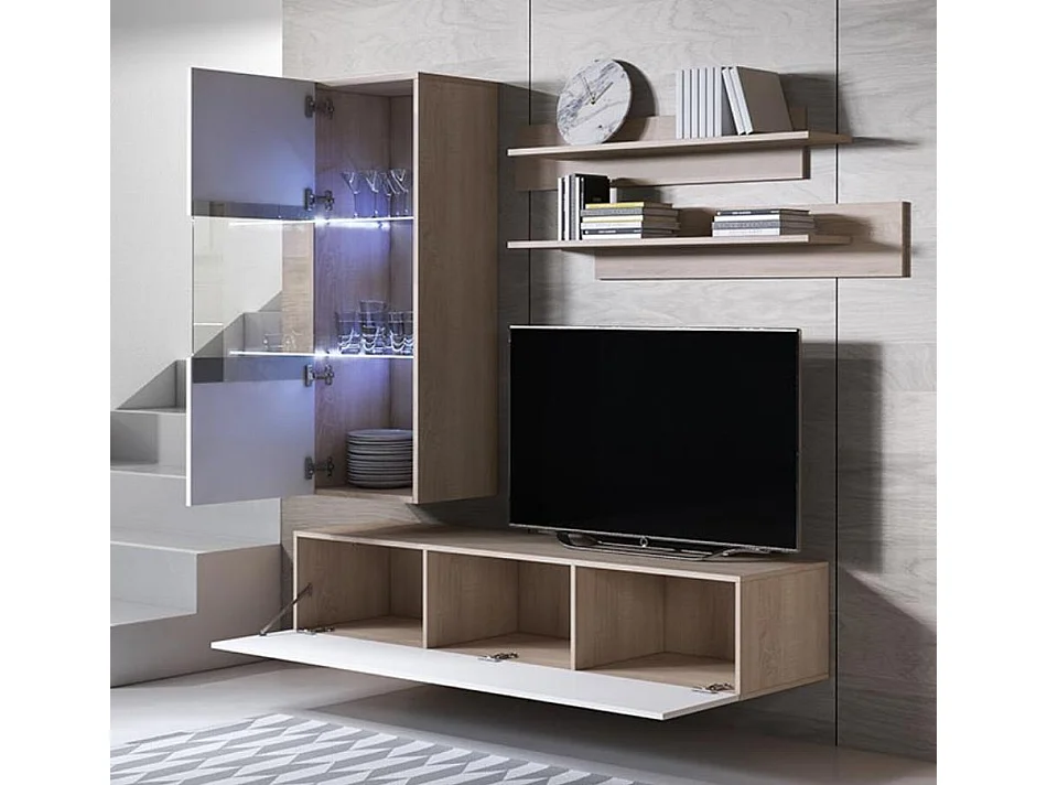 Meuble tv mural pour Salon Salle à manger en Sonoma et Blanc avec LED 160x40x166cm Luke 6