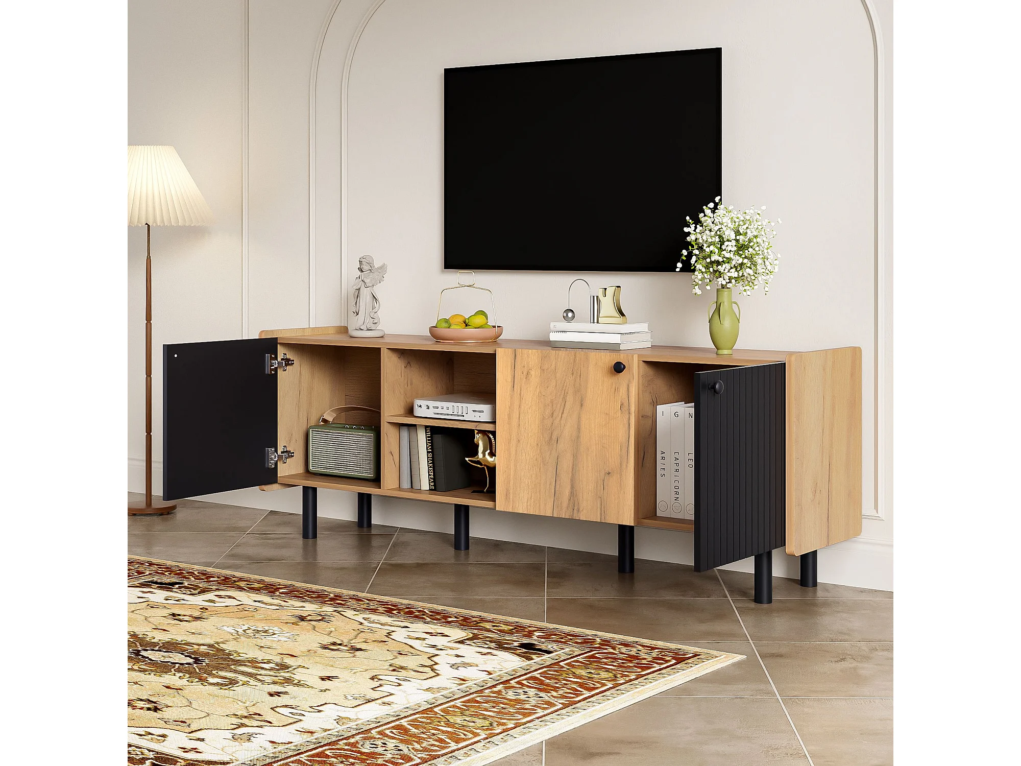Meuble TV naturel - Meuble TV 3 portes et 2 rangements ouverts - 6 pieds en fer mat - pour salon