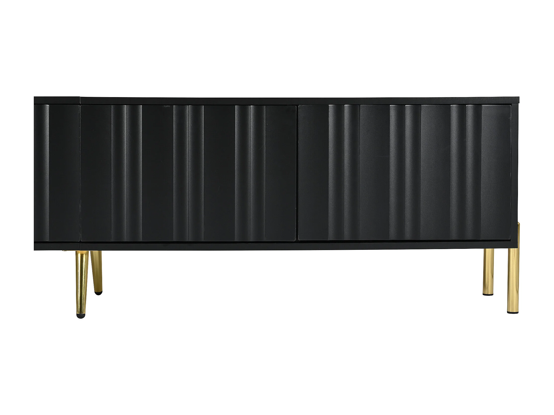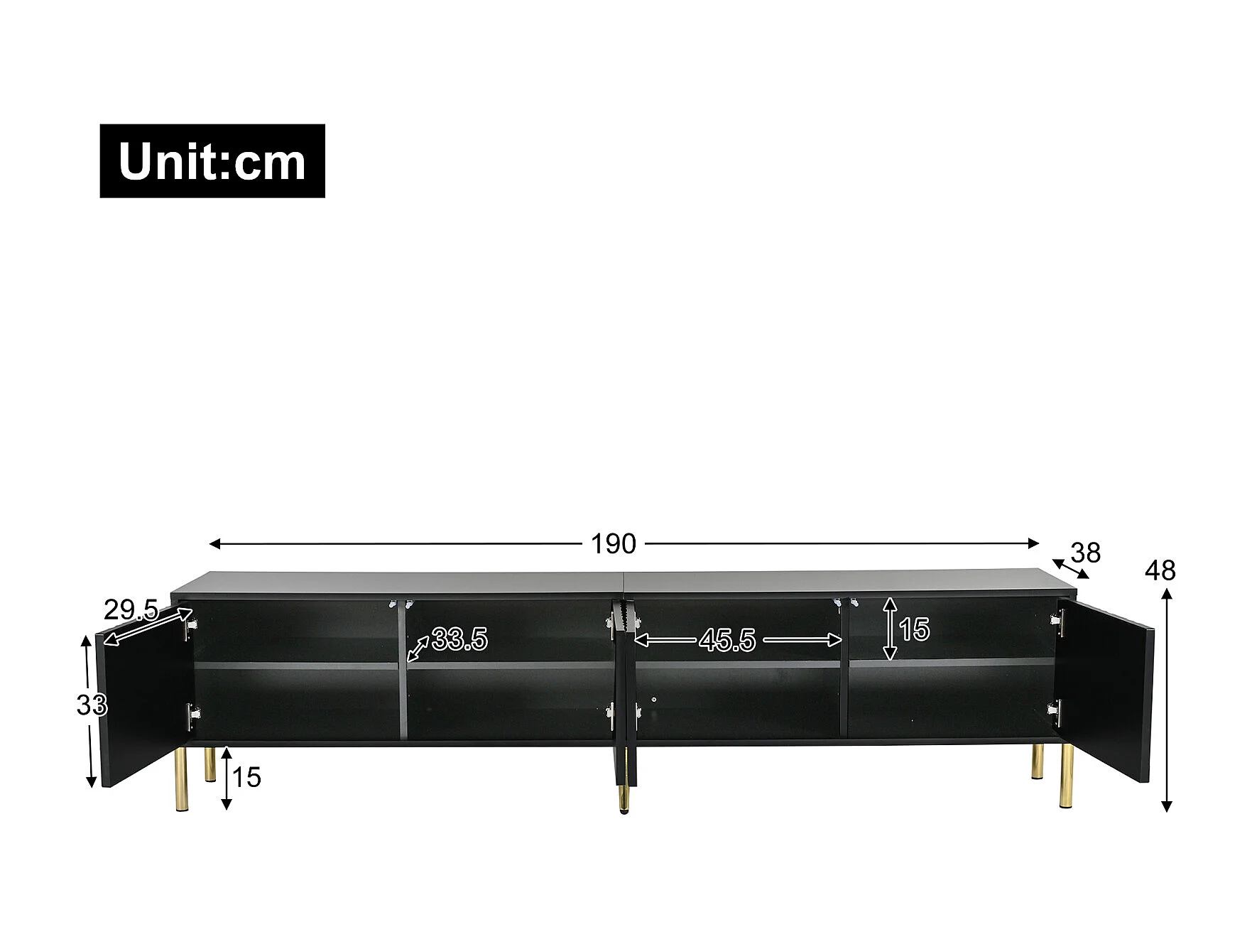 Meuble TV Noir, Banc TV 190cm avec 4 Portes, Meuble Télé avec Jambes Dorées, Portes Rainurées