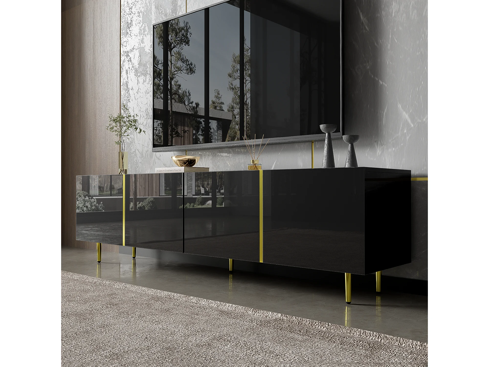 Meuble TV Noir, Banc TV avec 4 Portes, Meuble Télé de Salon avec Lignes Dorées, 170x35x46cm