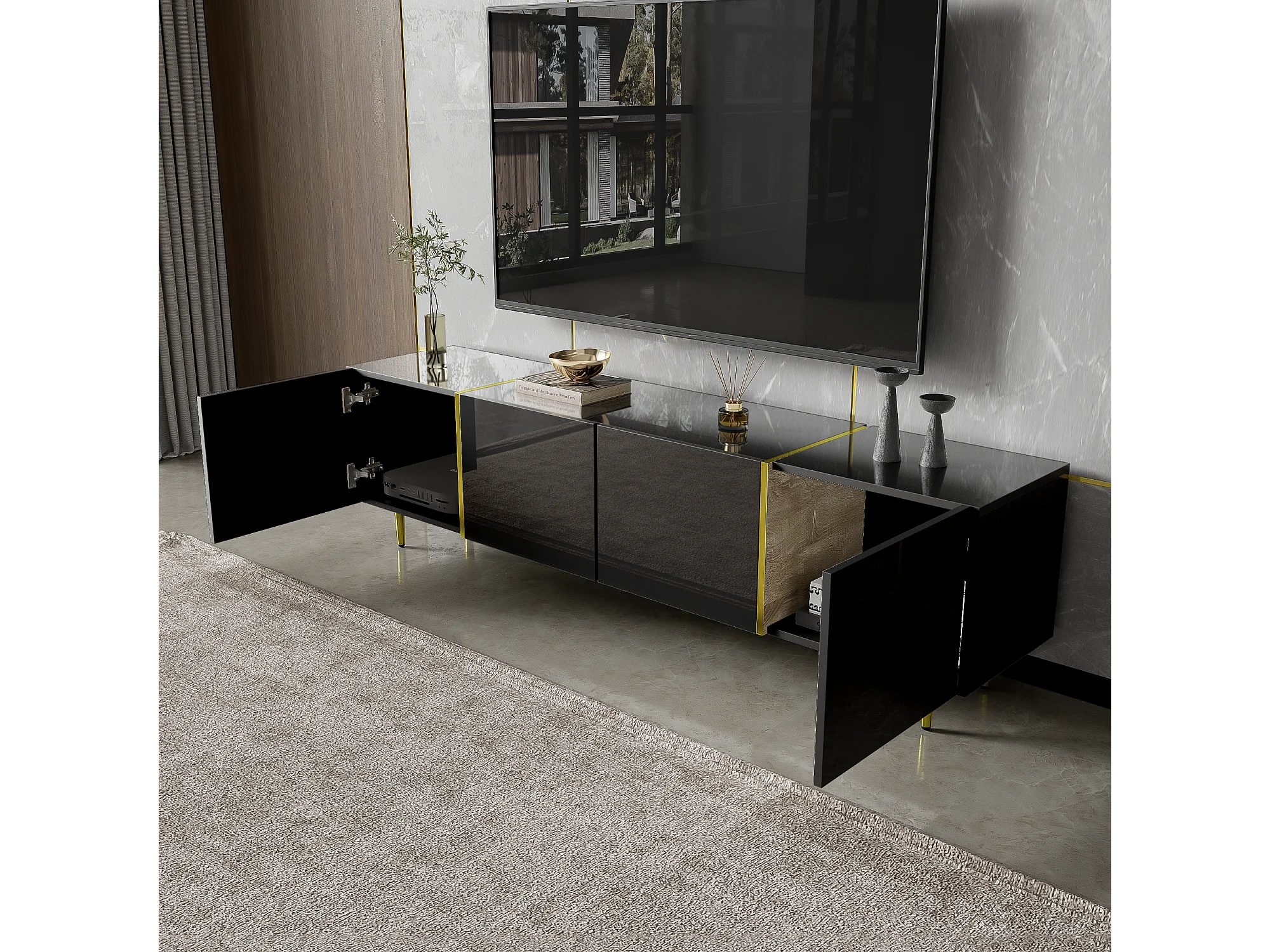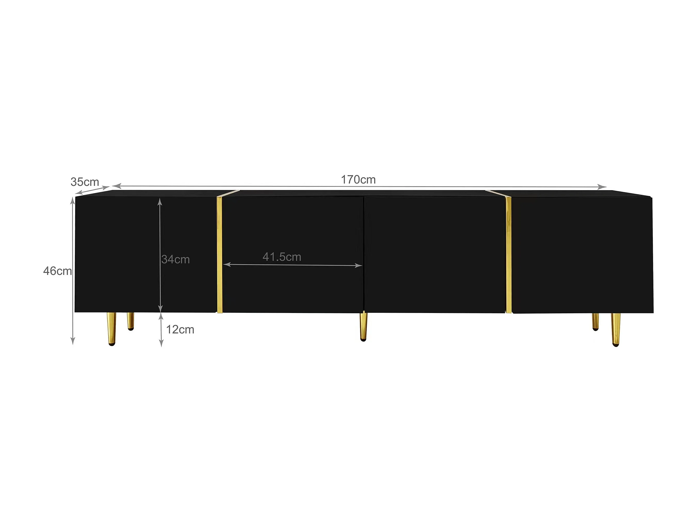 Meuble TV bas de 175 cm de long avec 4 tiroirs et portes, Support TV avec pieds en métal doré, Noir
