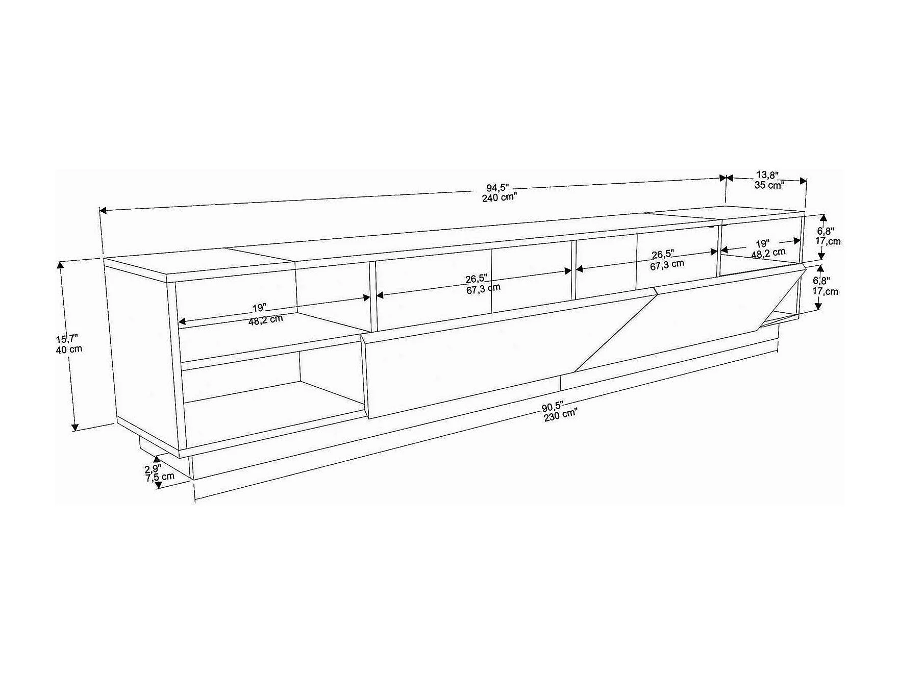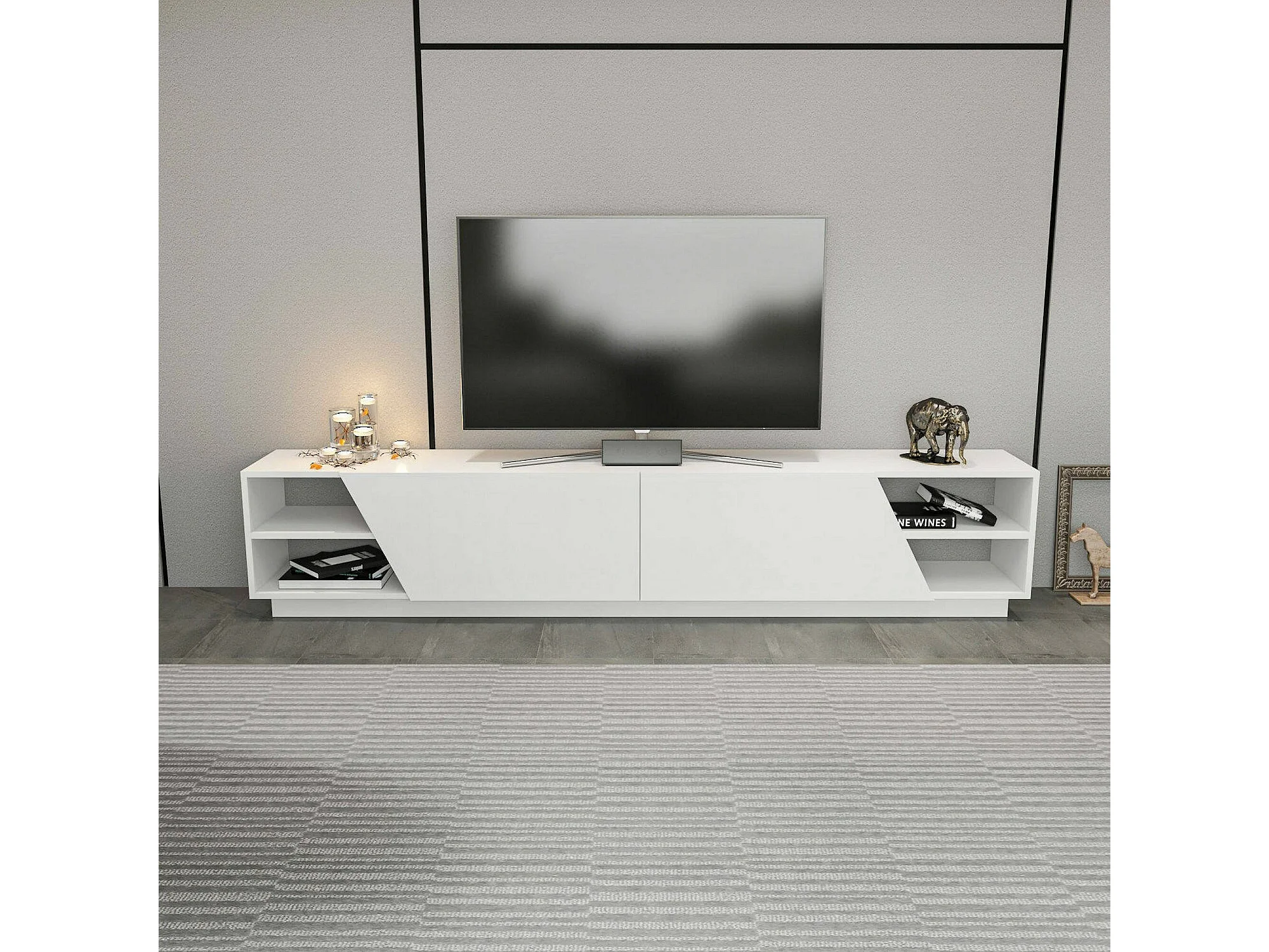 Meuble TV Nyx, Buffet de salon, Armoire basse pour TV, Base murale de rangement, 240x37h47 cm, Blanc