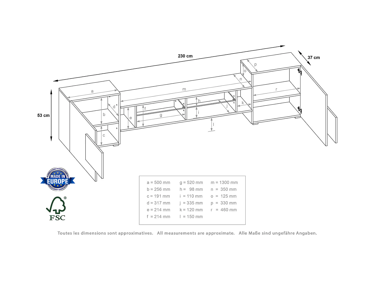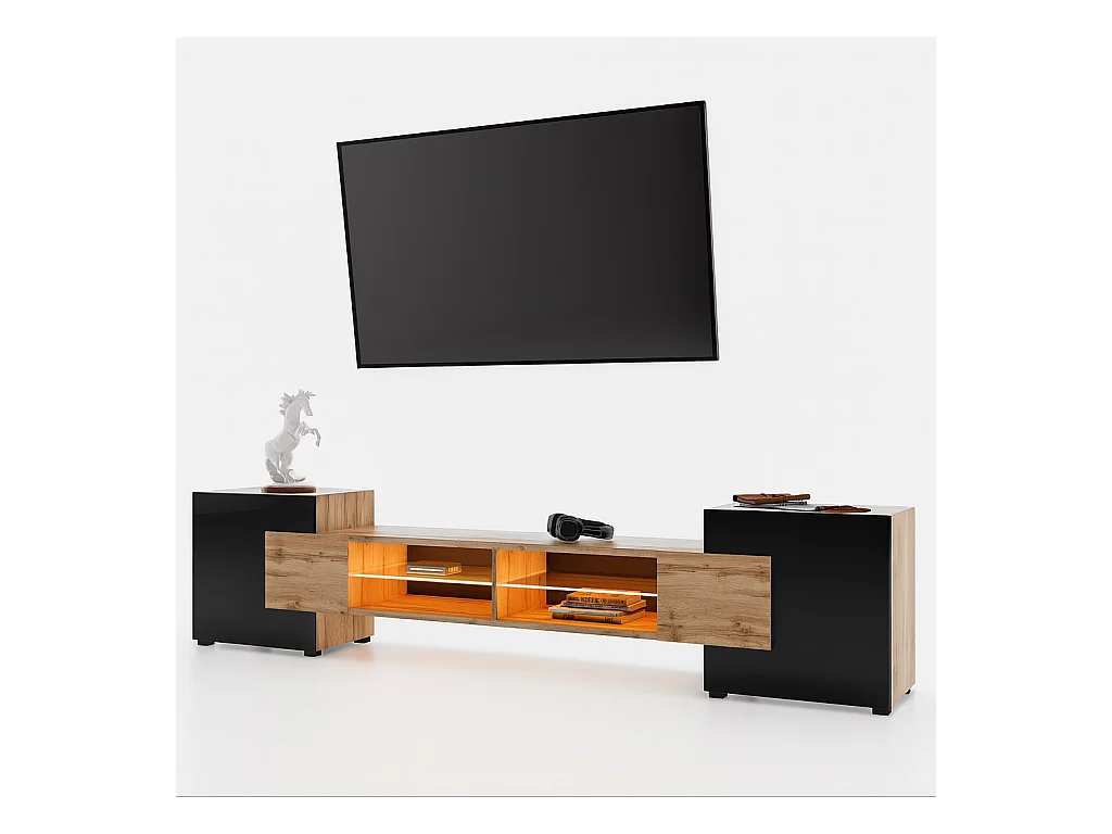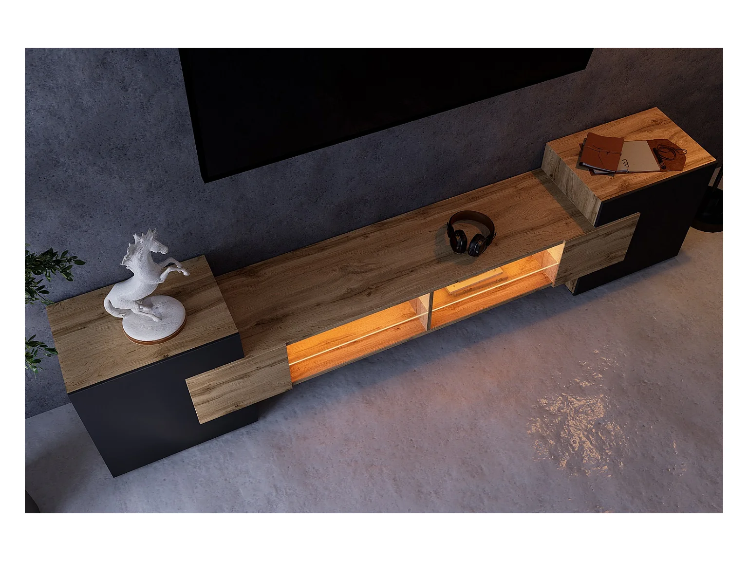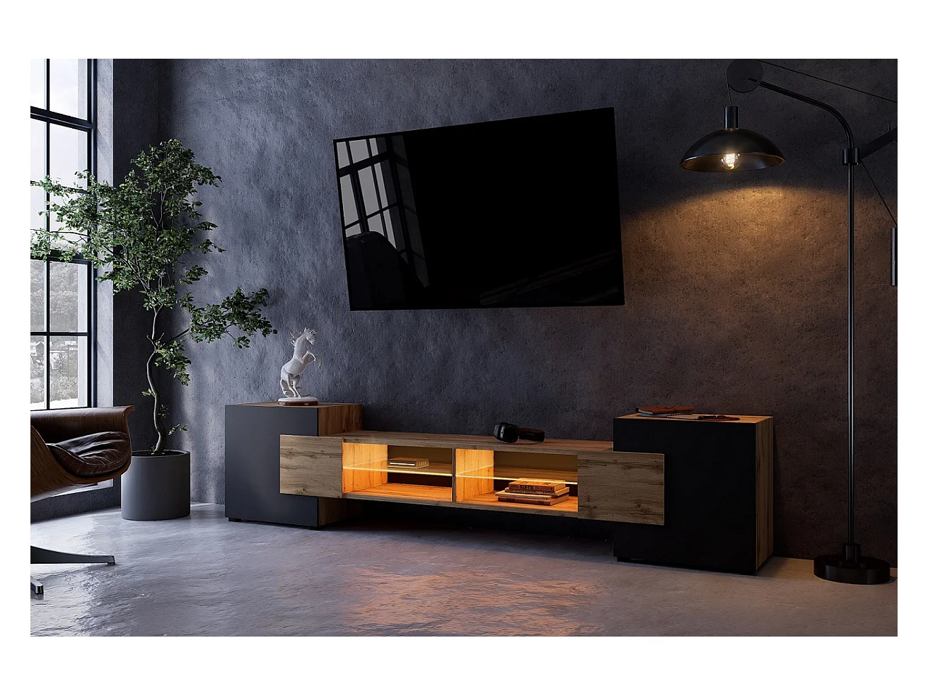Meuble TV PABLO 230 cm Bois Chêne et Noir Mat avec LED RGB