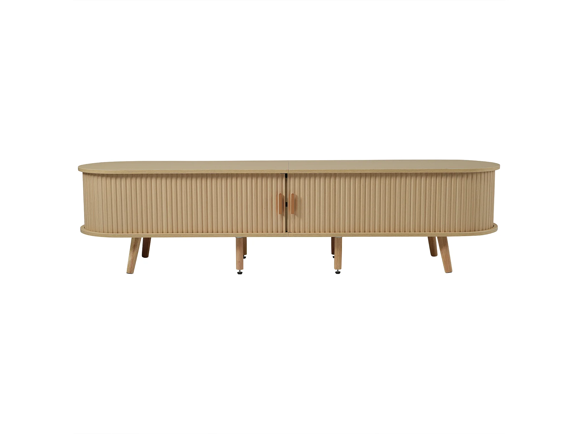 Meuble tv 175x40x42cm salon avec 2 tiroirs et rangement ouvert - plateau ovale mdf - chêne