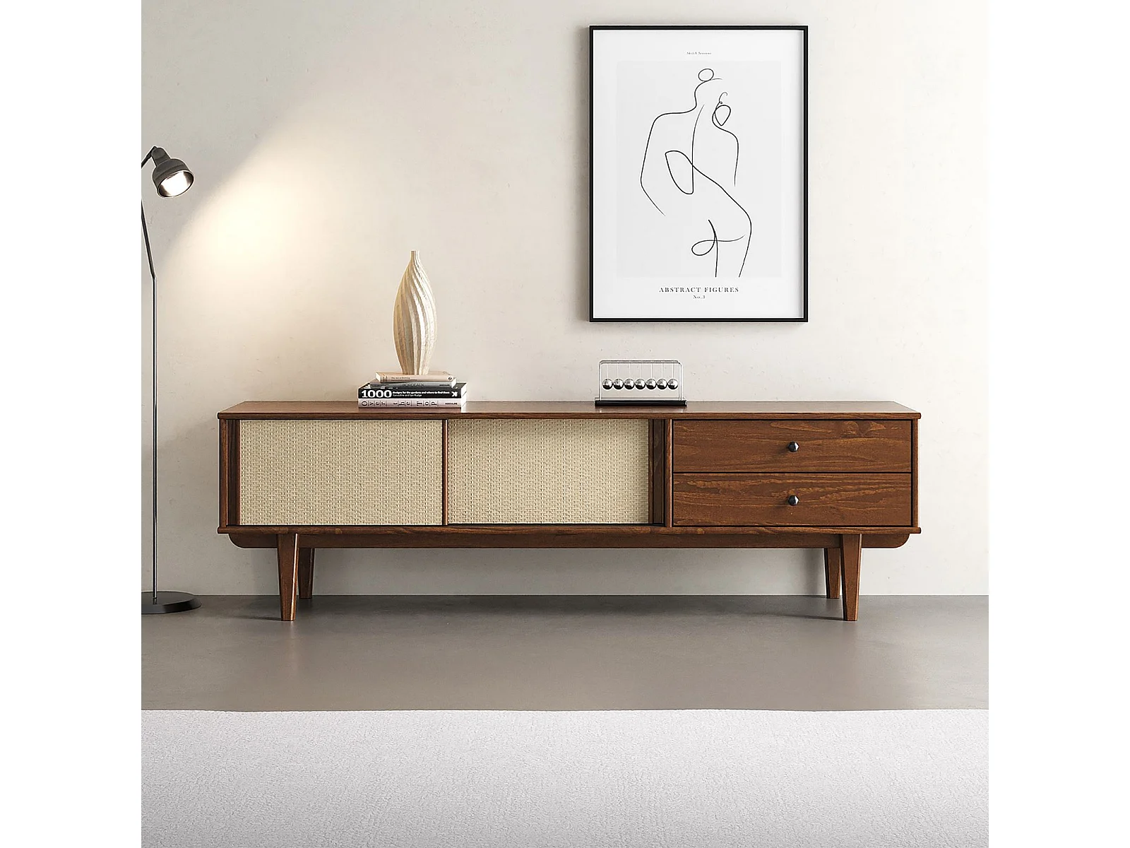 Meuble TV SIMONA L 175 cm en bois massif coloris châtaignier avec 2 Tiroirs 2 Portes Coulissantes, Pour TV jusqu'à 75"