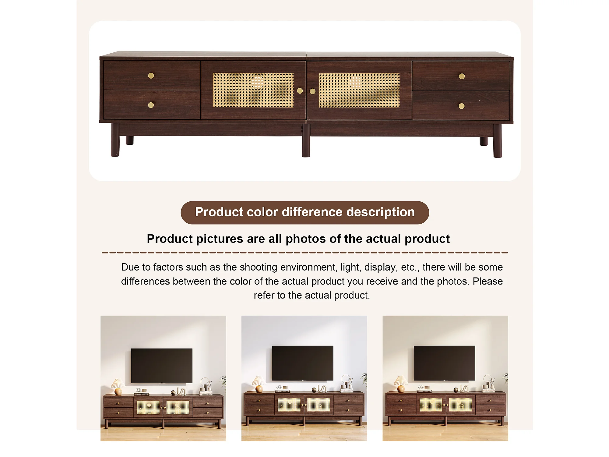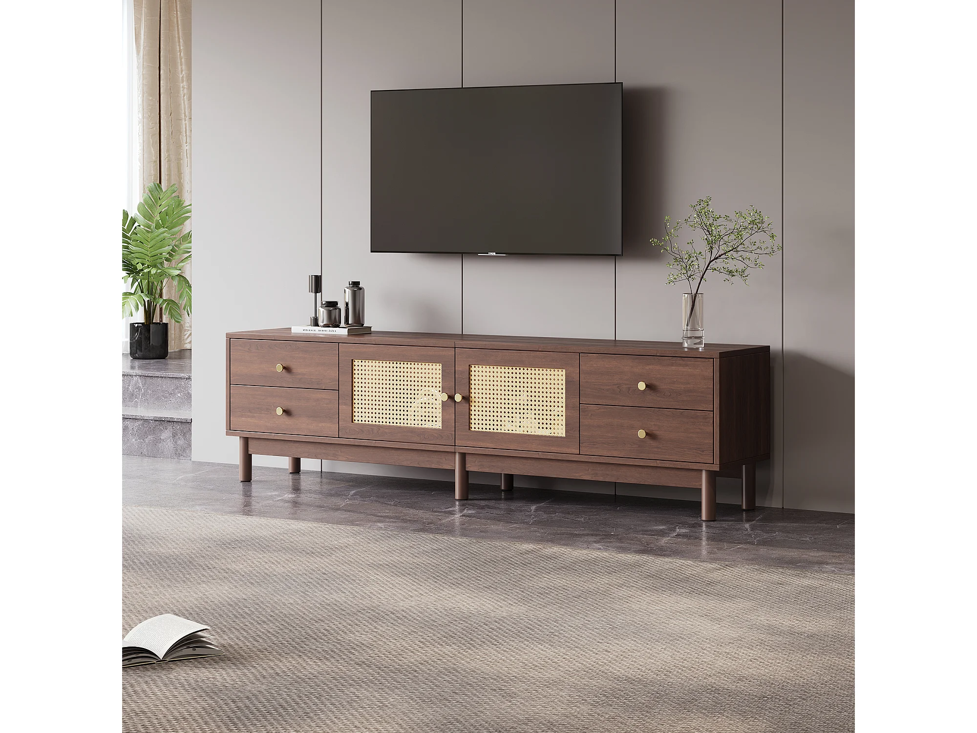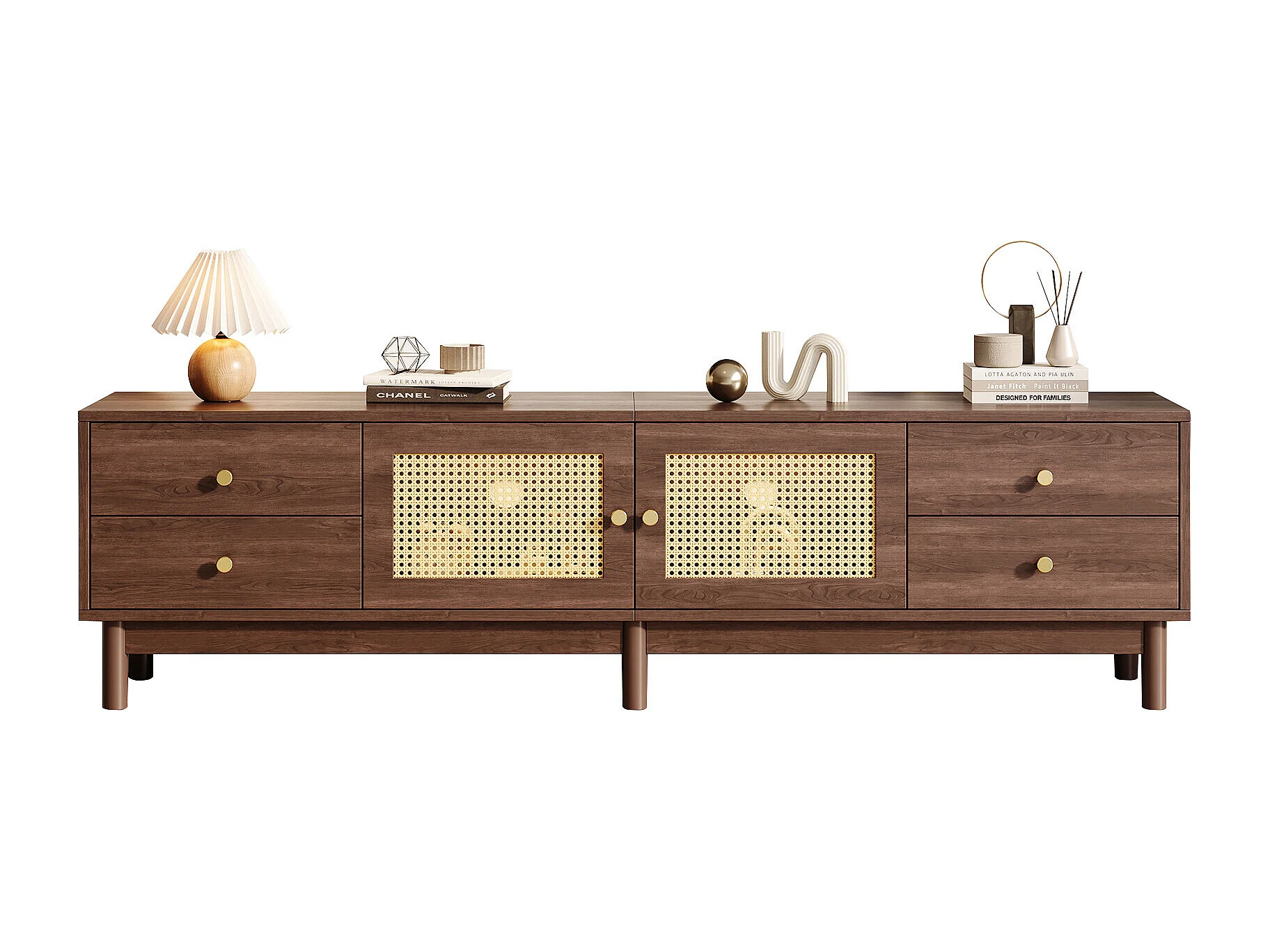 Meuble TV style vintage effet bois noyer avec 2 portes en rotin, 4 tiroirs 180*35*44cm KUQON