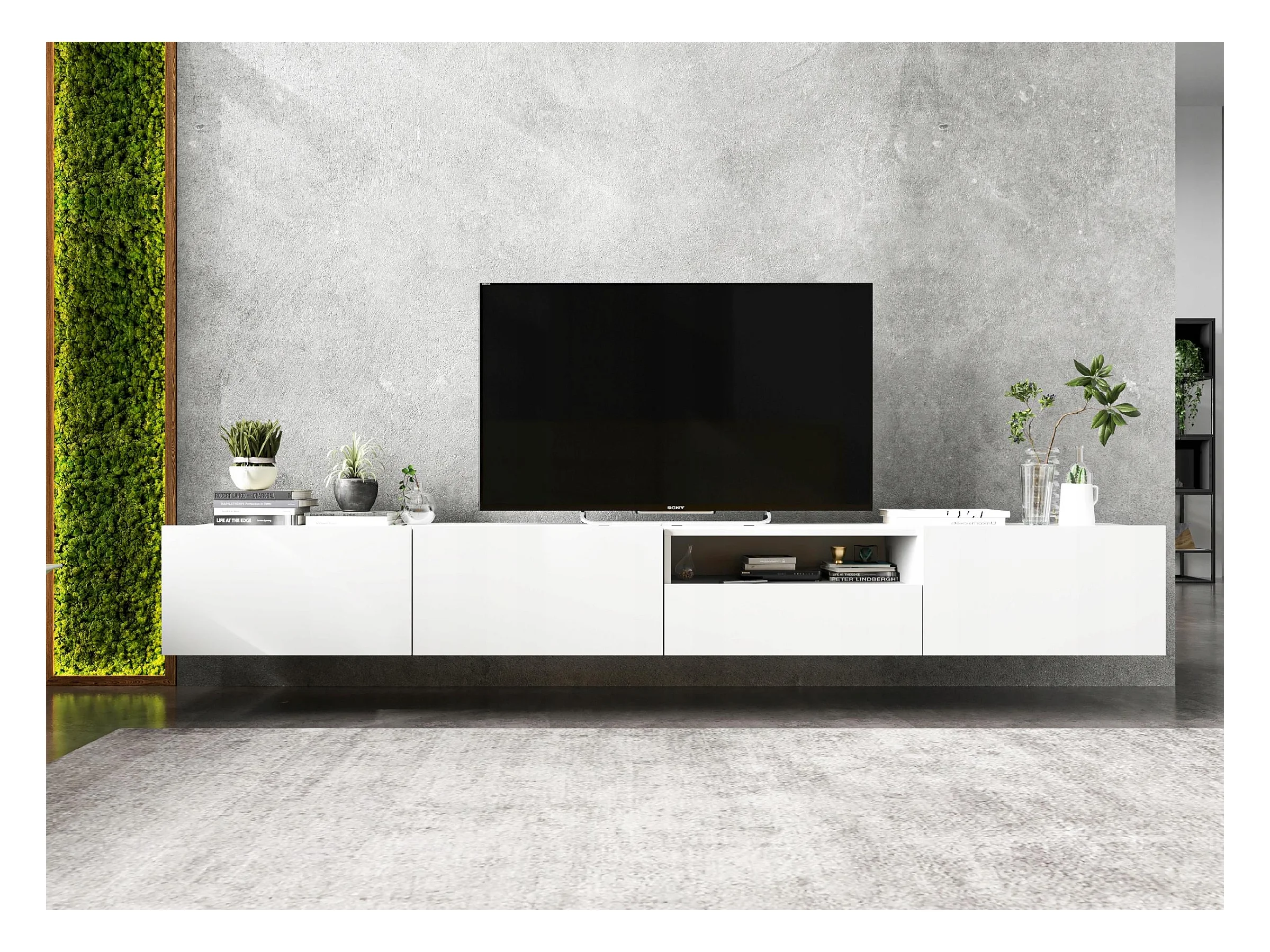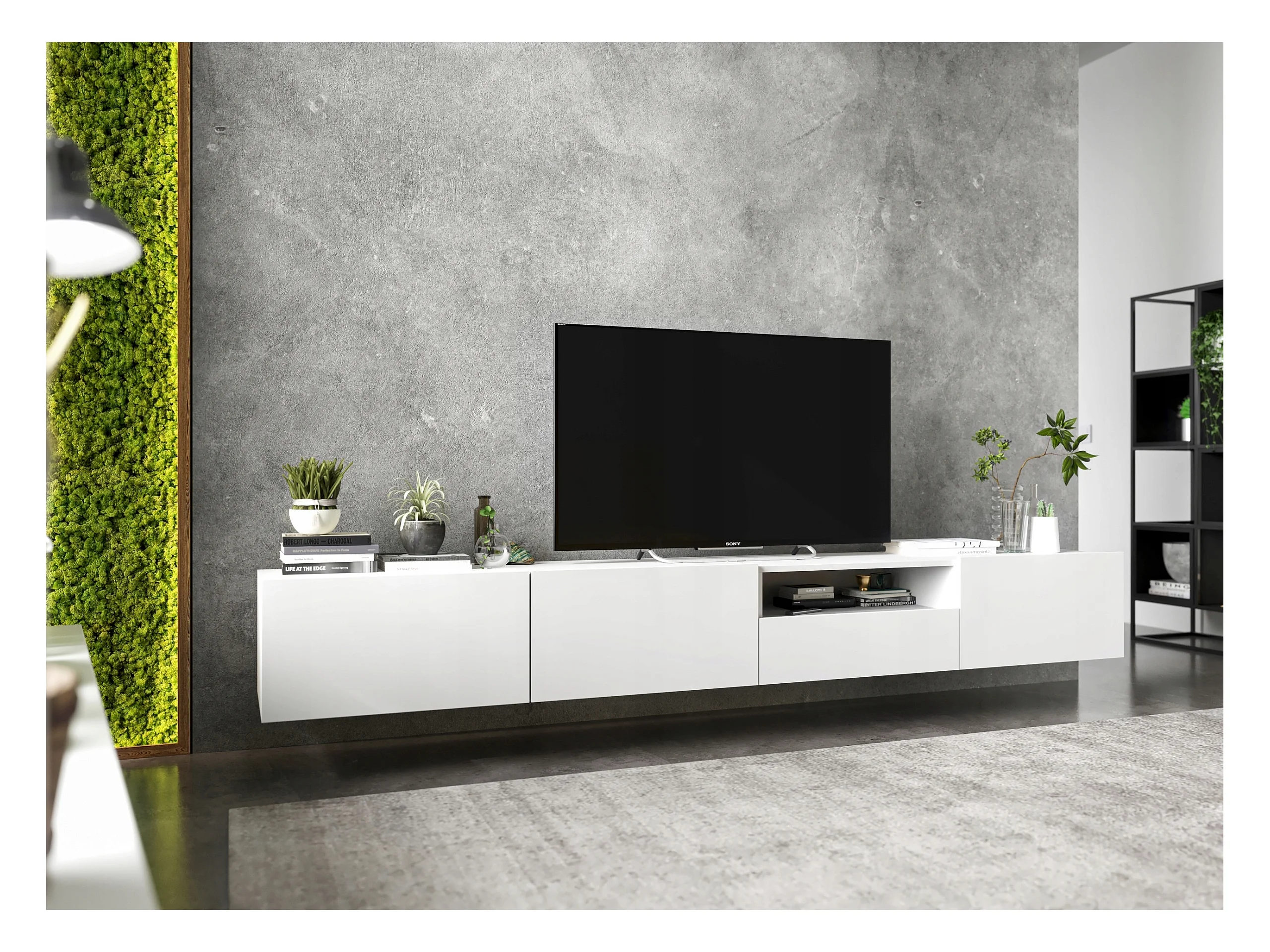 Meuble TV suspendu avec 3 portes et niche, tiroir - corps Blanc mat, façades Blanc mat - 240 cm