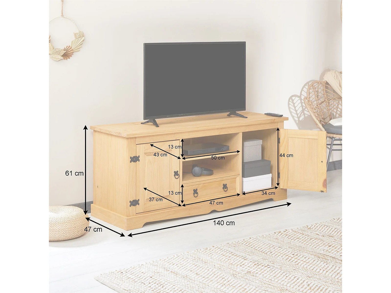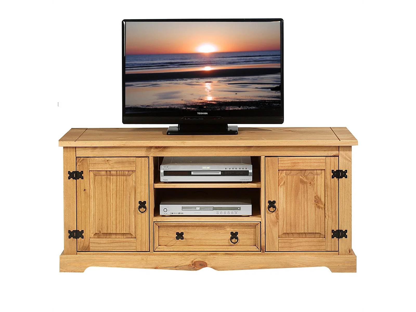 Meuble TV TEQUILA banc télé de 140 cm style mexicain avec 1 tiroir 2 niches et 2 portes, en pin massif finition teintée/cirée