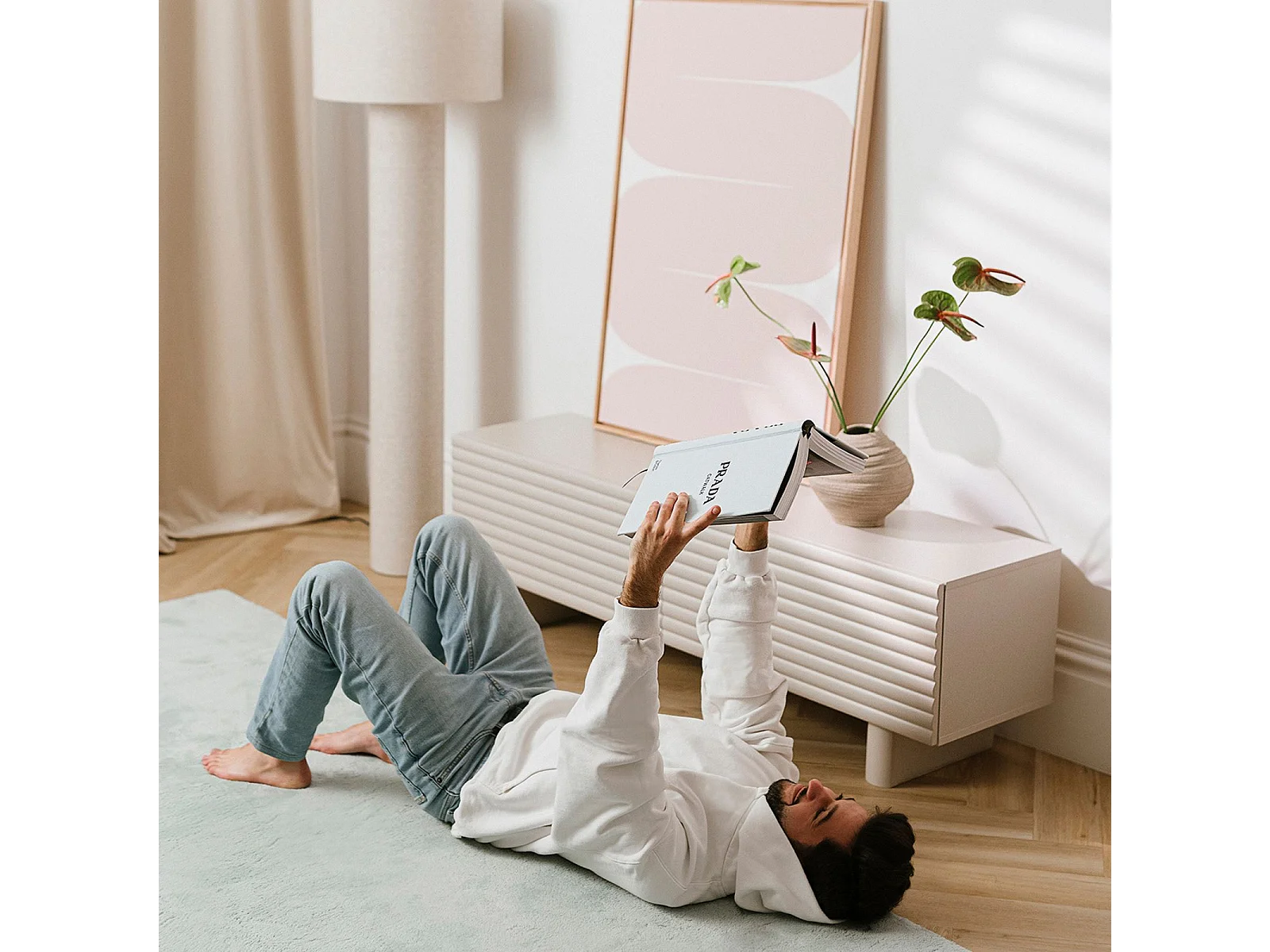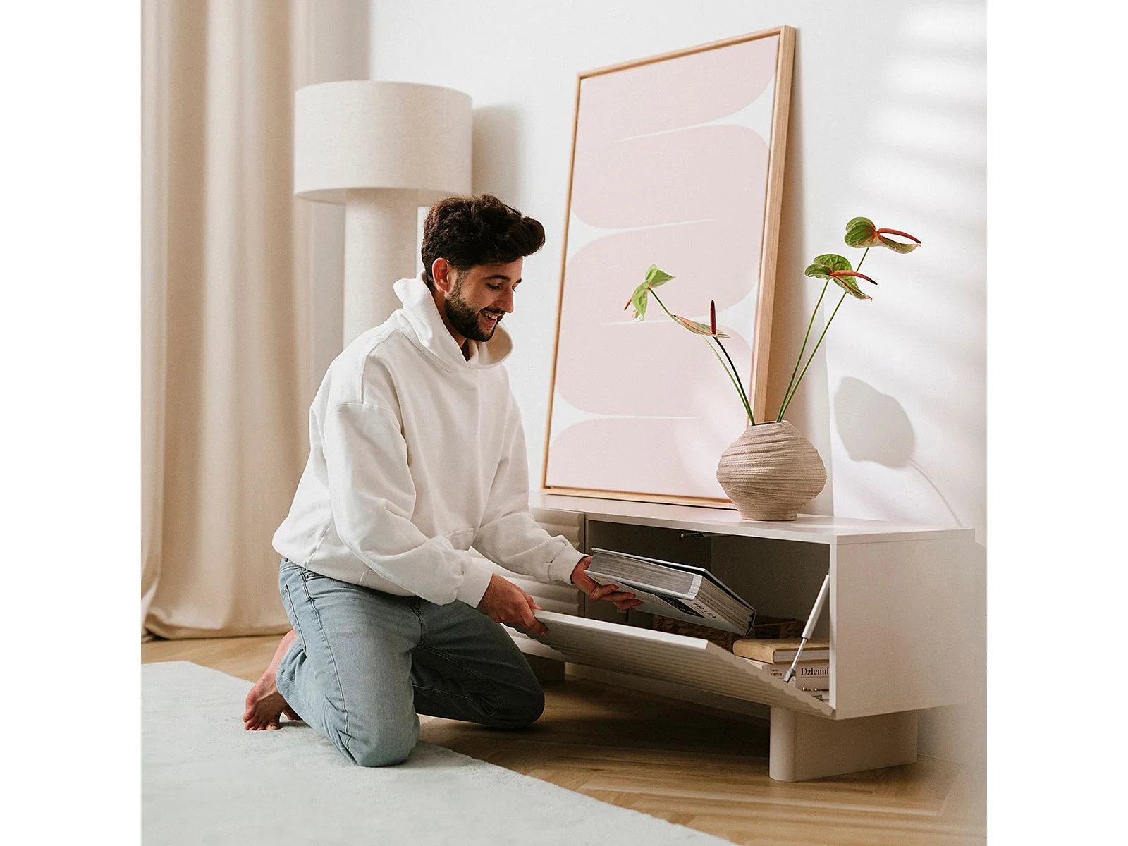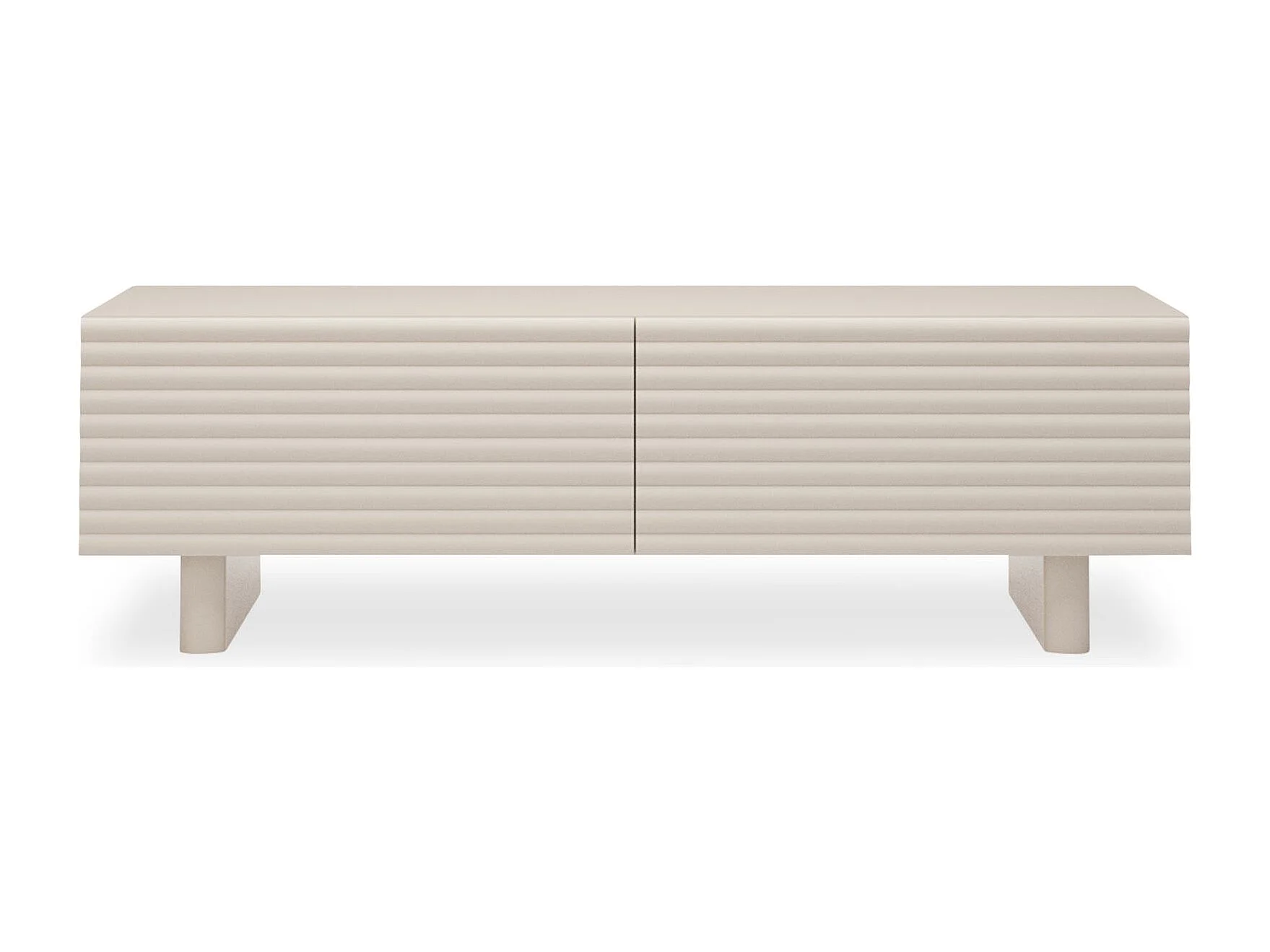 Meuble TV TURKU L 150 cm avec 2 Portes Style Cannelé Couleur Blanc Cachemire, Design Moderne et Façade Rainurée