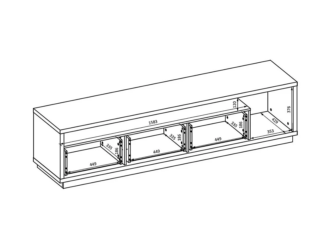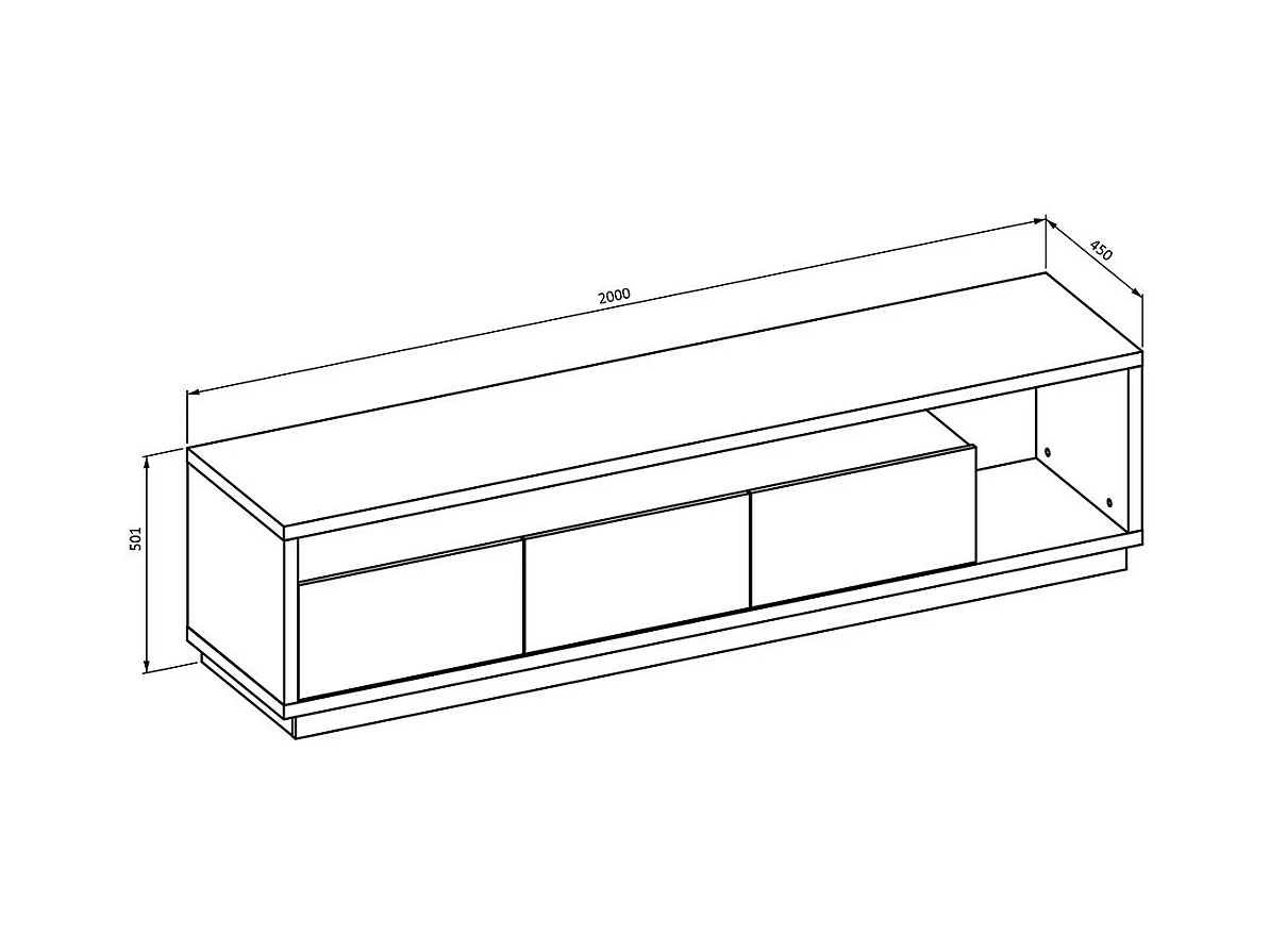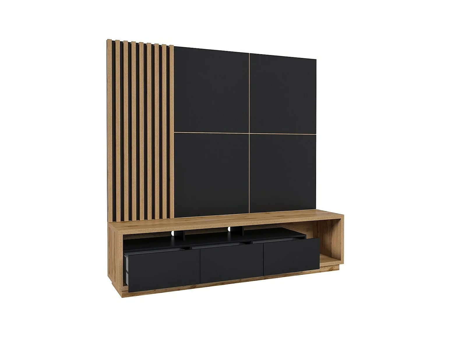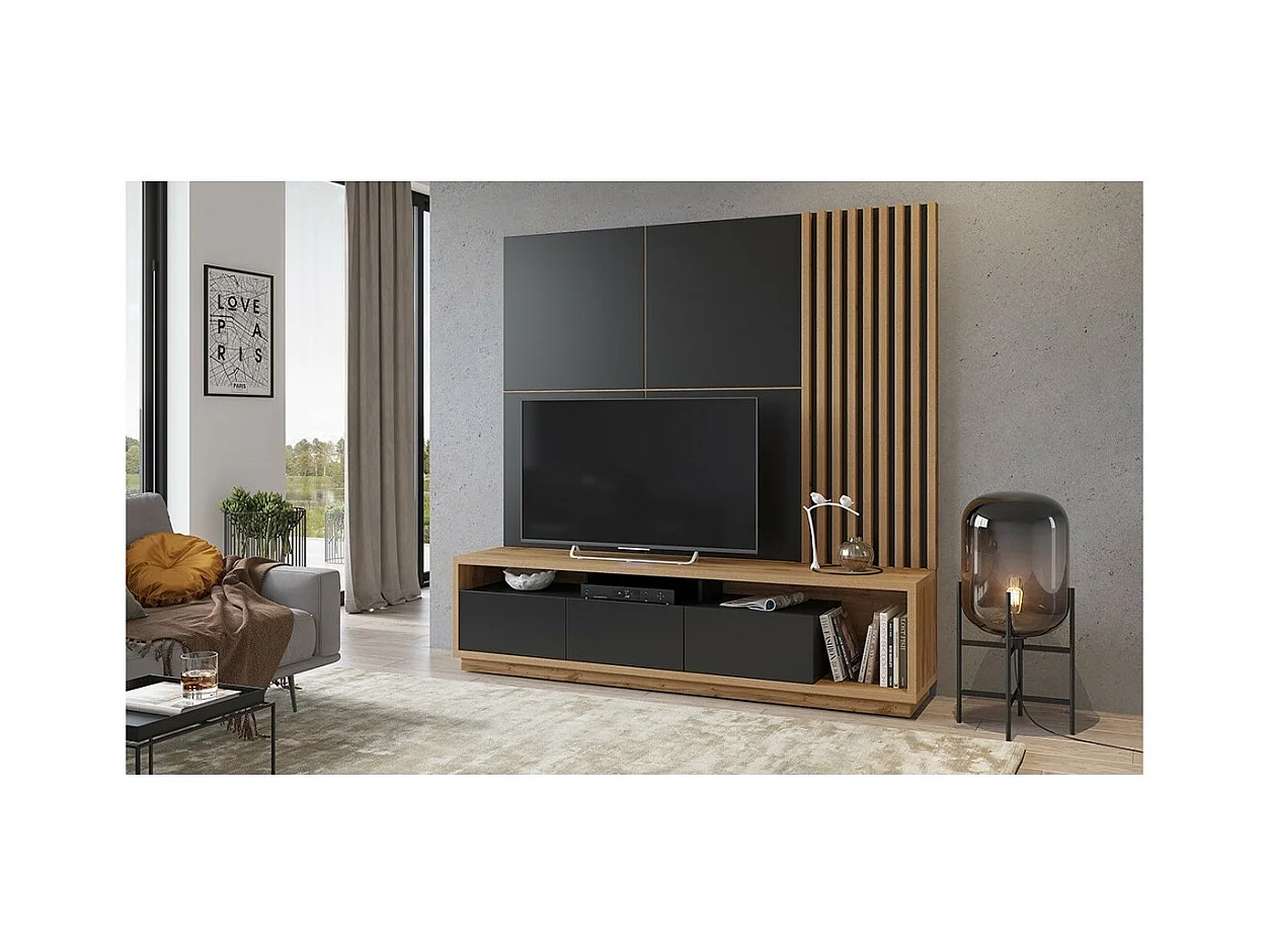 Meuble TV XL avec fond mural décoratif collection CLARA. Couleur chêne et noir mat.