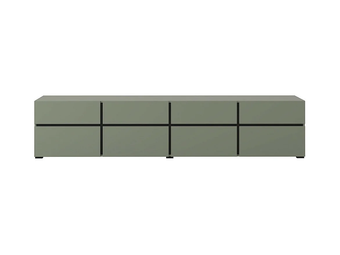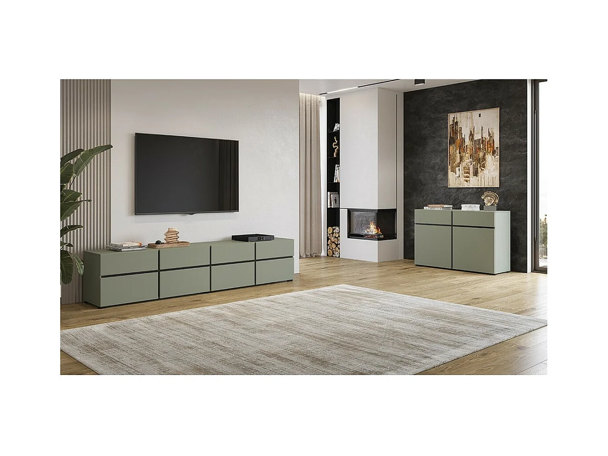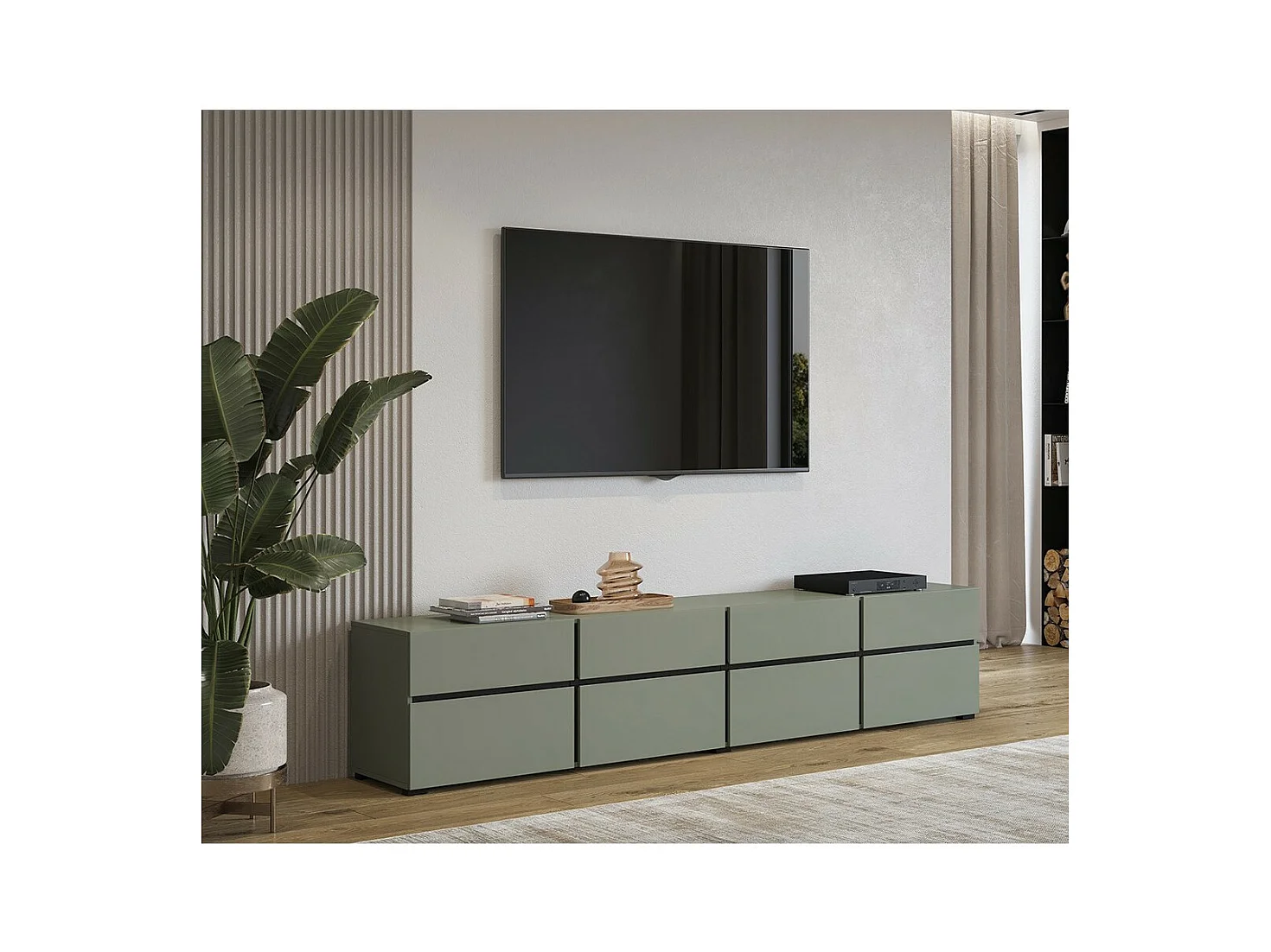 Meuble TV XL coloris vert sauge et noir 225cm collection HAVANA. Meuble design avec 4 portes et 4 tiroirs.