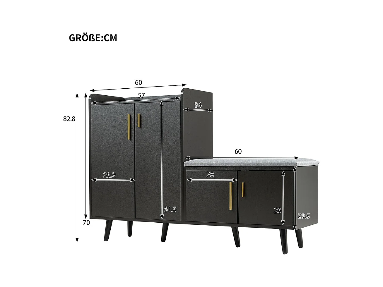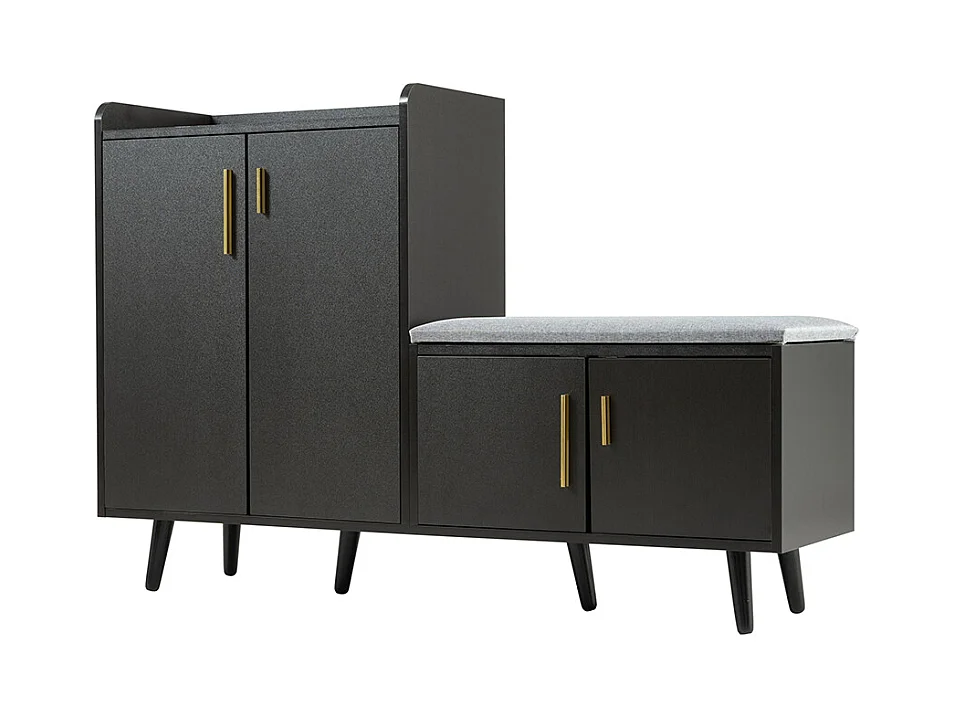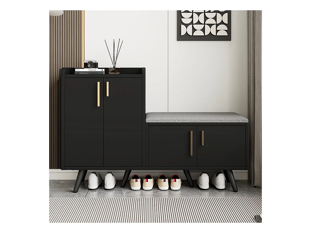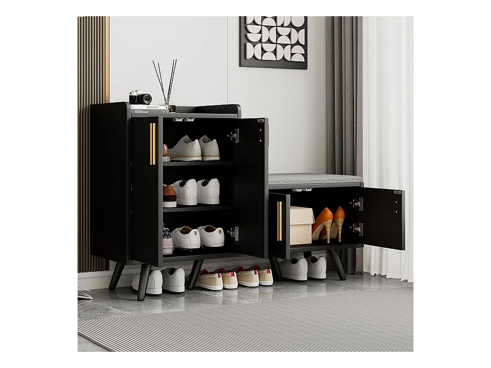 Meuble à chaussures noir 2 en 1 portes cintrées rabattable soft close compartiments réglables banc rembourré