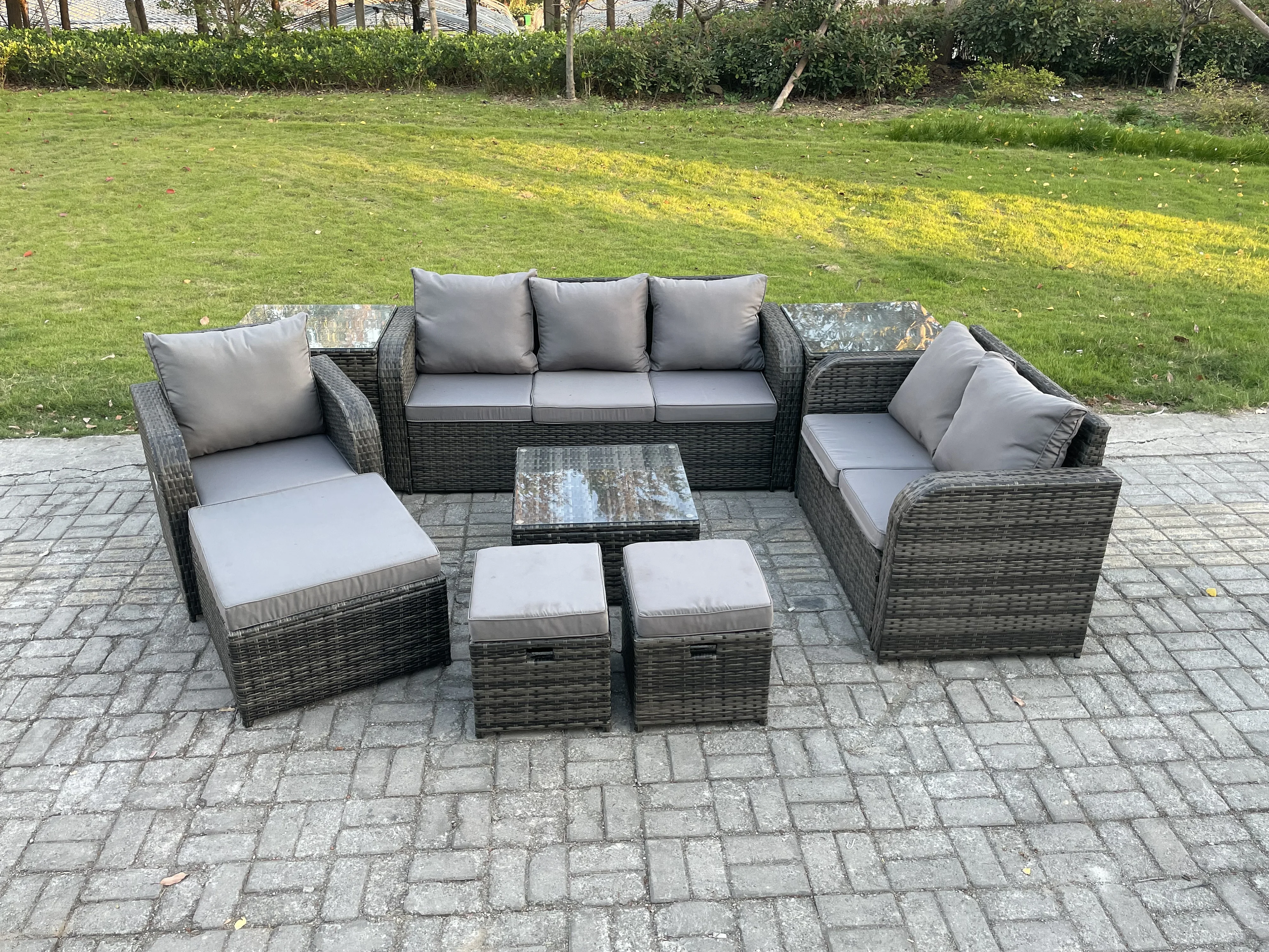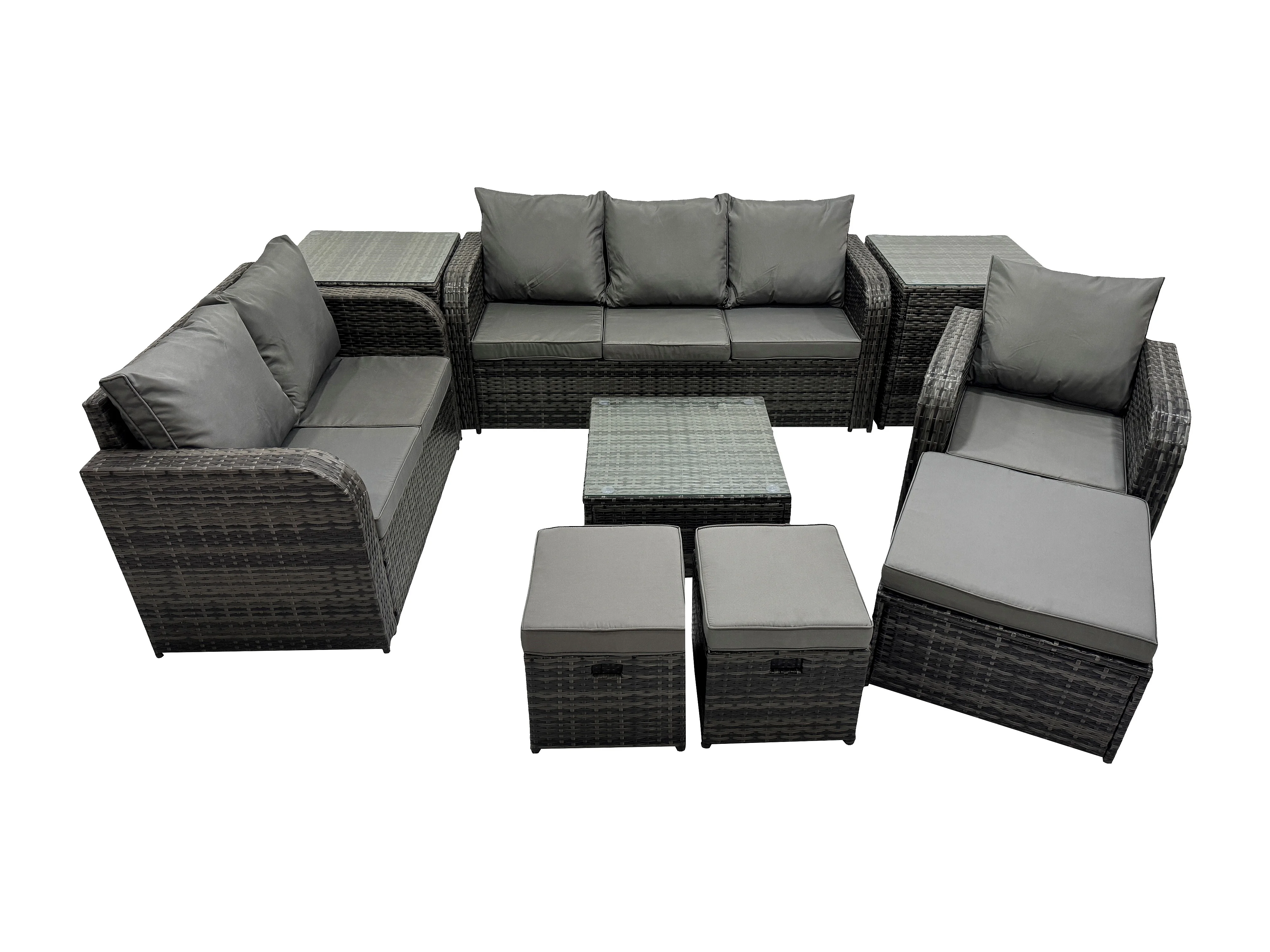Meubles de jardin en rotin 9 Pièces avec Table basse carrée Chaise inclinable Canapé d'amour Side Canapé 3 places 3 Tabourets 2 Tables d'appoint