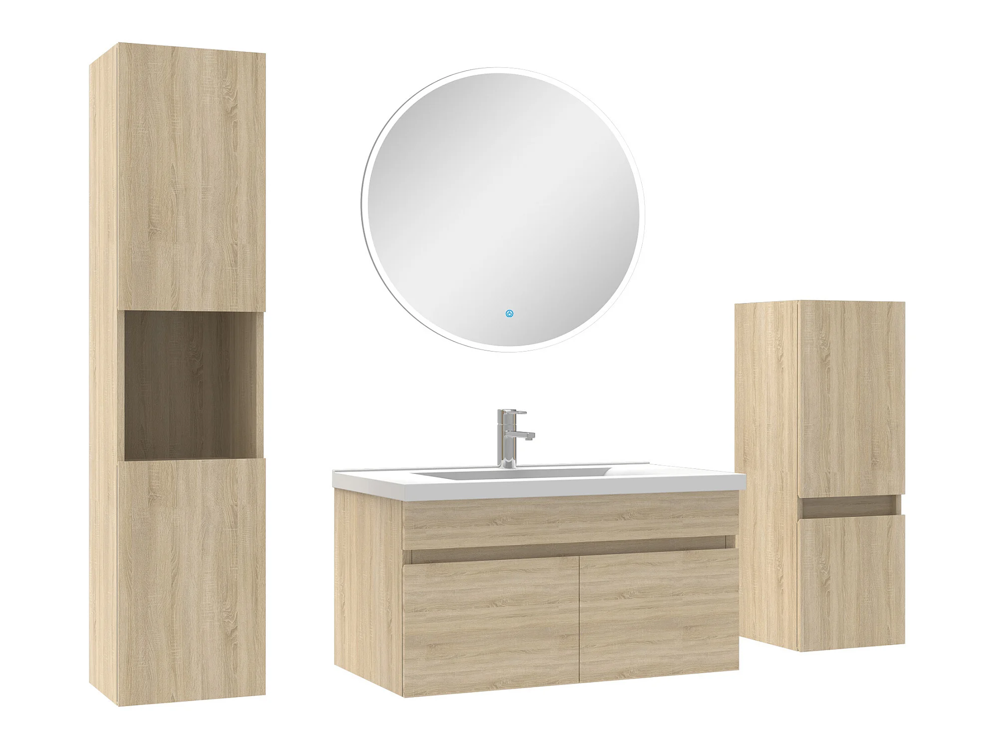 Meubles simple vasque 80cm,meuble acve colonne et miroir rond Chêne Wotan