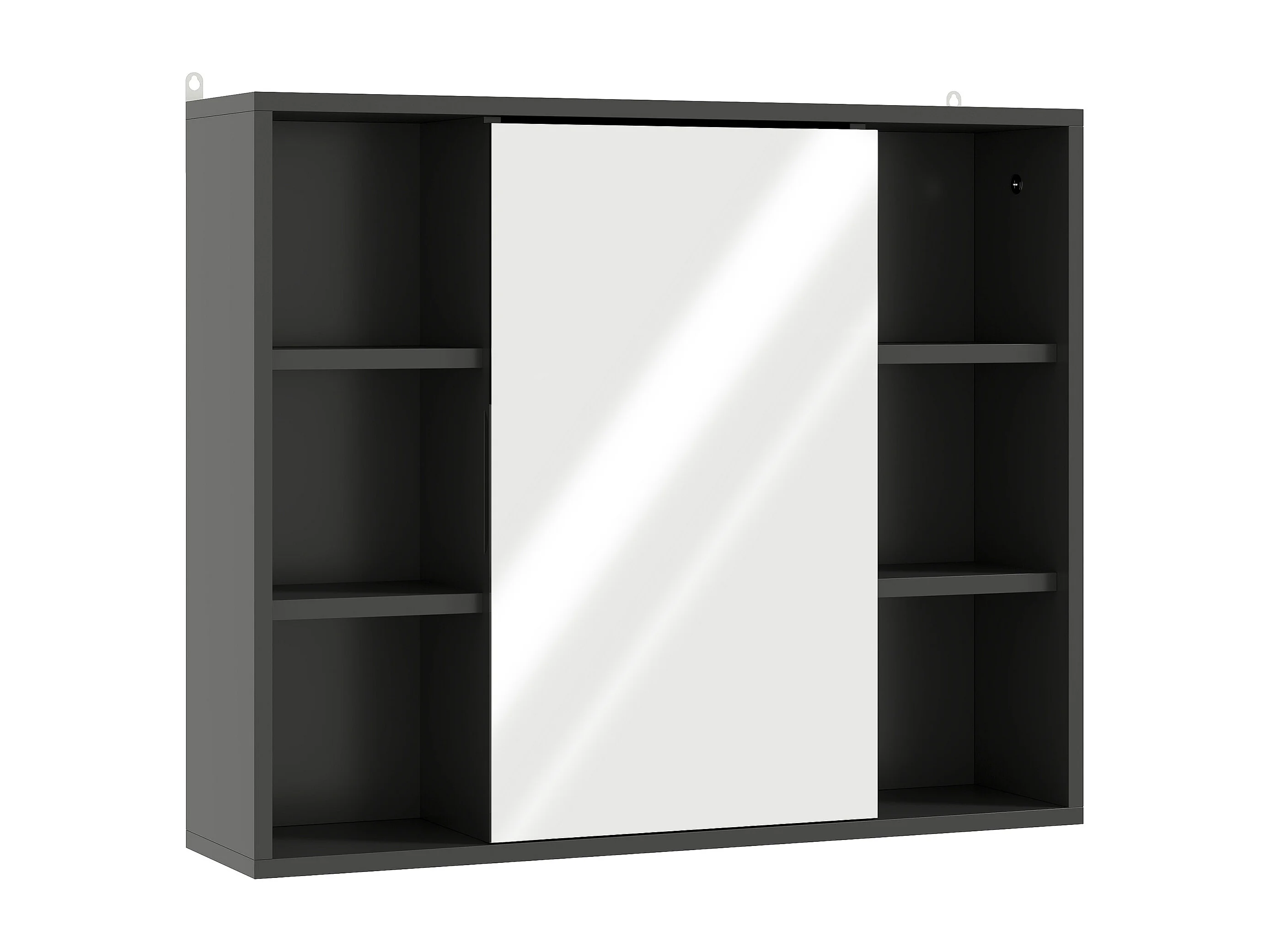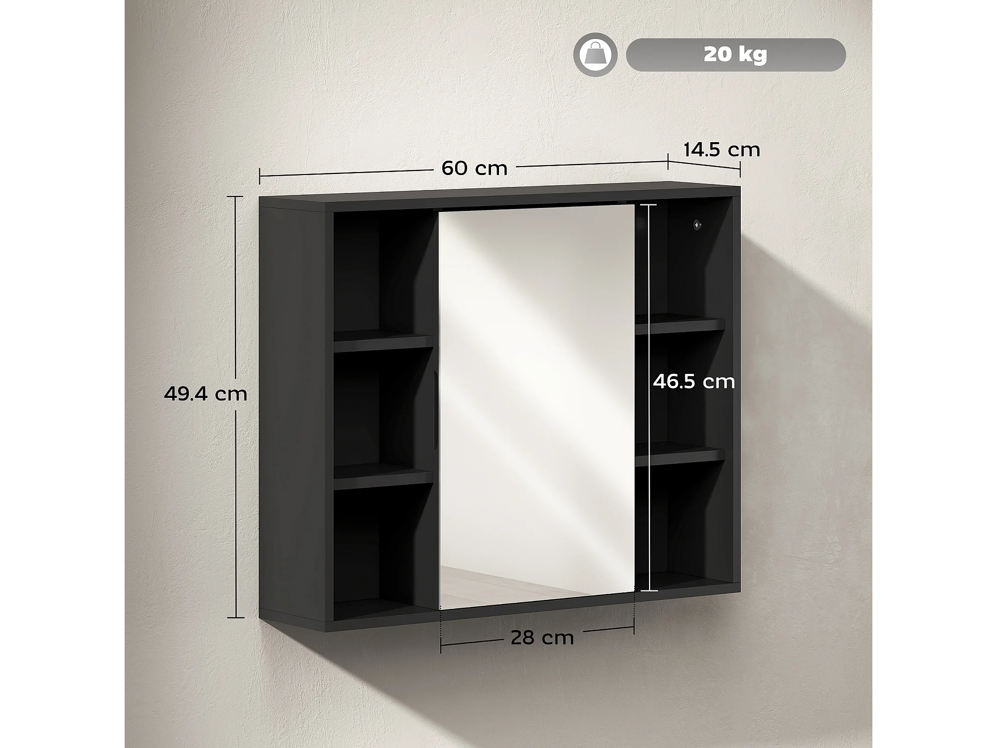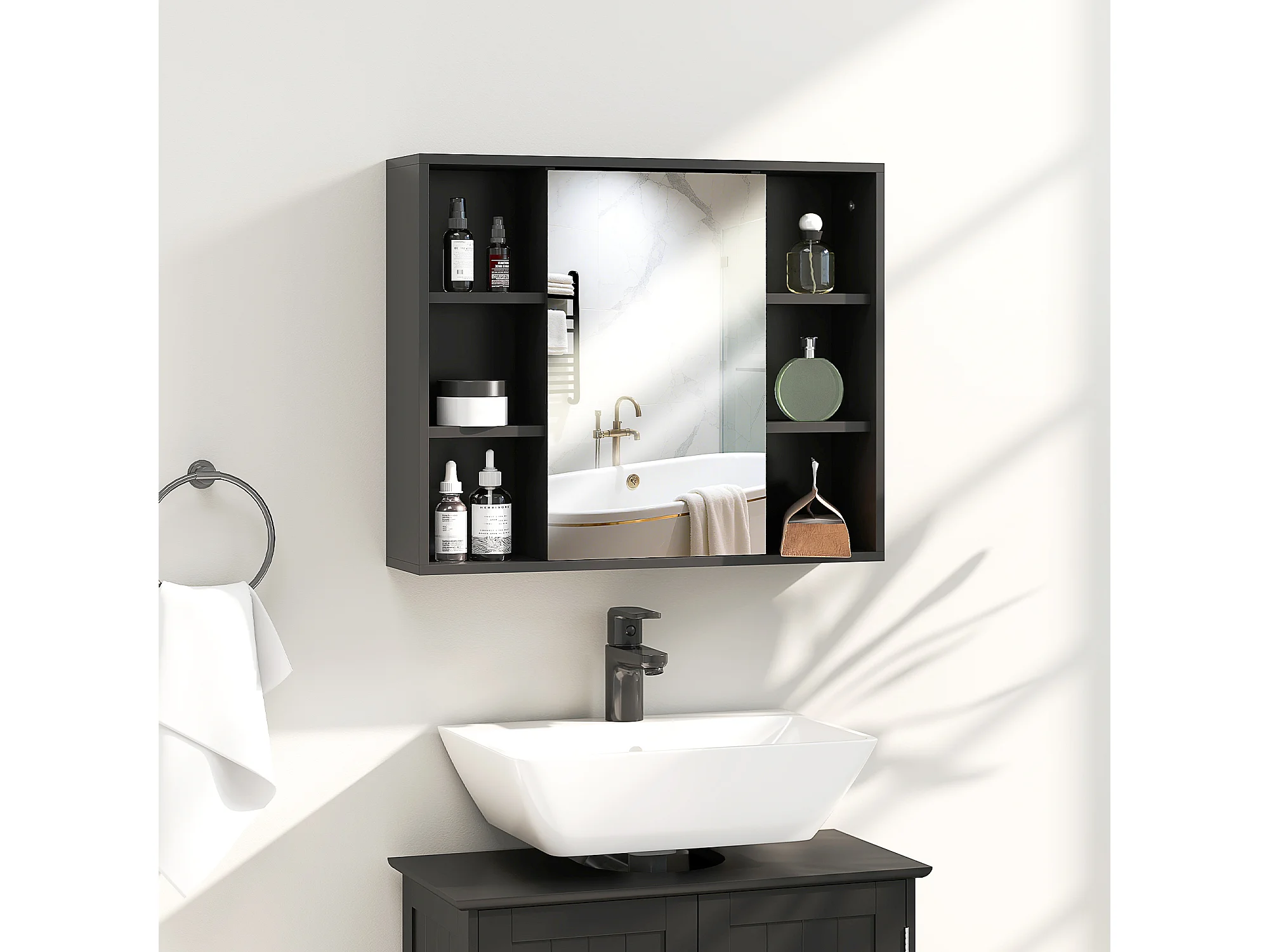 Miroir de salle de bain avec placard et étagères - 4 étagères latérales + 2 étagères intérieures - MDF panneaux particules noir