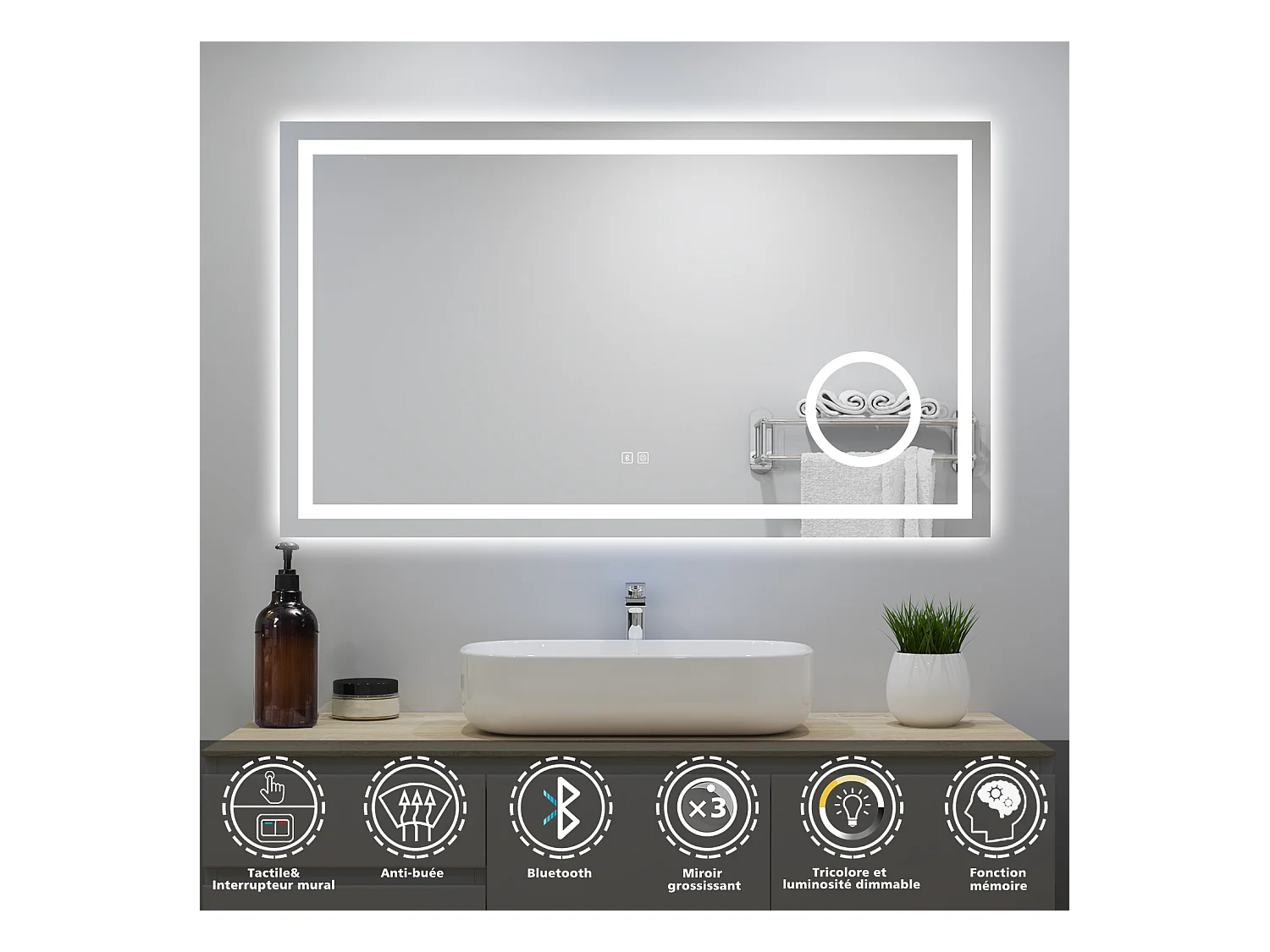 Miroir Lumineux avec Bluetooth 140 x 80cm, 3 Couleurs + Dimmable + Anti-buée + grossissant 3x,Mural Miroir Salle de Bain