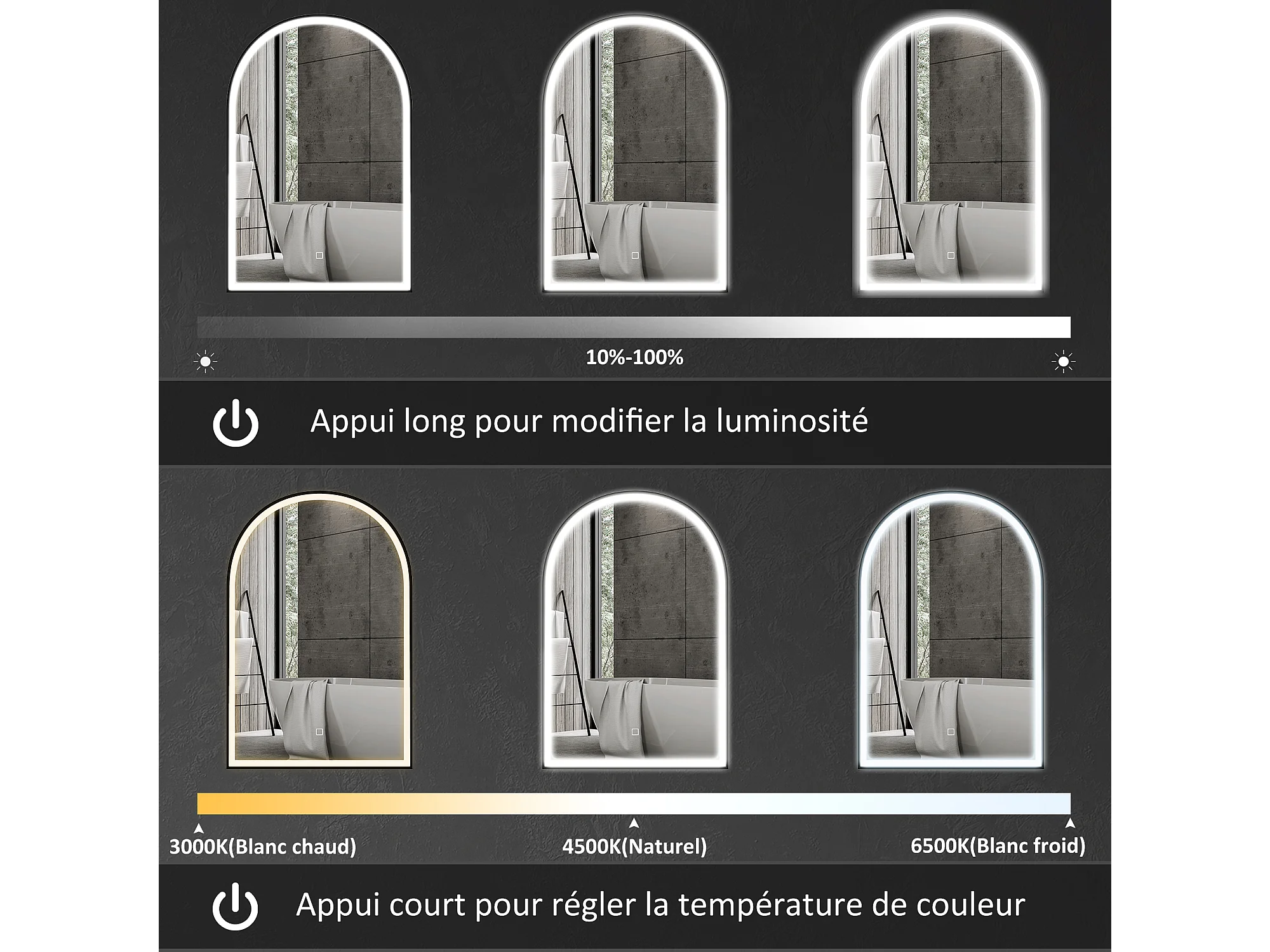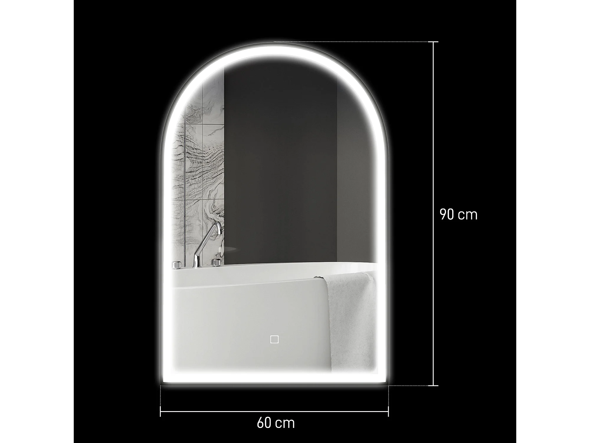 Miroir lumineux LED arqué de salle de bain 90 x 60 cm - tactile, réglable, anti-buée - alu noir