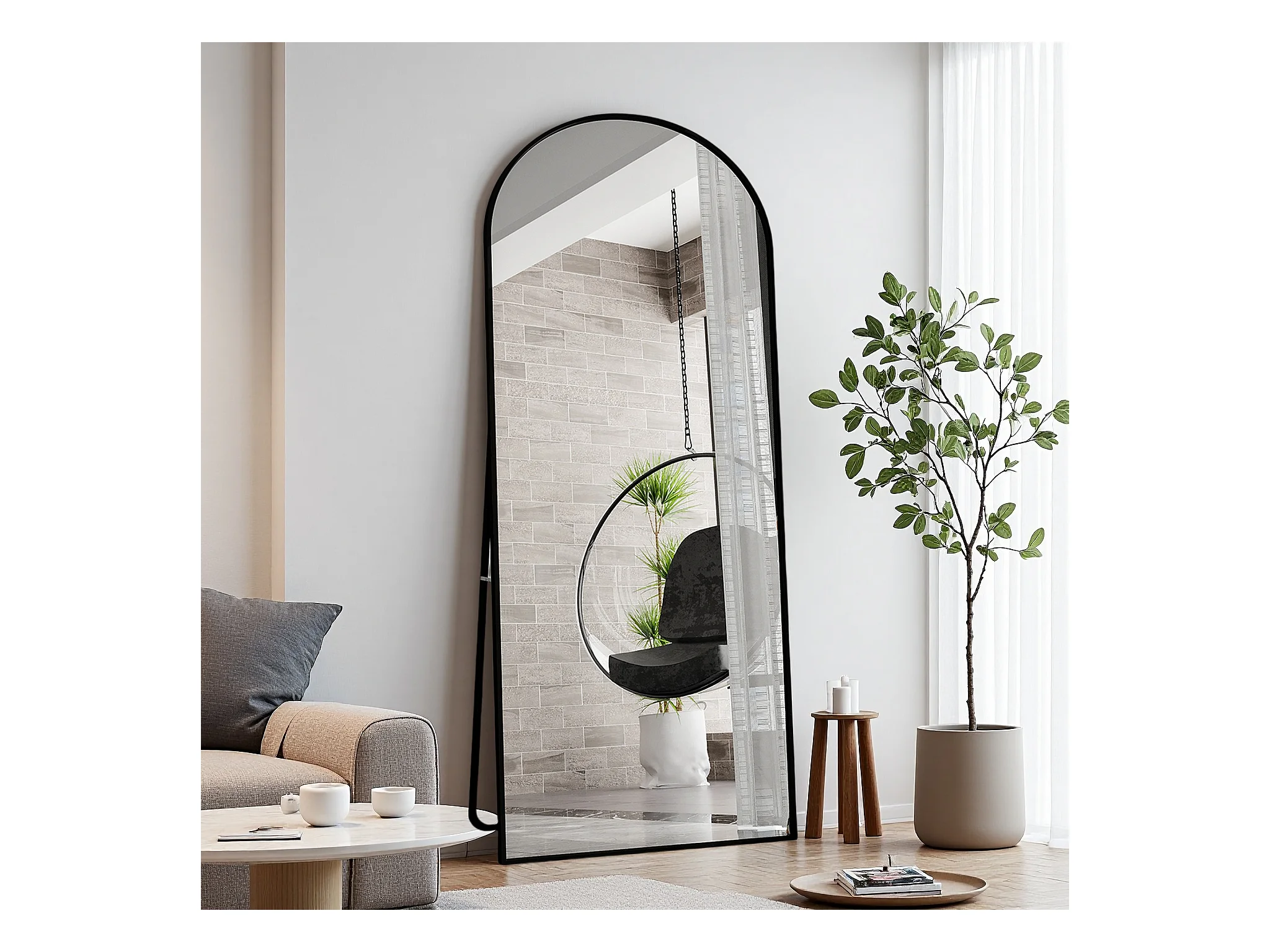 Miroir pleine longueur 180 x 80 cm en verre trempé avec cadre en aluminium noir, forme arquée, grand miroir de sol