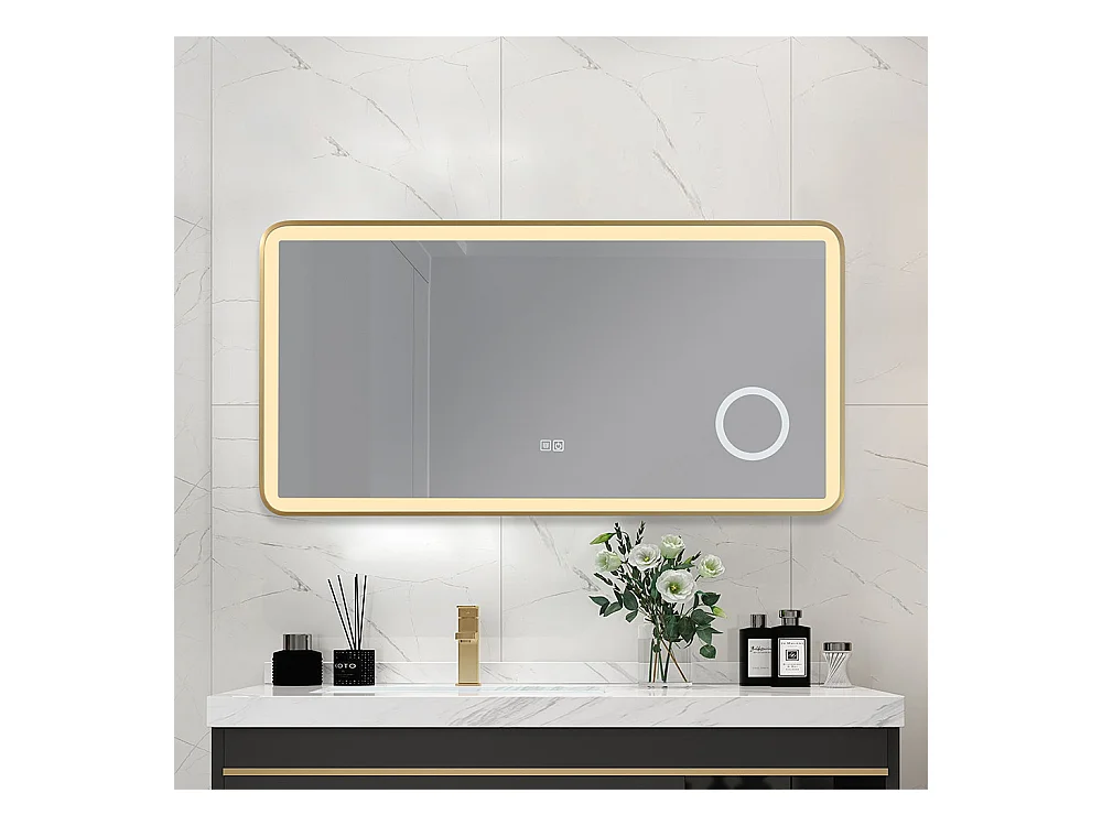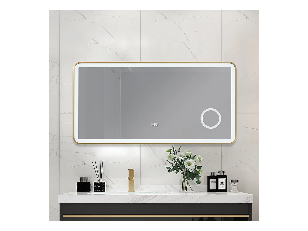 Miroir salle de bain LED 90x60cm anti buée avec cadre en aluminium doré et loupe x3 LB-4685G