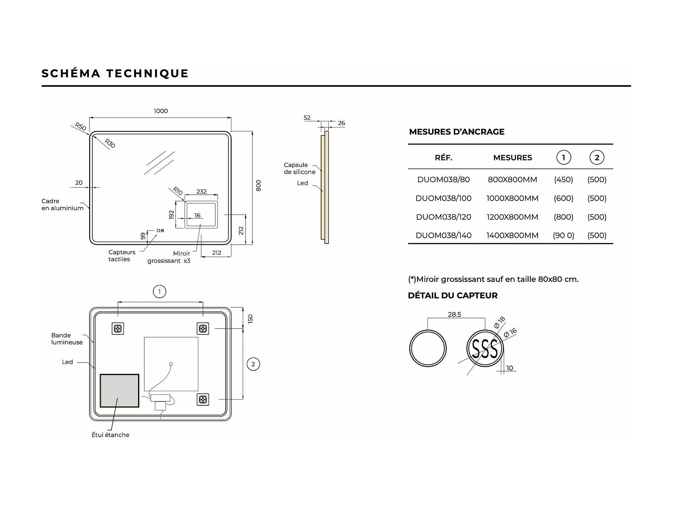 Miroir Led DUOMO Moka 100X80cm - T° Led Variable Rétro-éclairé & Frontal - Tactiles On/Off & Anti-Buée - Zone X3 - LEDIMEX