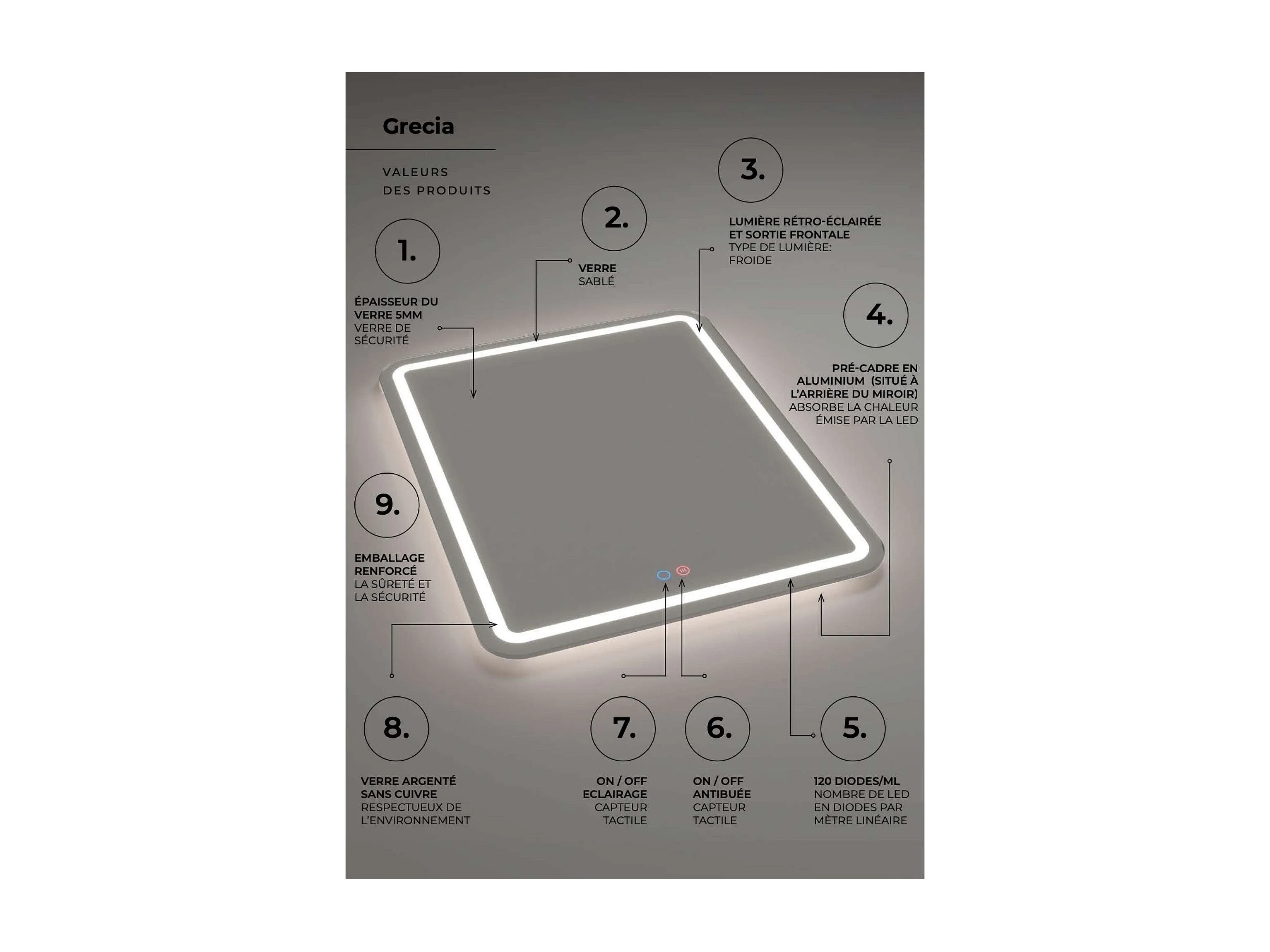 Miroir Salle de Bain GRECIA - 80x80cm - Led Rétro-éclairé & Diffusion Frontal - Tactiles On/Off & Anti-Buée - LEDIMEX