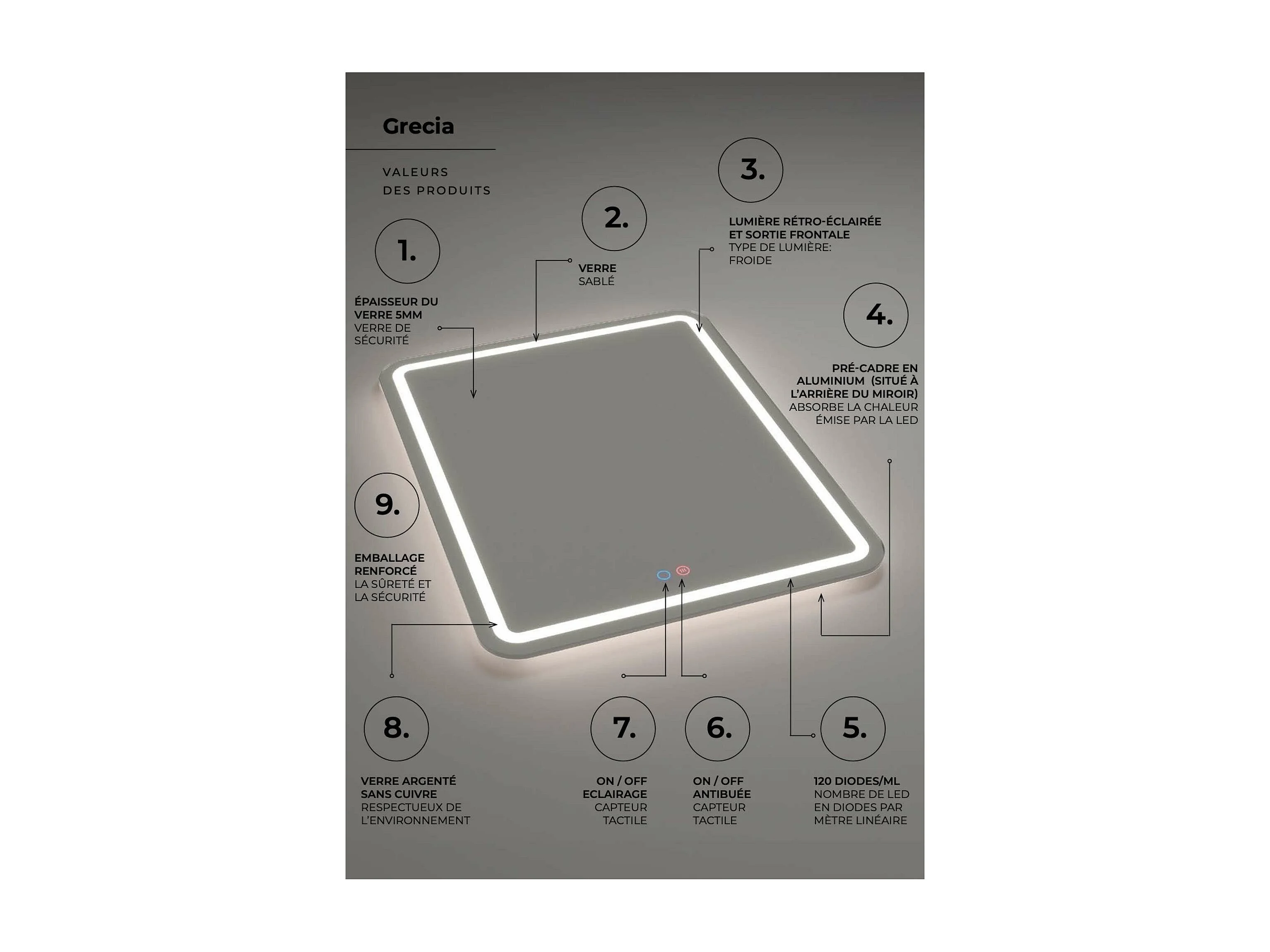 Miroir Salle de Bain GRECIA - 90x80cm - Led Rétro-éclairé & Diffusion Frontal - Tactiles On/Off & Anti-Buée - LEDIMEX