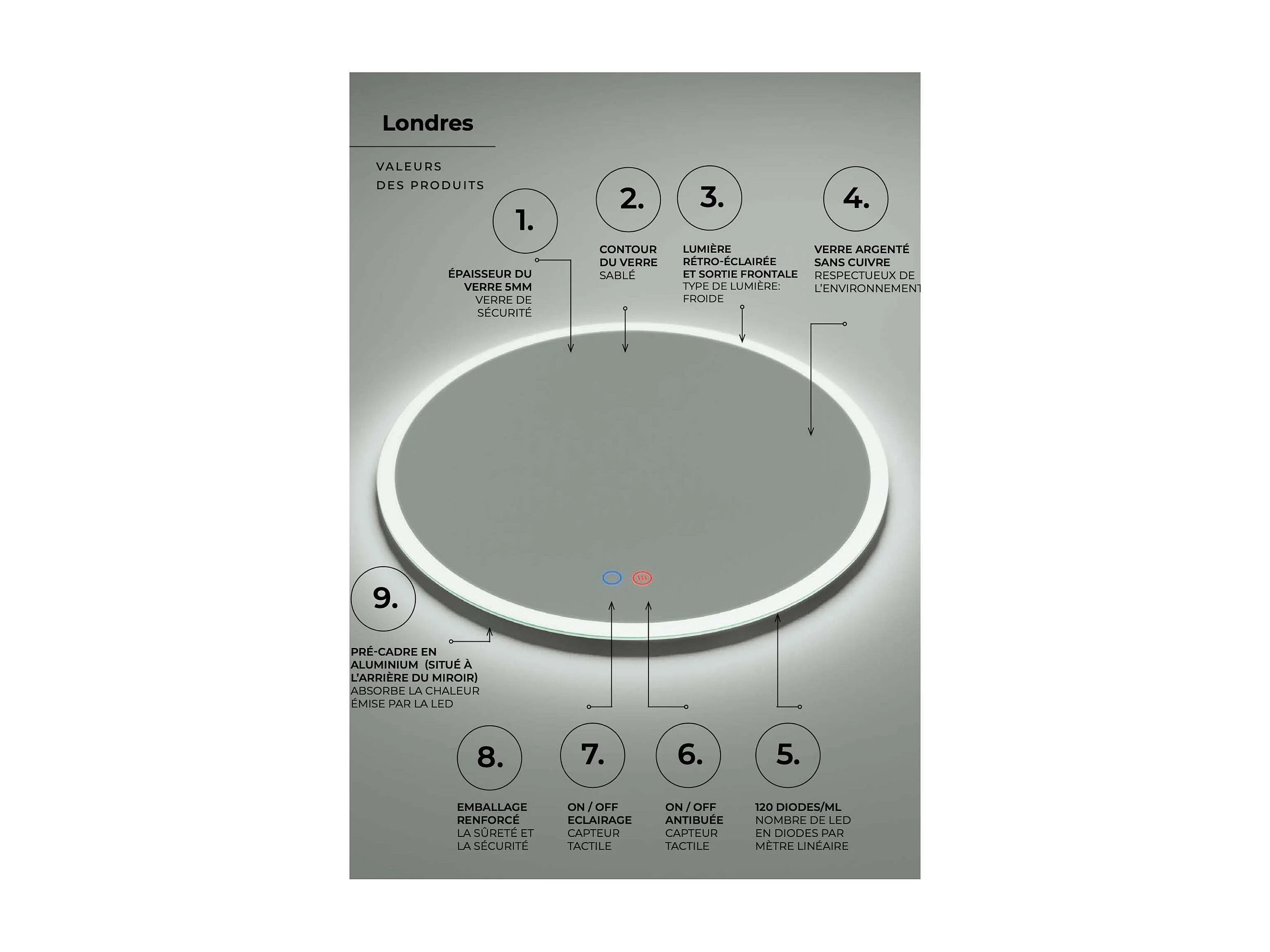 Miroir Salle de Bain LONDRES - Ø50 - Led Rétro-Éclairé (6500K) - Tactiles On/Off & Anti-Buée - LEDIMEX