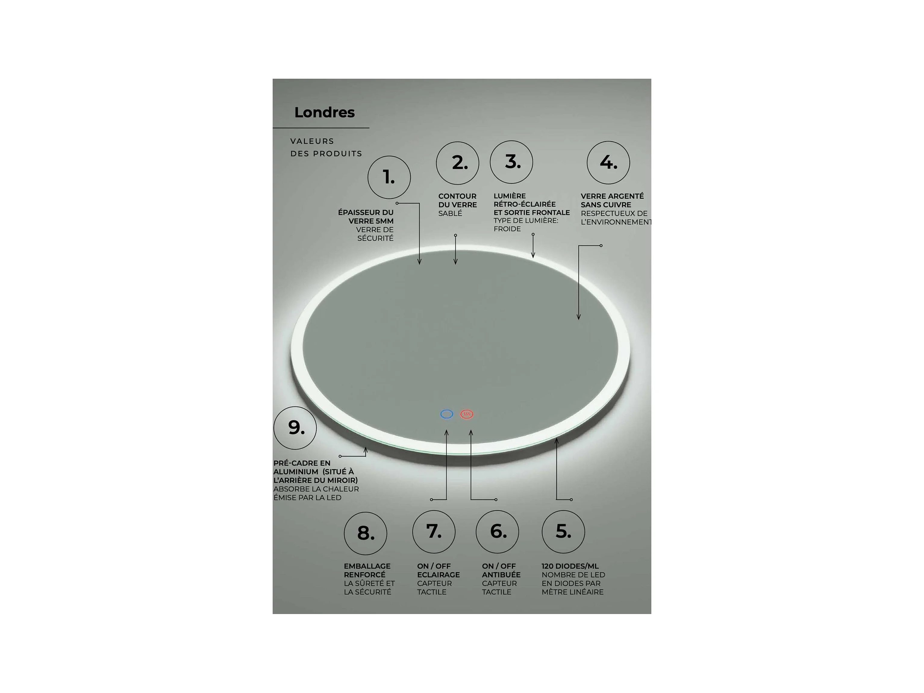 Miroir Salle de Bain LONDRES - Ø70 - Led Rétro-Éclairé (6500K) - Tactiles On/Off & Anti-Buée - LEDIMEX