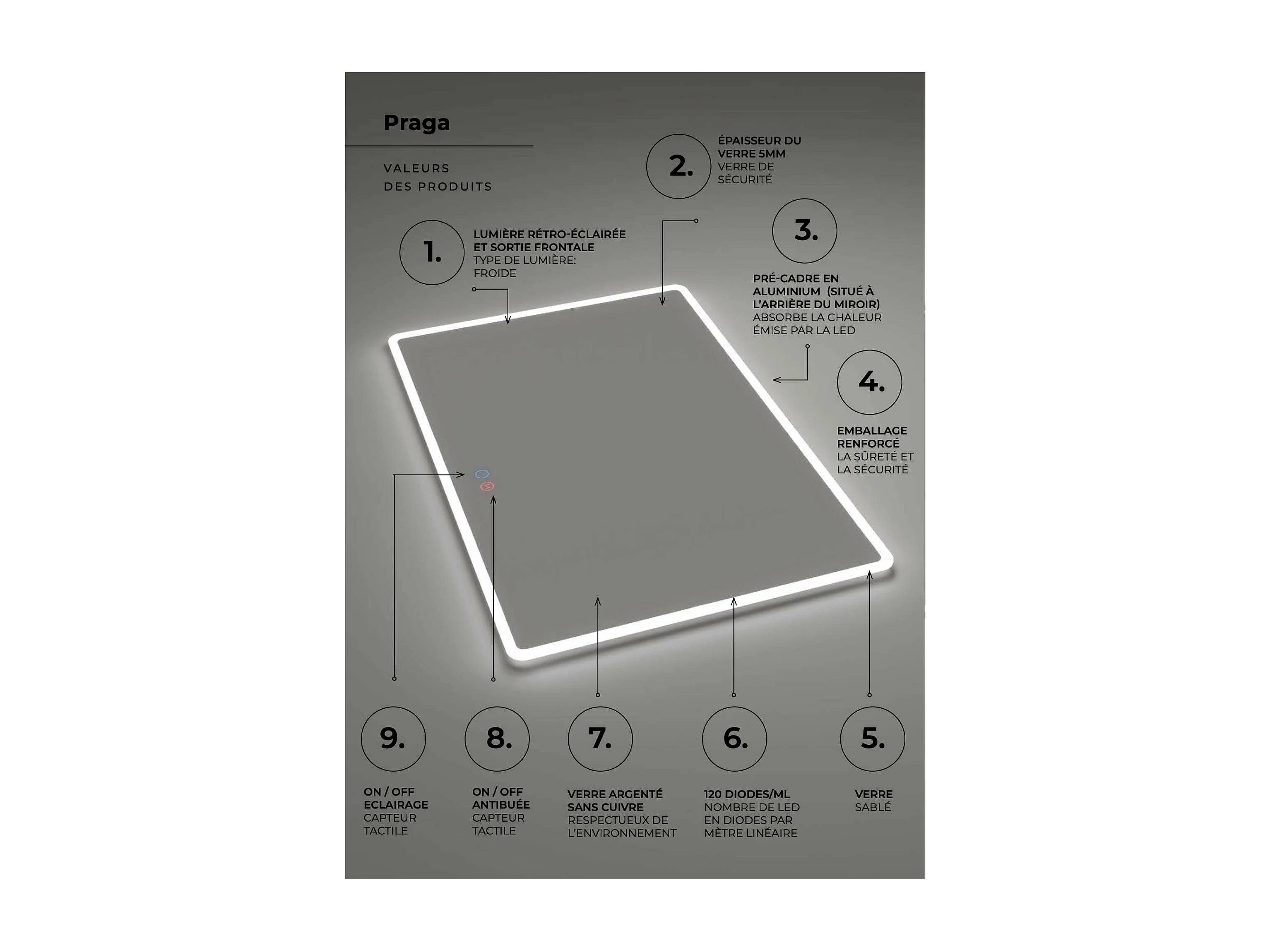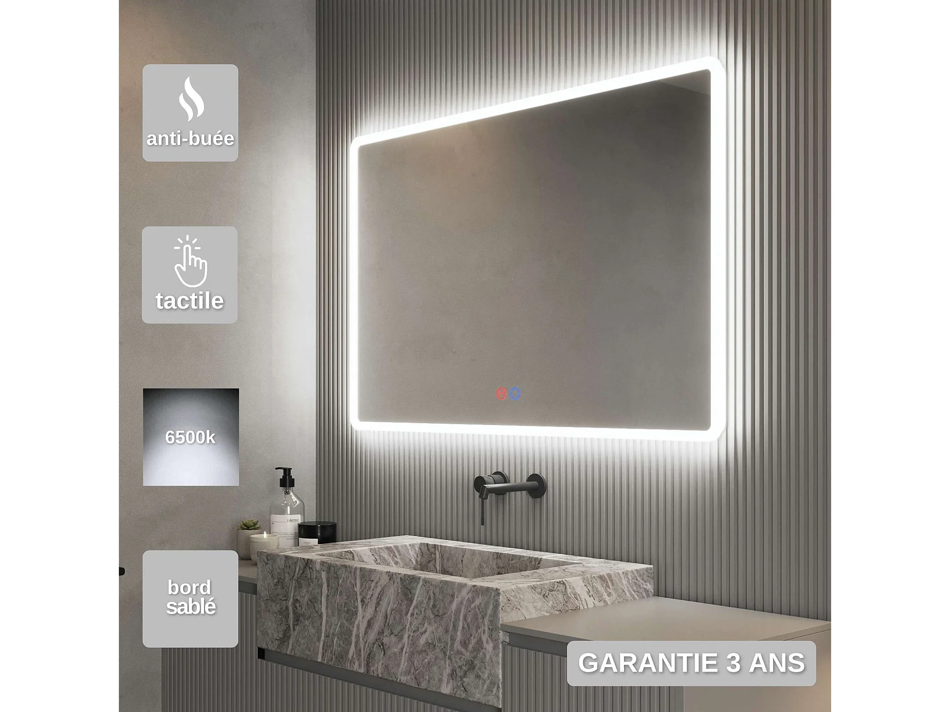 Miroir Salle de Bain PRAGA - 100x80cm - Led Rétro-éclairé & Diffusion Frontal - Tactiles On/Off & Anti-Buée - LEDIMEX