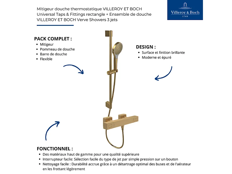 Mitigeur douche thermostatique VILLEROY ET BOCH Universal rectangle + Ensemble de douche Verve Showers 3 jets Or brossé