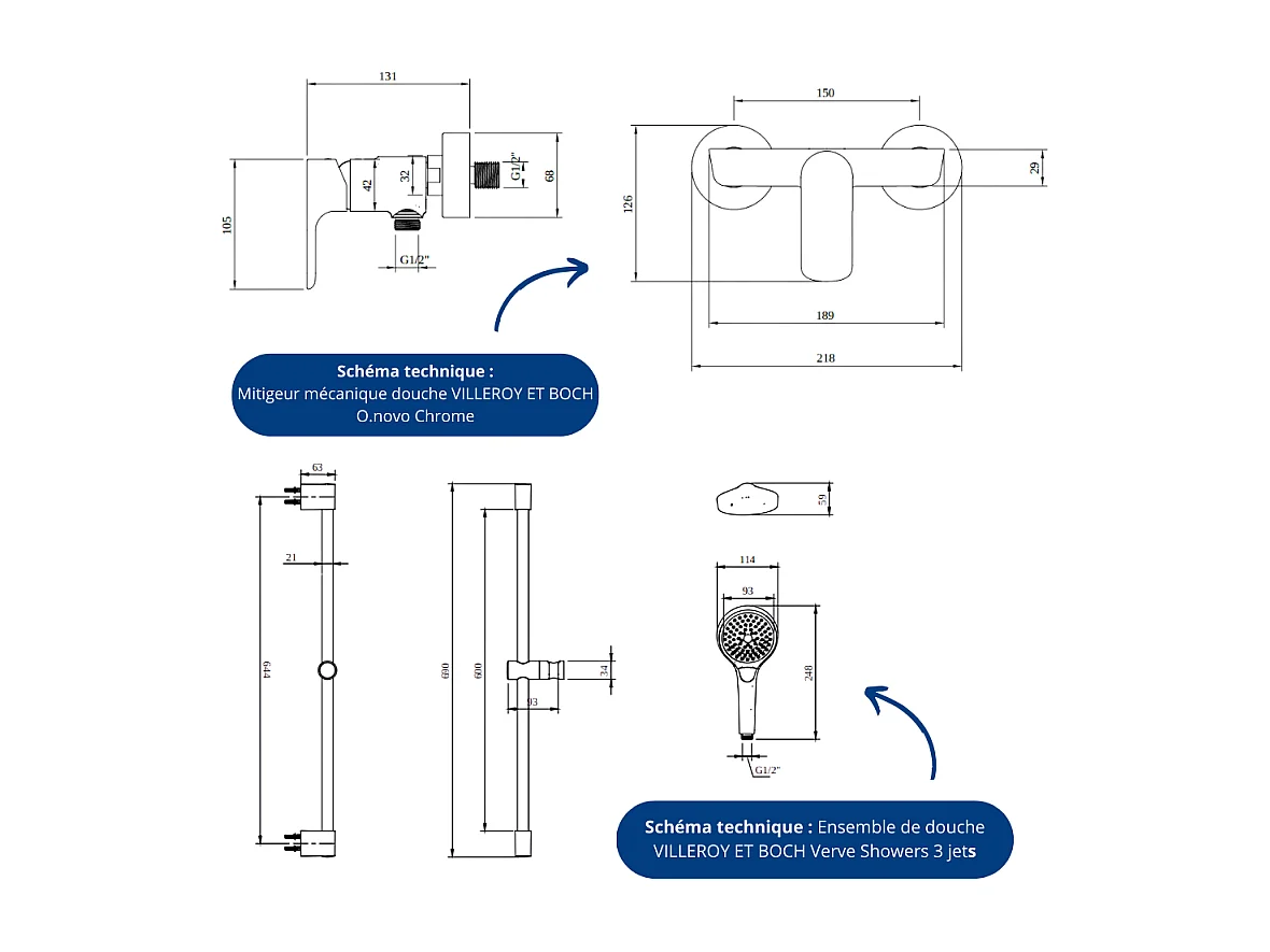 Mitigeur mécanique douche VILLEROY ET BOCH O.novo Chrome + Ensemble de douche VILLEROY ET BOCH Verve Showers 3 jets Chrome