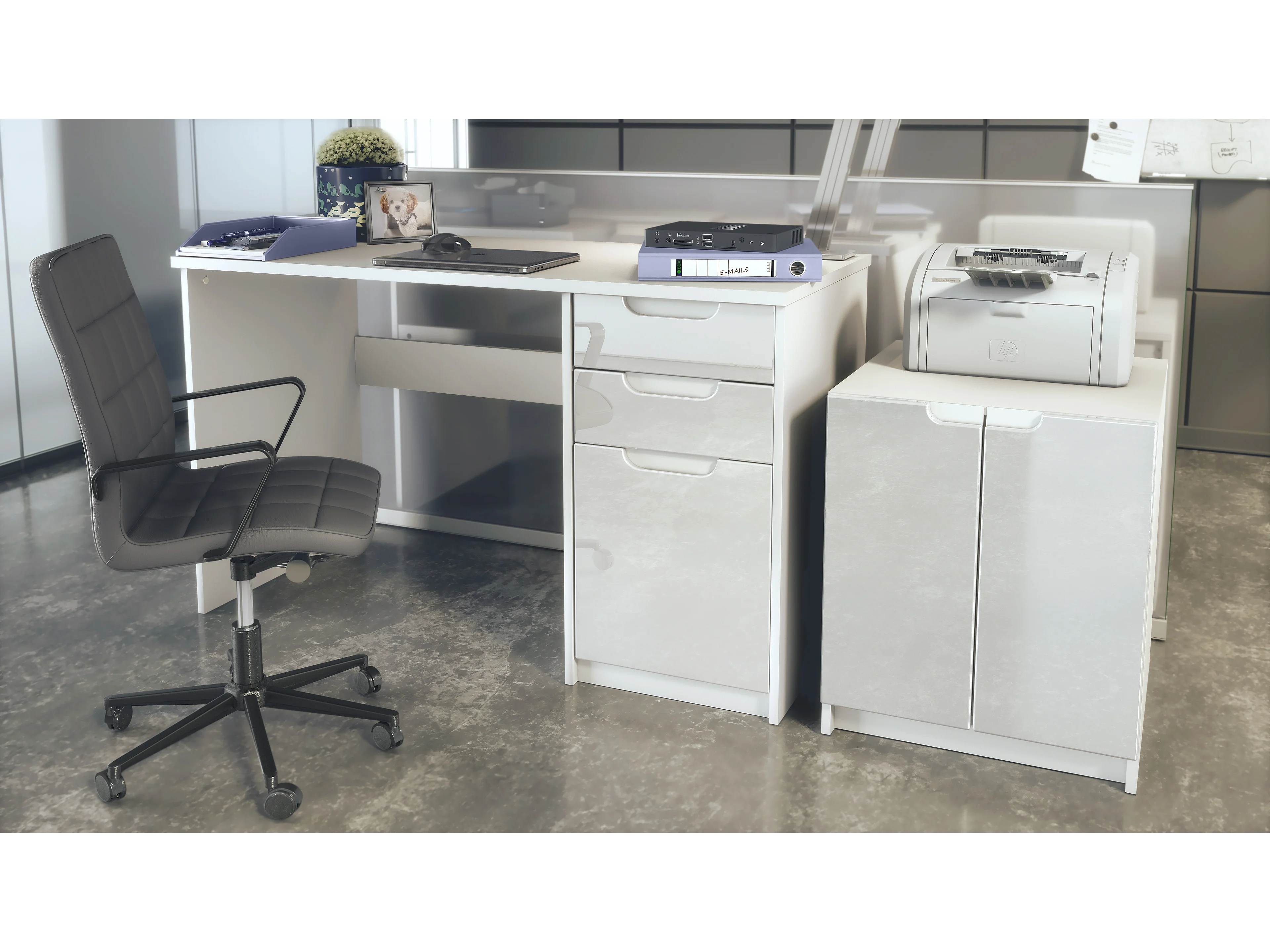 Mobilier de bureau ensemble bureau à domicile Paris, fabriqué en Allemagne avec meuble pour imprimante et bureau, blanc mat / blanc haute brillance