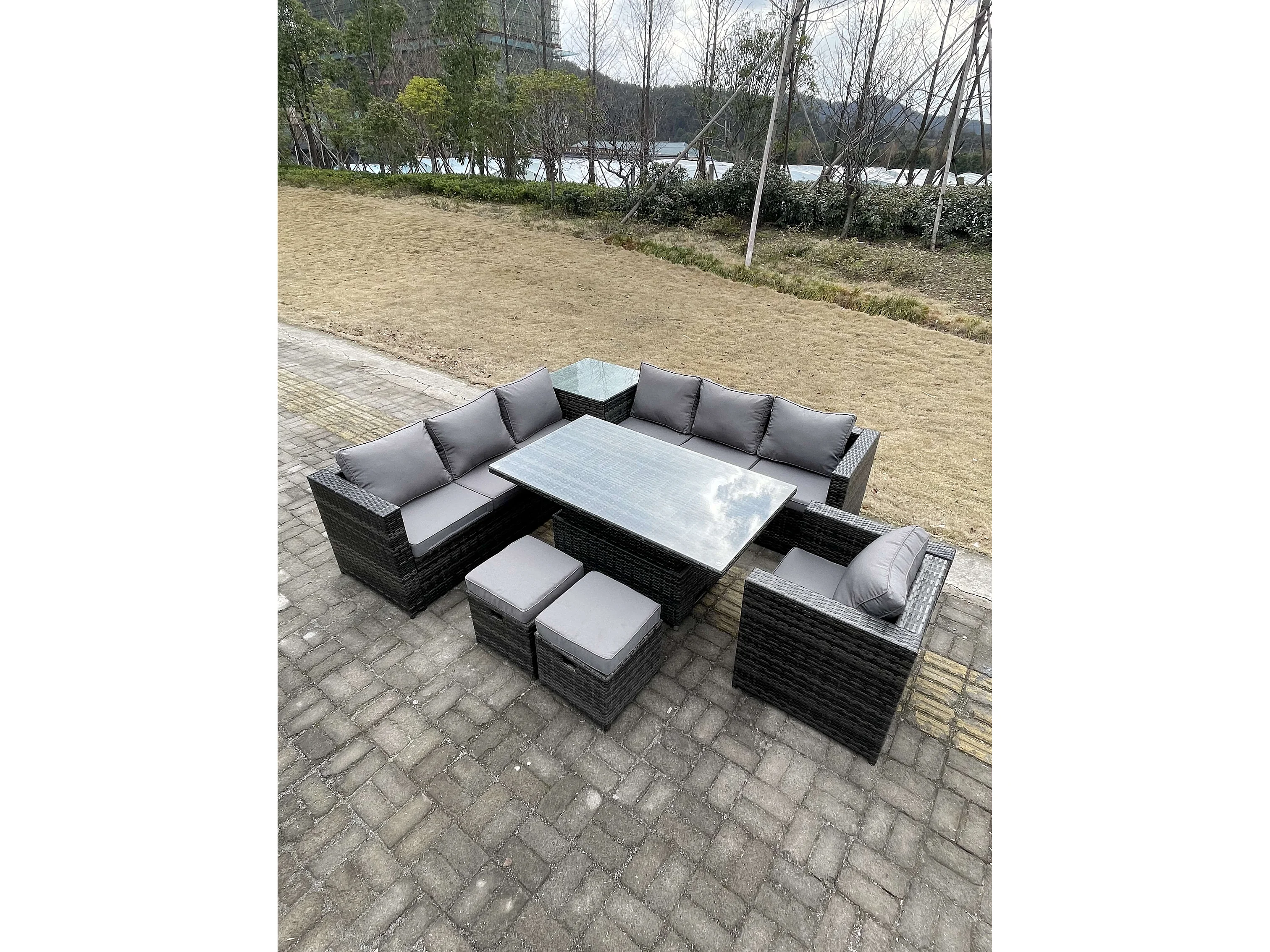 Mobilier de jardin extérieur PE Rotin 8 Places ave canapé Table à manger réglable en hauteur 2 Tabourets Mélange gris foncé
